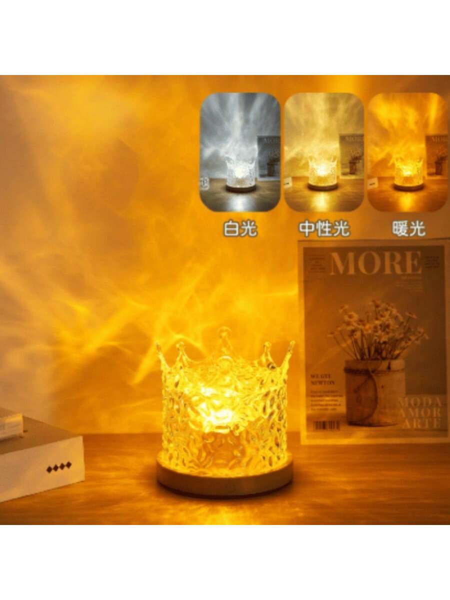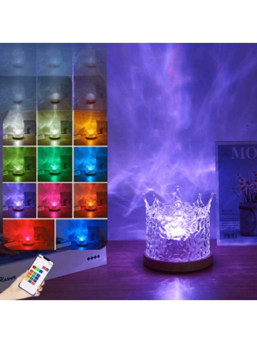 Proyector de ondas acuáticas en diseño circular 'Corona'. Efectos de movimiento fluidos con tres opciones de color y brillo regulable. Material plástico durable y enchufe integrado. Recomendada para terapias de sueño o decoración spa en baños.