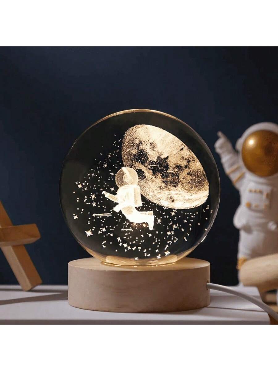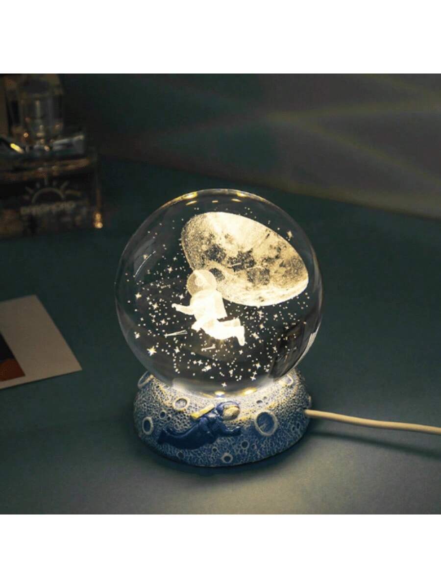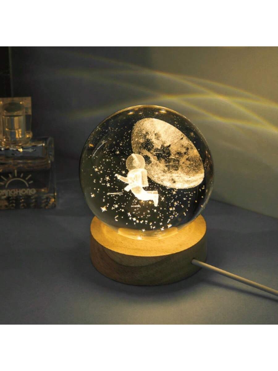Original diseño con efecto cracked glass" que proyecta patrones estelares en movimiento. Base giratoria automática para visualización 360°. Luz blanca pura con regulador de intensidad. Pieza artística para estudios o dormitorios modernos."