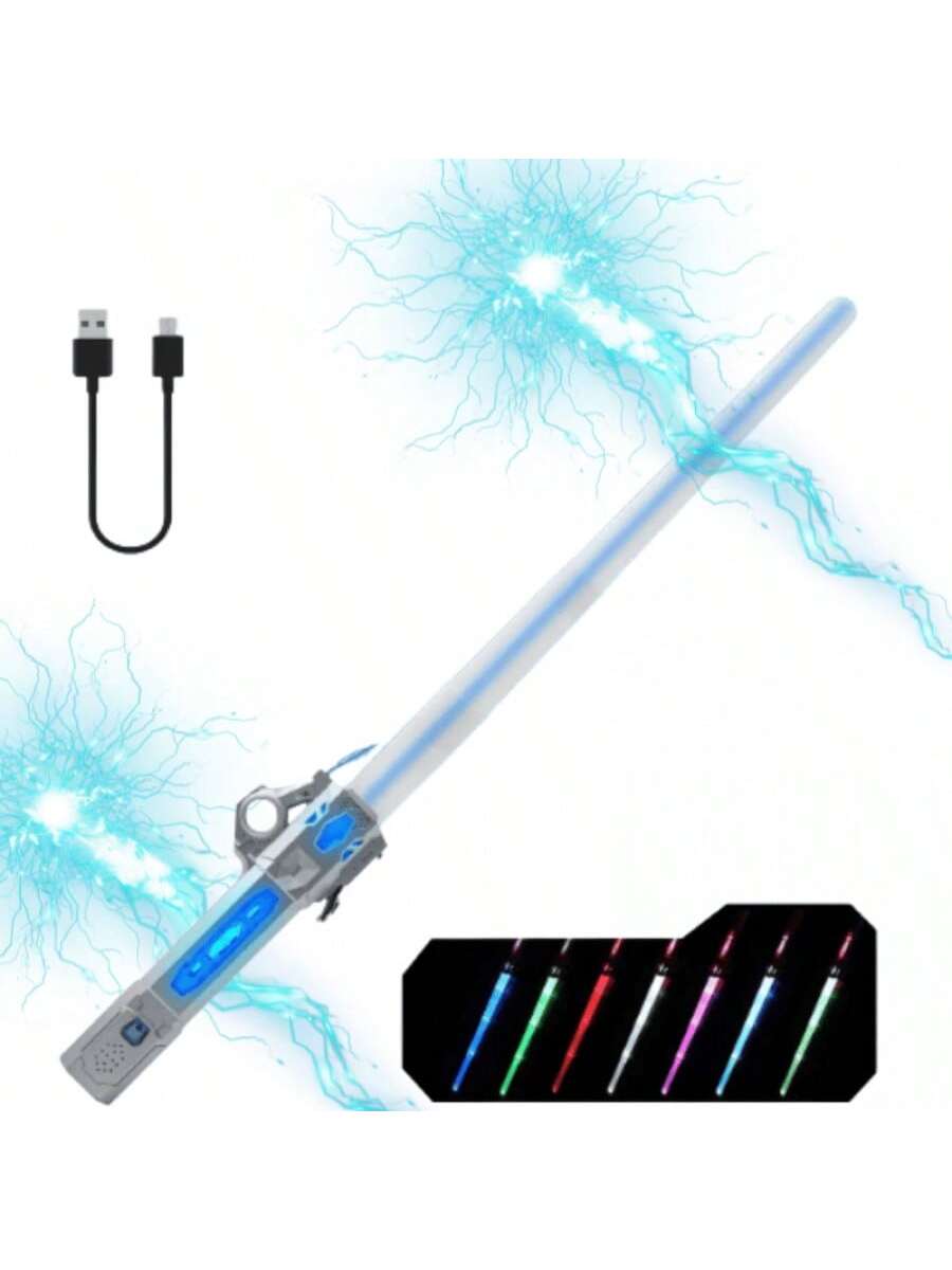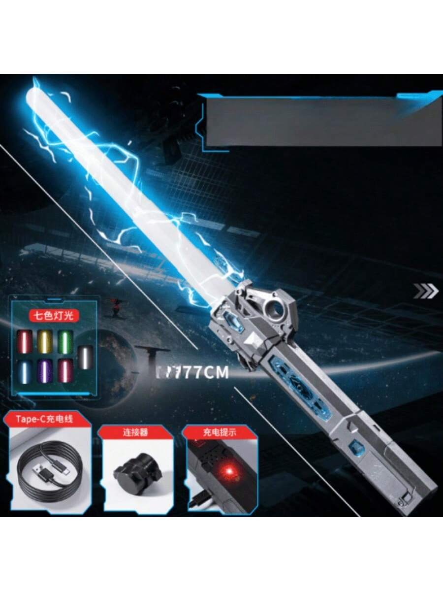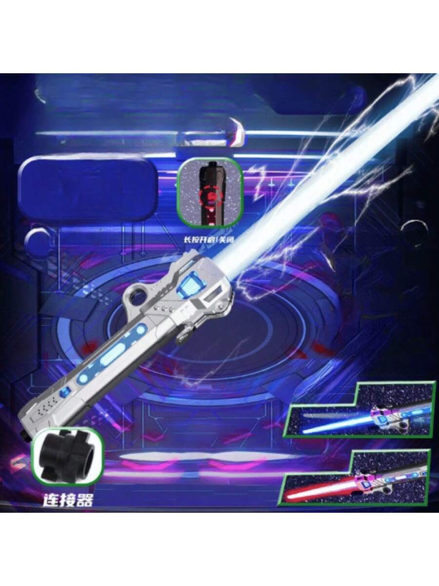 Sable de juguete retráctil con efecto de luz y sonido. Mango plateado metálico resistente. Hoja de plástico flexible seguro. Longitud extendida: 70cm. 3 modos de sonido diferentes. Ideal para juegos de rol y coleccionistas de temática espacial.