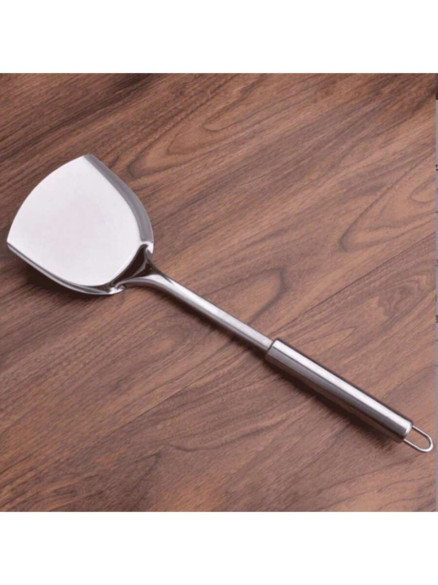 Espátula de cocina profesional con hoja ancha y mango redondo ergonómico. Ideal para saltear, mezclar y servir alimentos en woks o sartenes. Fabricada en acero inoxidable resistente al calor y fácil de limpiar. Perfecta para técnicas de cocina asiática y uso diario.