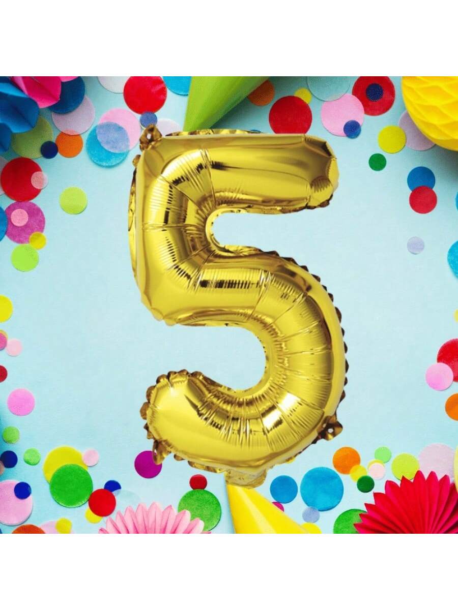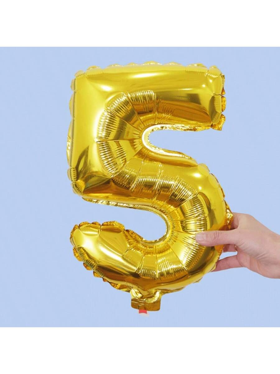 Globo metálico en forma de número 5, con acabado dorado brillante y tamaño de 16 pulgadas (40 cm aprox.). Ideal para decorar fiestas de cumpleaños, aniversarios o eventos elegantes. Inflable con helio o aire, incluye opción de cinta para colgar. Perfecto para celebraciones de quinto aniversario o temáticas doradas.