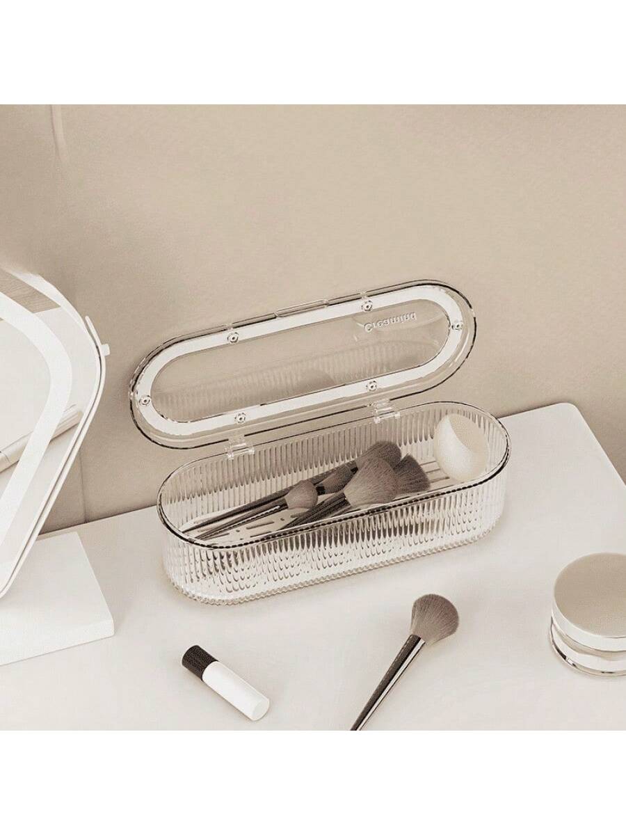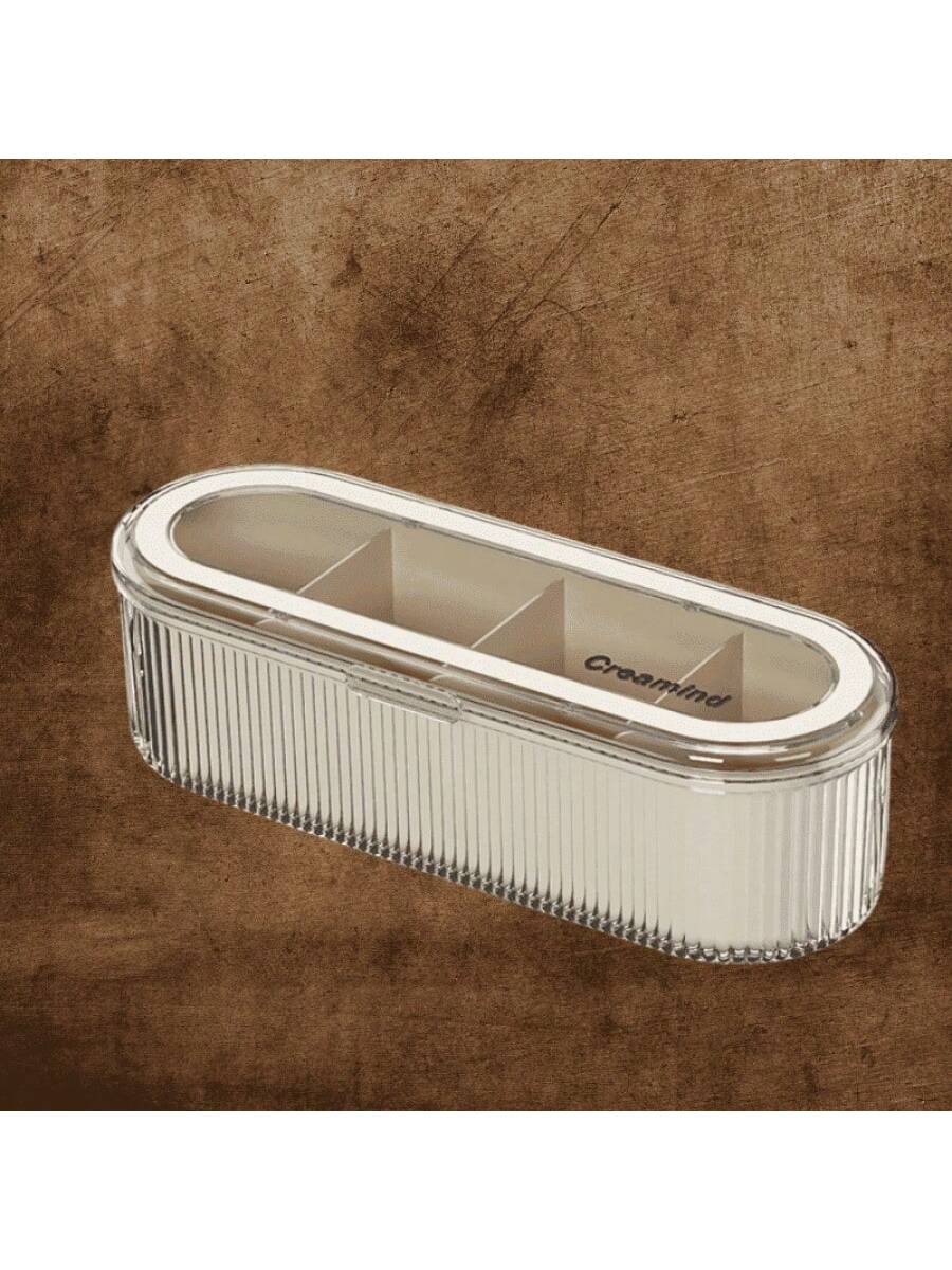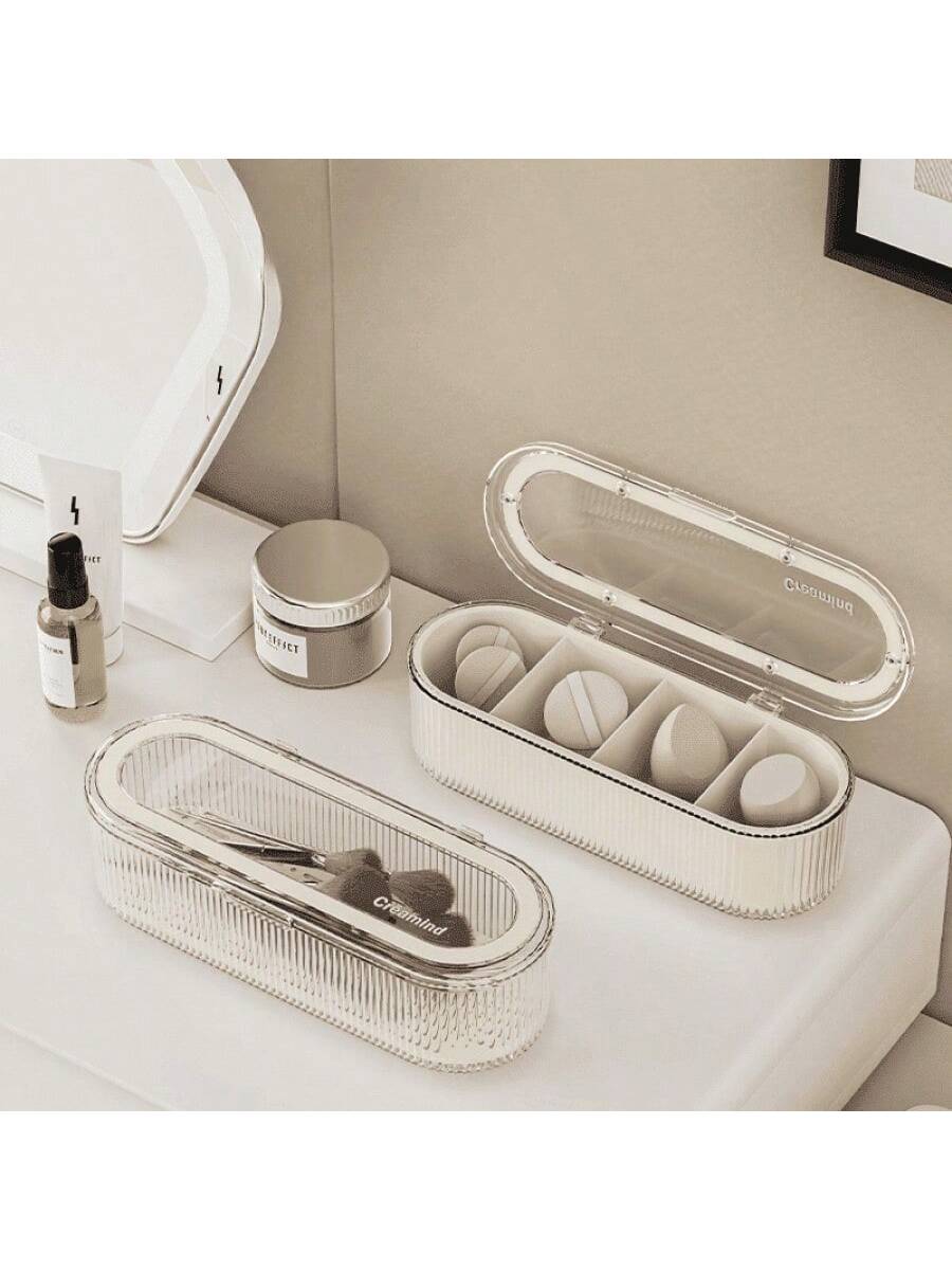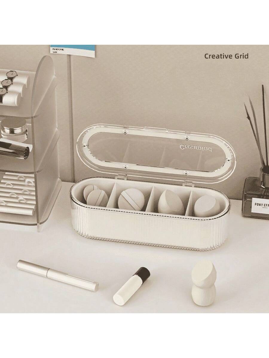 Organizador con cuatro compartimentos para guardar y proteger borlas de polvo.