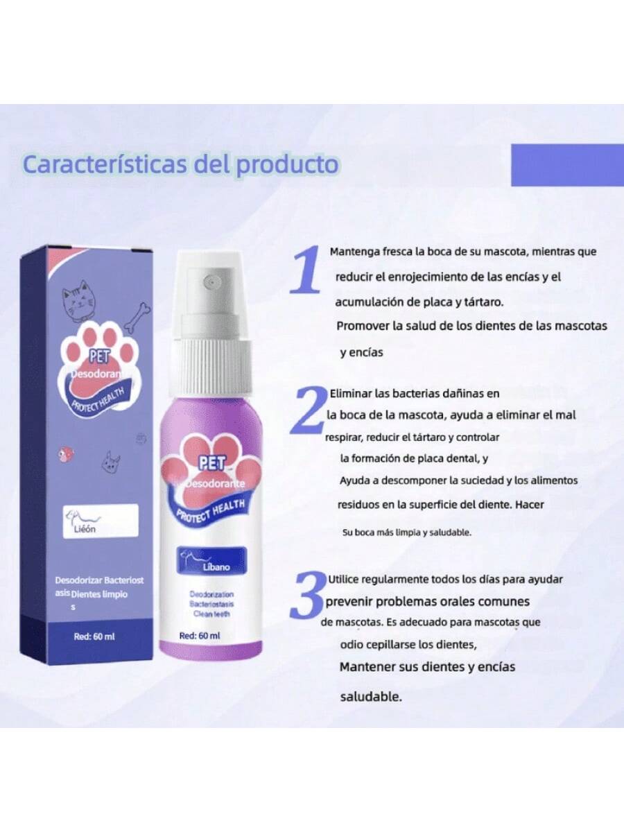 Solución práctica para mantener el aliento fresco de tus mascotas entre cepillados. Este spray bucal está formulado con ingredientes seguros que neutralizan las bacterias causantes del mal olor, ayudando a reducir la acumulación de sarro y baba. Su aplicación es rápida y sencilla: solo rocíe directamente en la boca de su perro o gato. La fórmula no tóxica es segura si es ingerida accidentalmente y ayuda a mantener una higiene bucal óptima. Ideal para usar después de las comidas o como parte de la rutina diaria de cuidado de tu mascota.