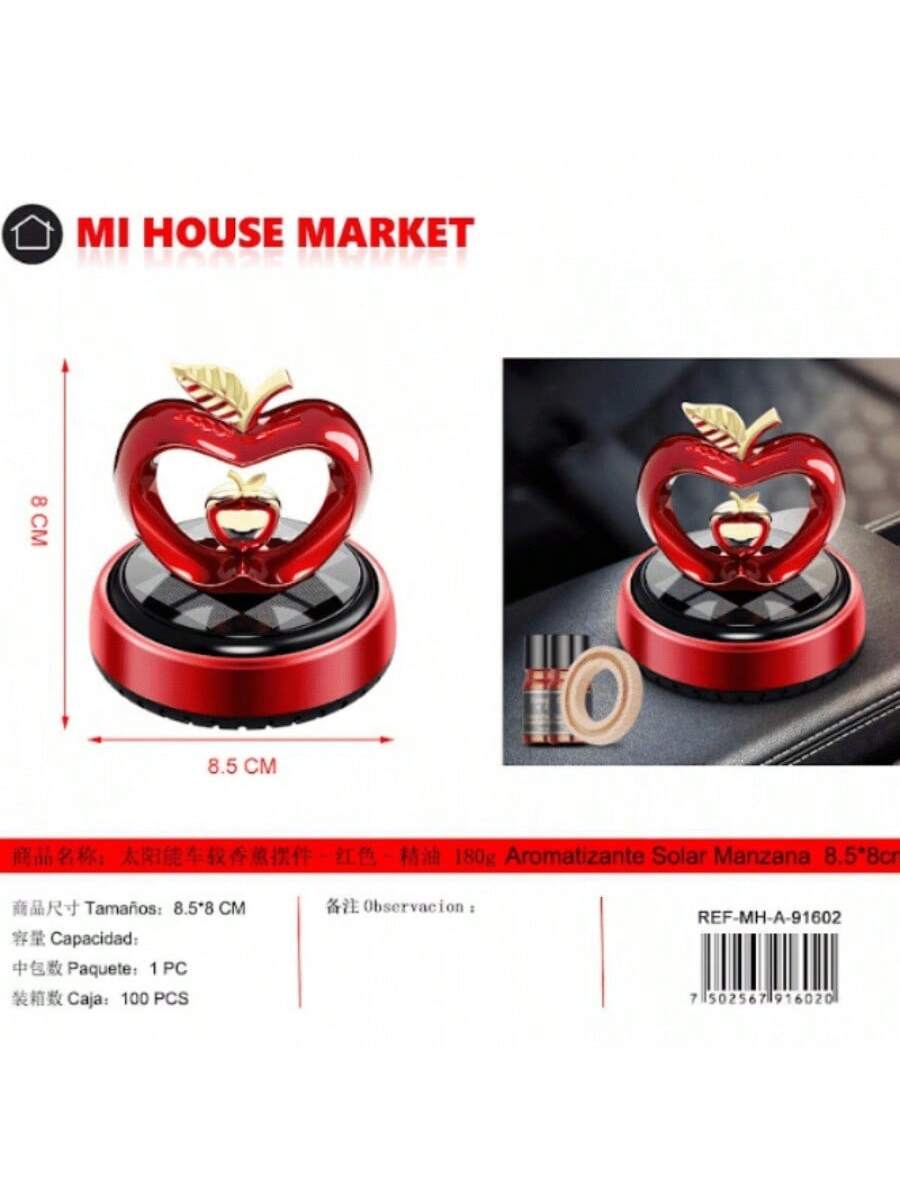Adorno para coche que combina energía solar con aromaterapia. En color rojo, incluye aceites esenciales para mantener el interior de tu vehículo con una fragancia agradable. Funciona con energía solar, no requiere baterías.