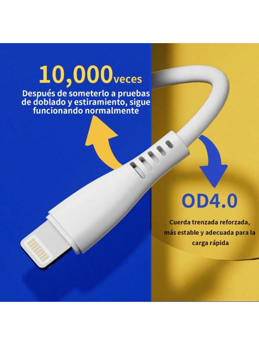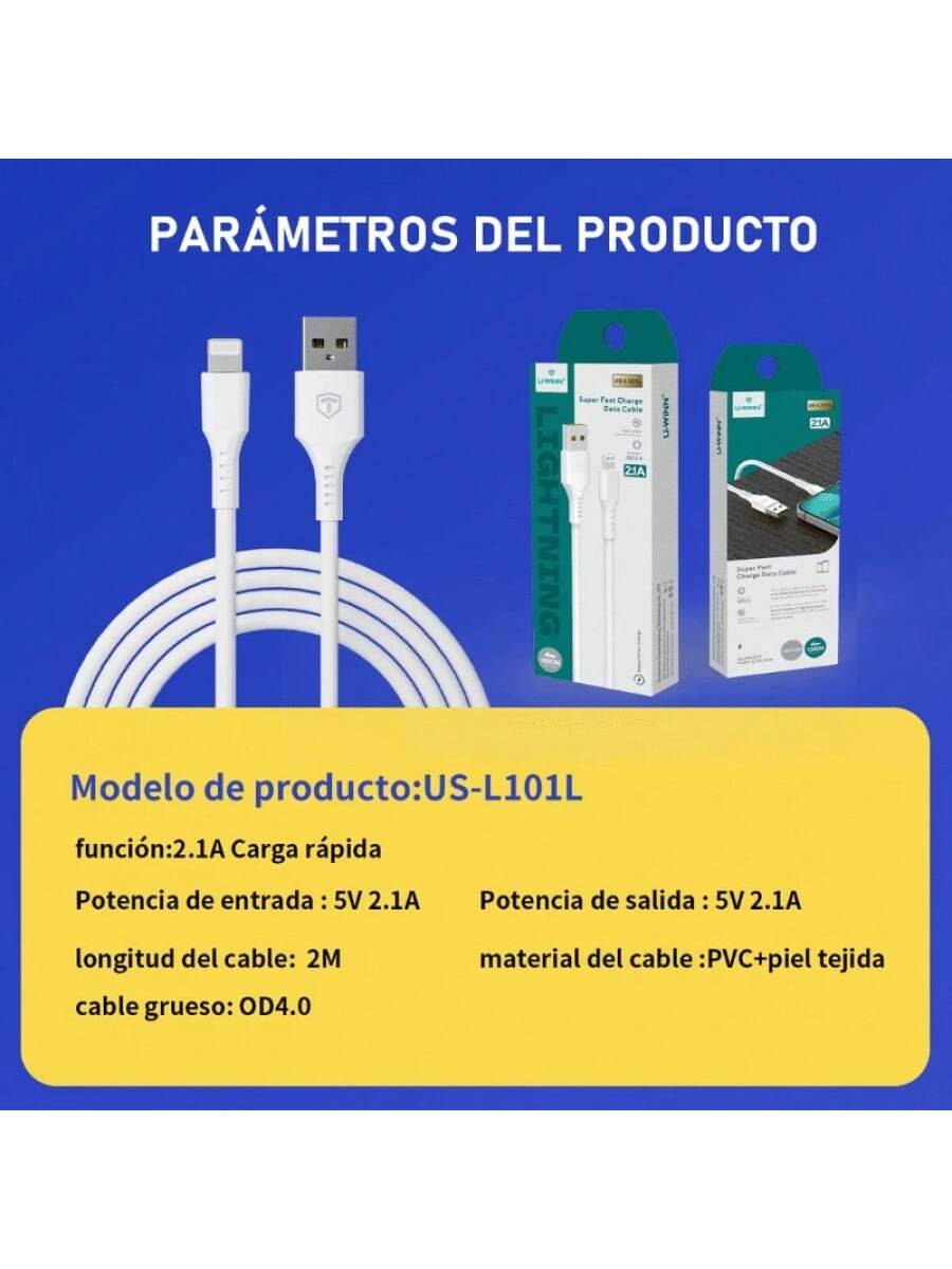 Este cable de tipo USB to Lightning soporta una potencia de carga de 2.1A. Sus 4 núcleos internos facilitan una velocidad de transferencia de datos de 480 Mbps. Con 1 metro de longitud y material PVC, ofrece compatibilidad y funcionalidad.