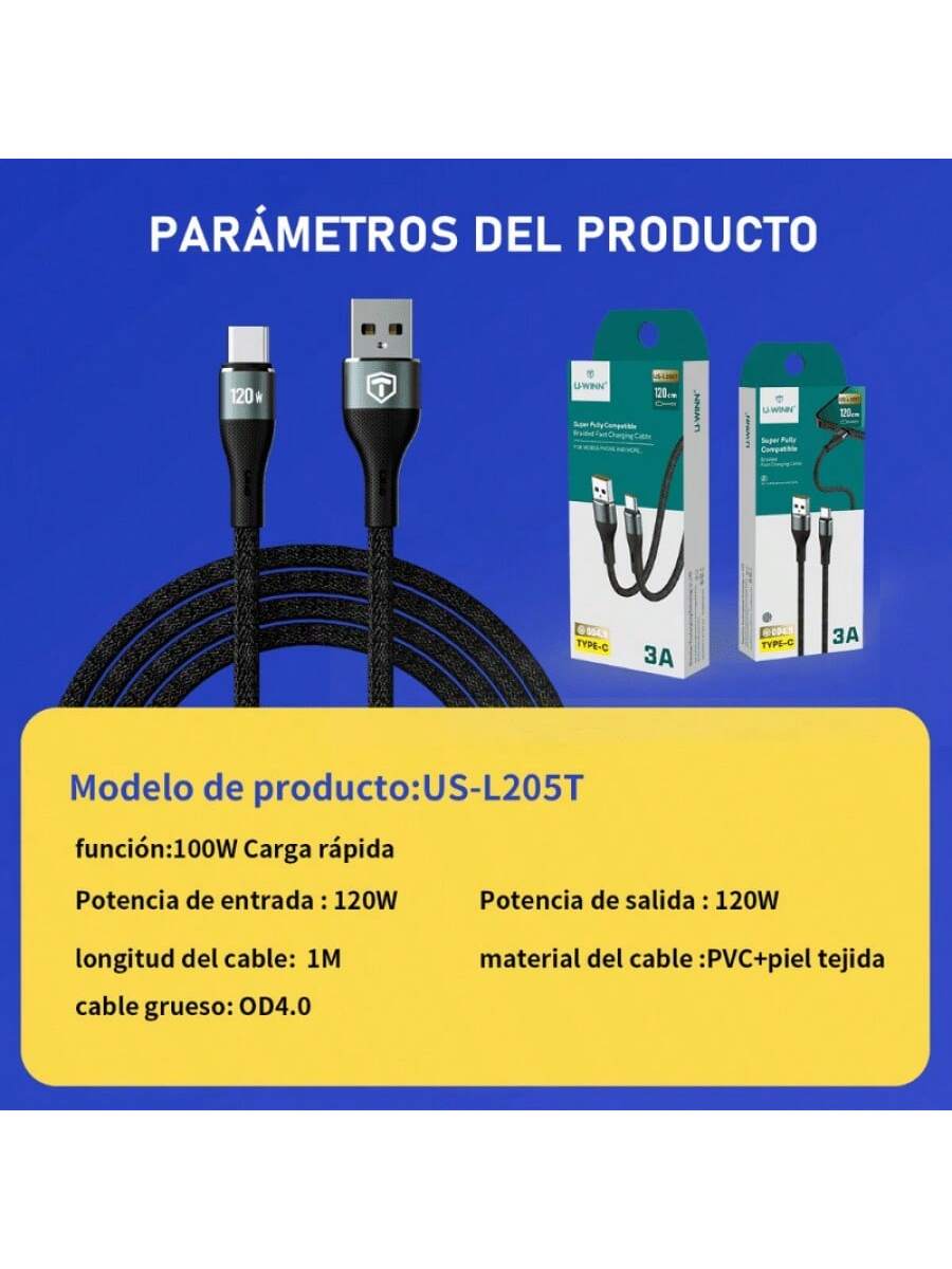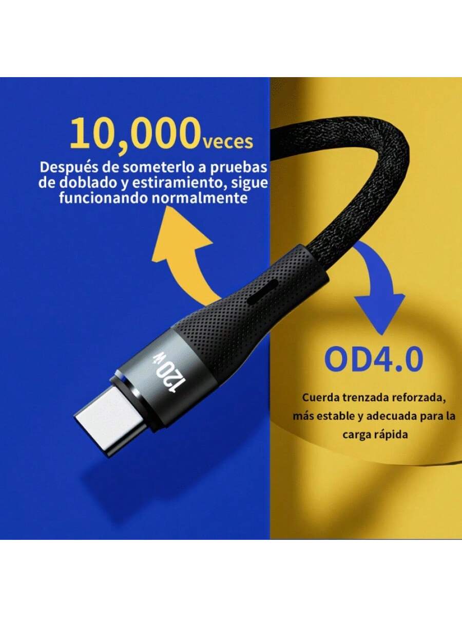 Cable de tipo USB to Tipo C con una potencia de carga de 3A. Cuenta con 4 núcleos internos y velocidad de transferencia de 480 Mbps. De 1 metro de largo y material PVC+Nailon Trenzado, está hecho para un uso exigente.