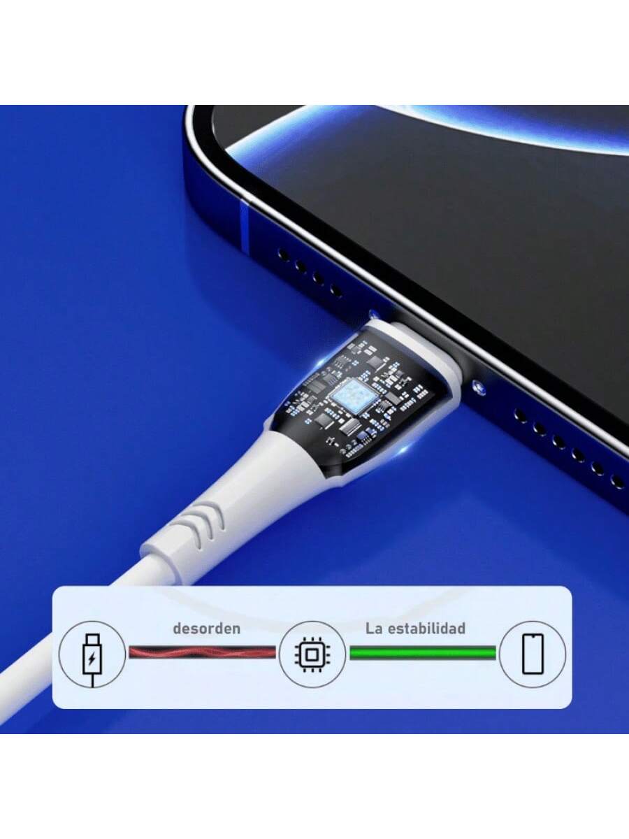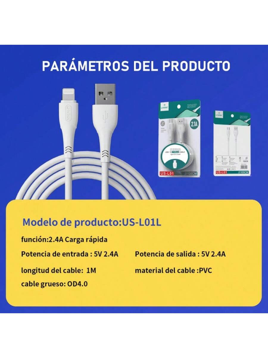 Cable de tipo USB to Lightning que soporta una potencia de carga de 2.4A. Integra 4 núcleos internos para transferencias de datos de 480 Mbps. Con 1 metro de largo y material PVC, es un accesorio funcional y confiable.