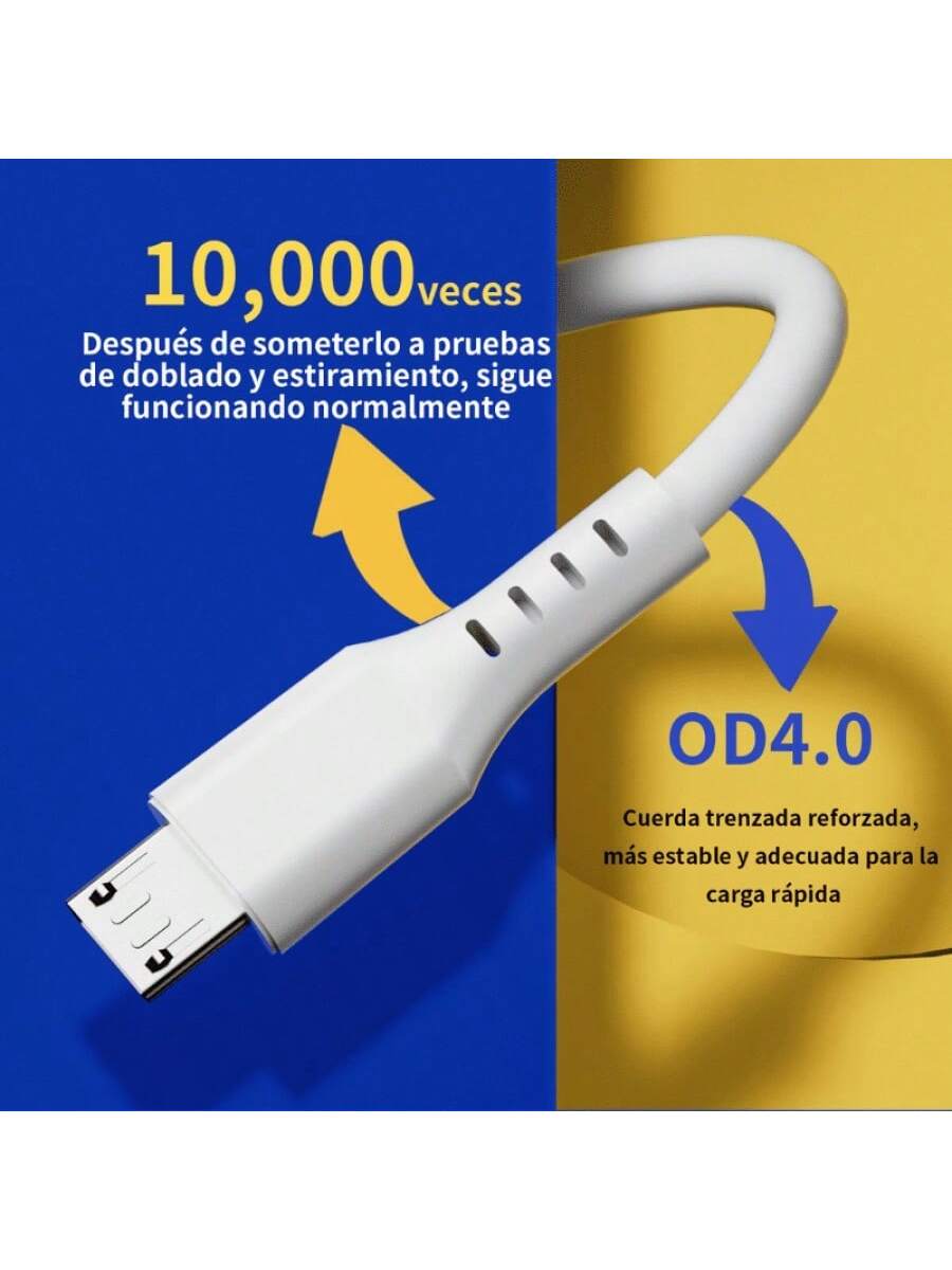 Cable de tipo Micro USB diseñado para una potencia de carga de 2.1A. Cuenta con 4 núcleos internos que permiten una transferencia de datos de hasta 480 Mbps. Con una longitud práctica de 1 metro y fabricado en material PVC, es ideal para un uso diario confiable.