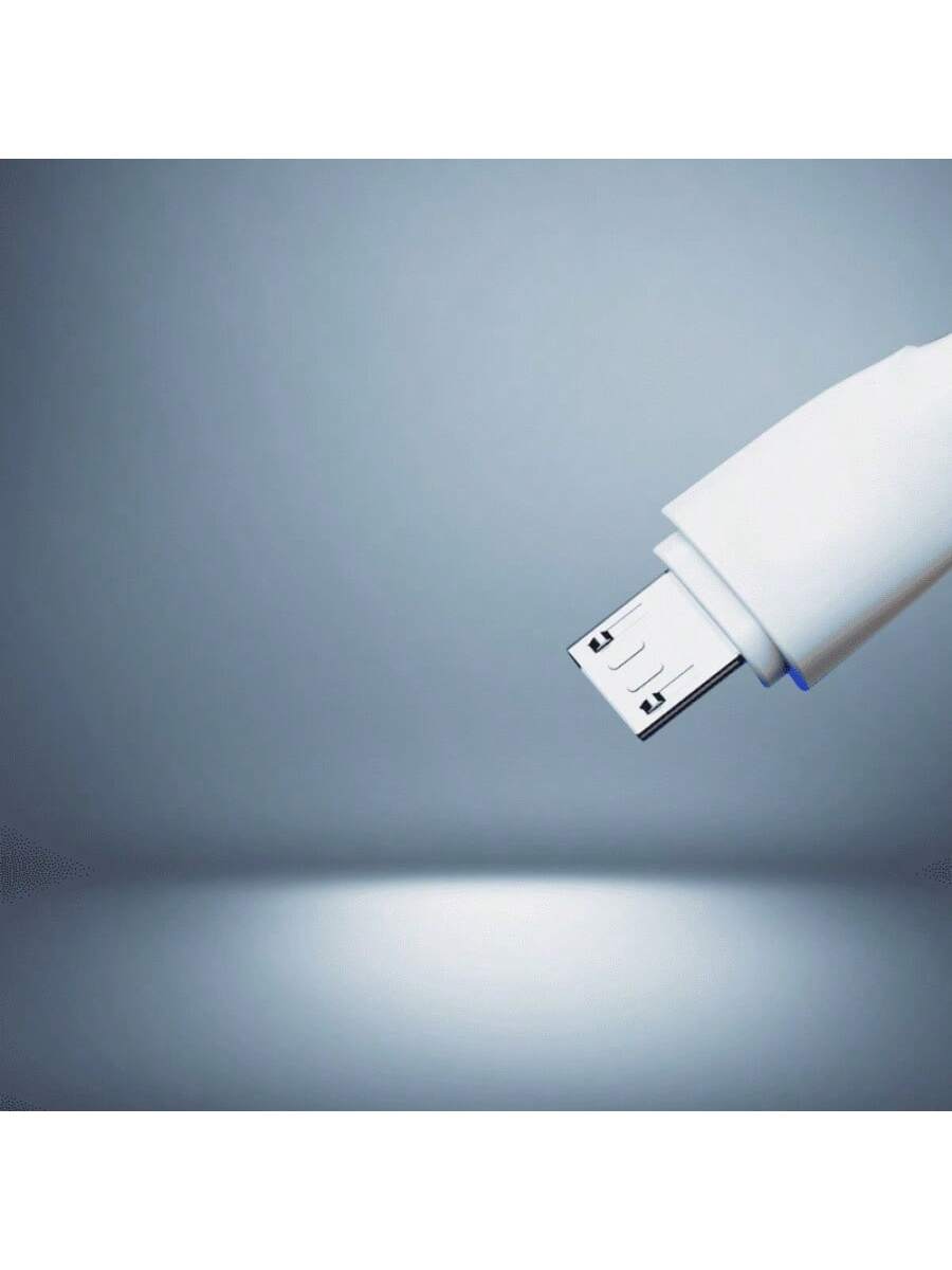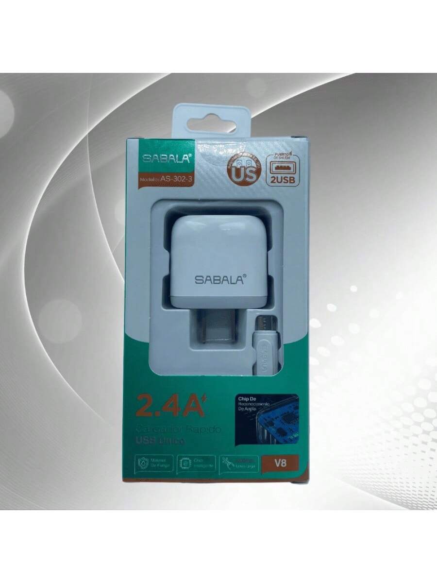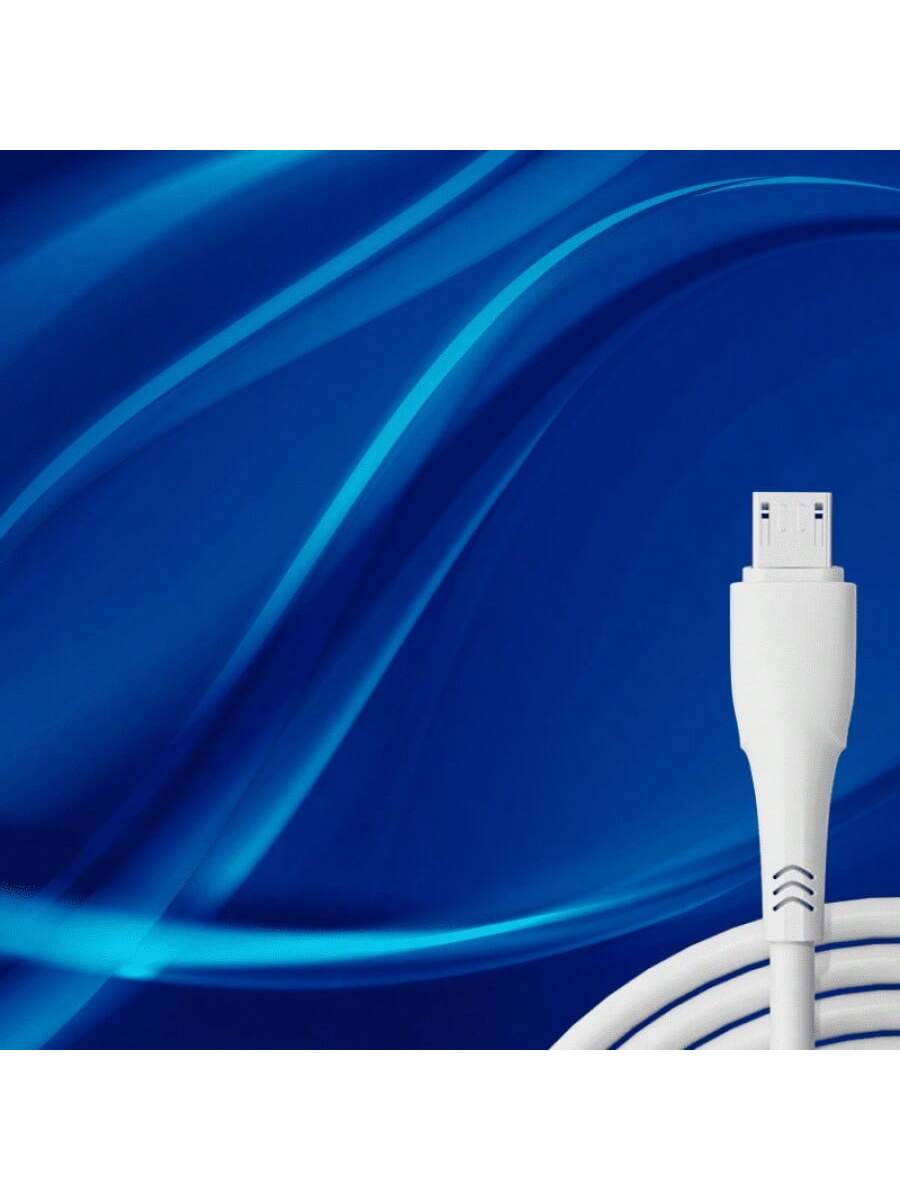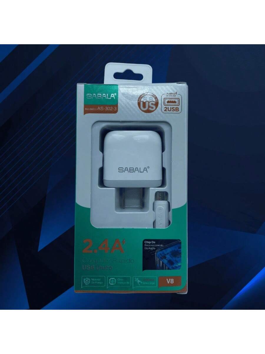 Cabezal de carga con cable V8 de 15W y doble entrada USB en color blanco. Ofrece una solución completa para cargar múltiples dispositivos con eficiencia y un diseño organizado.