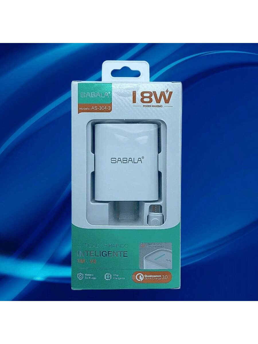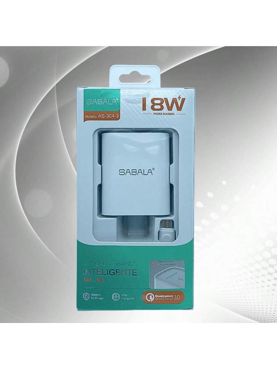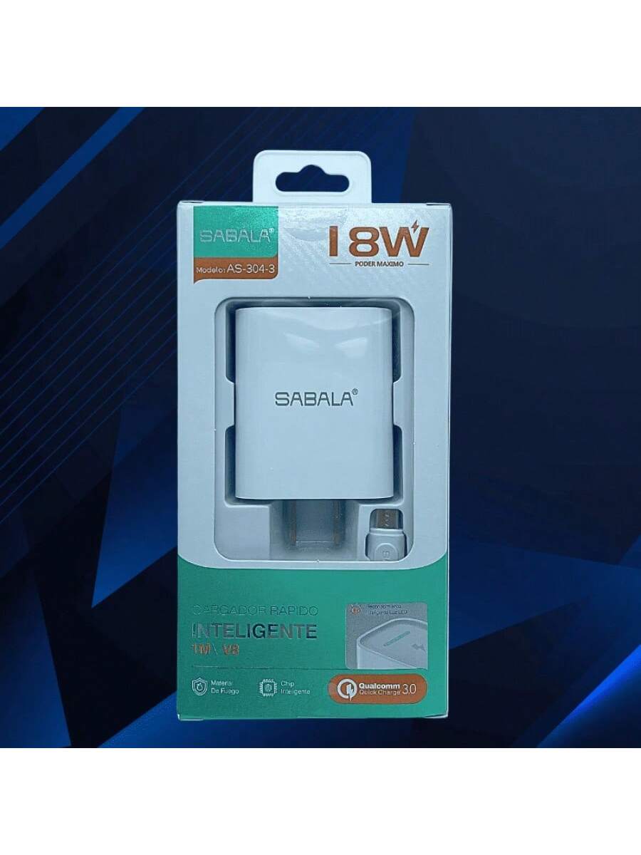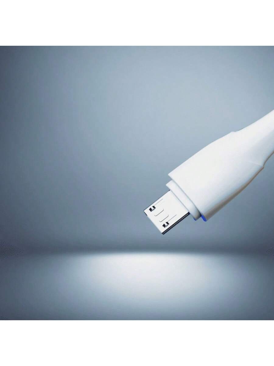 Cabezal de carga con cable V8 de 18W en blanco. Ofrece un rendimiento equilibrado y confiable para la carga de dispositivos, con un diseño específico que busca eficiencia y durabilidad.