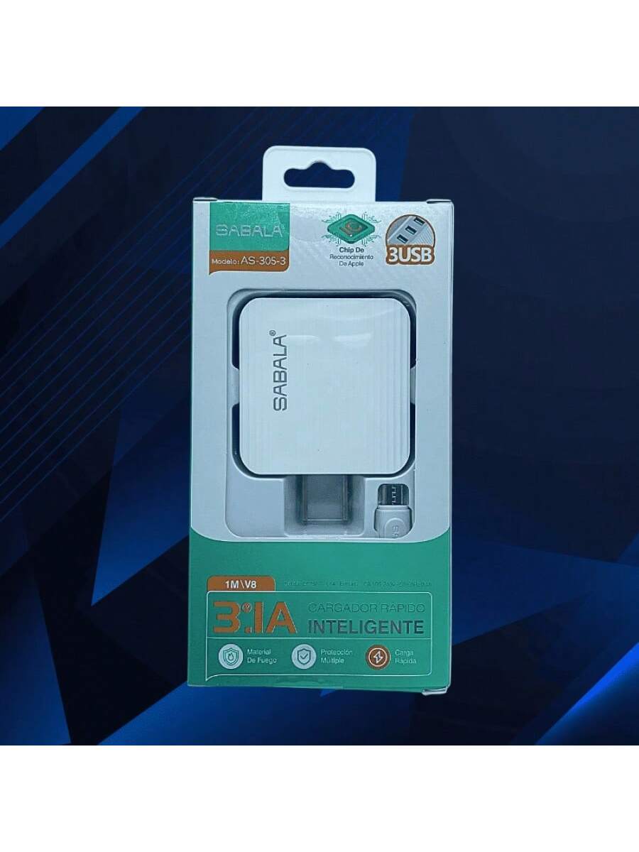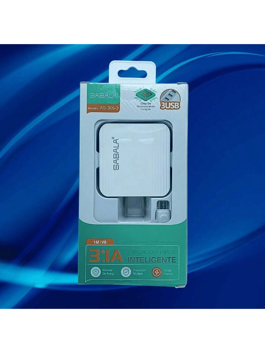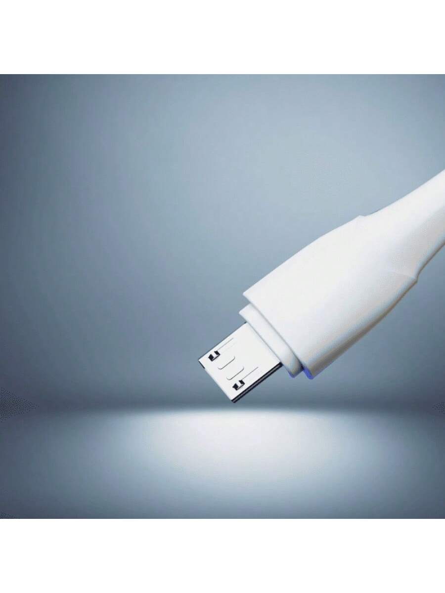 Cabezal de carga con cable V8 de 15W en blanco. Diseñado para proporcionar una carga estable y confiable con un formato específico que busca satisfacer necesidades básicas de energía.
