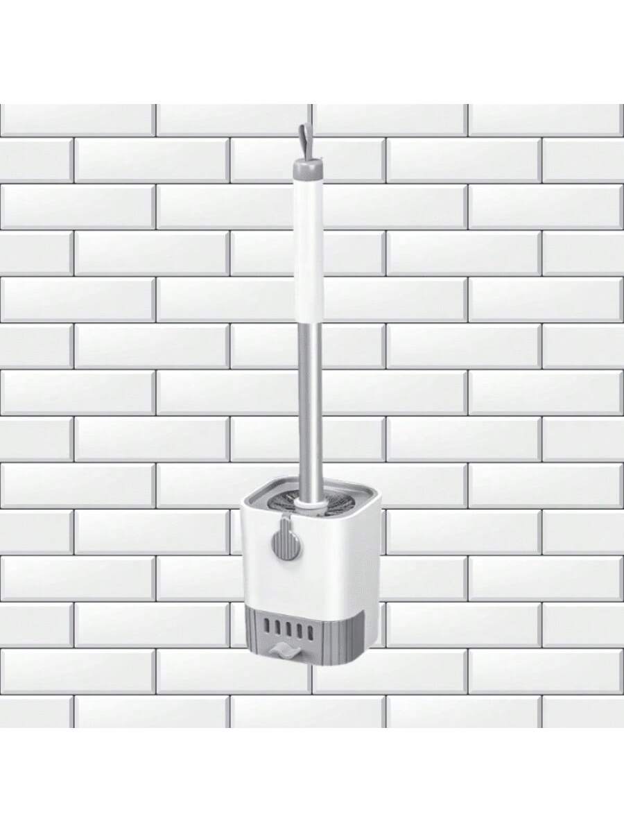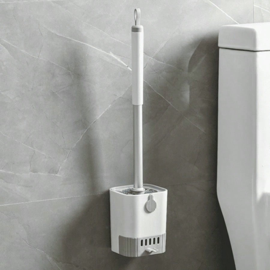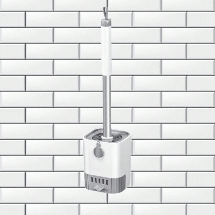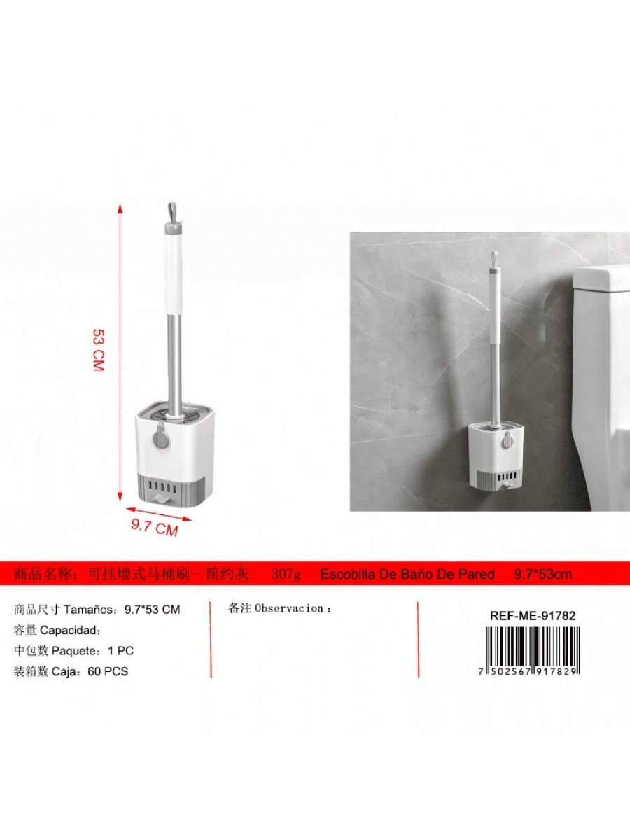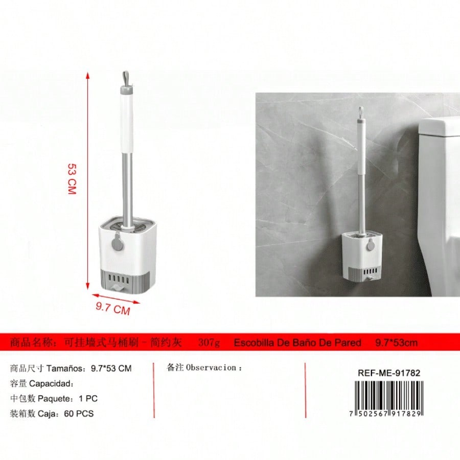 Escobilla para baño color gris con sistema de montaje en pared. Diseño simple que incluye caja para presentación, mantiene el área del baño seca y limpia de manera ordenada y accesible.