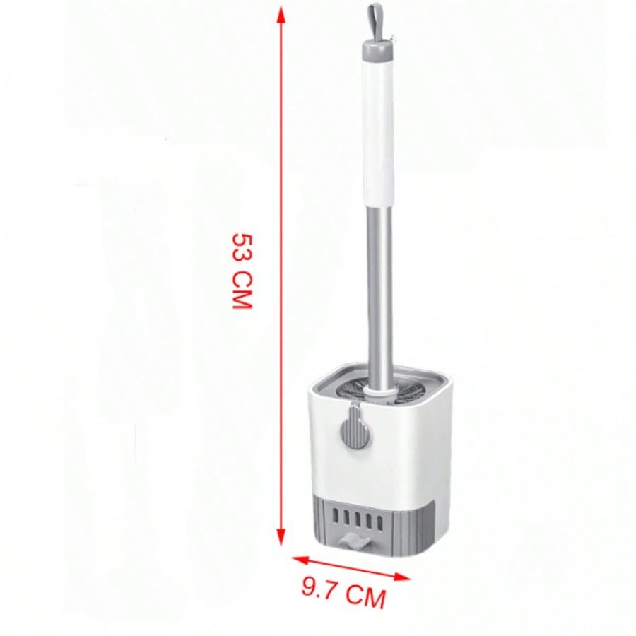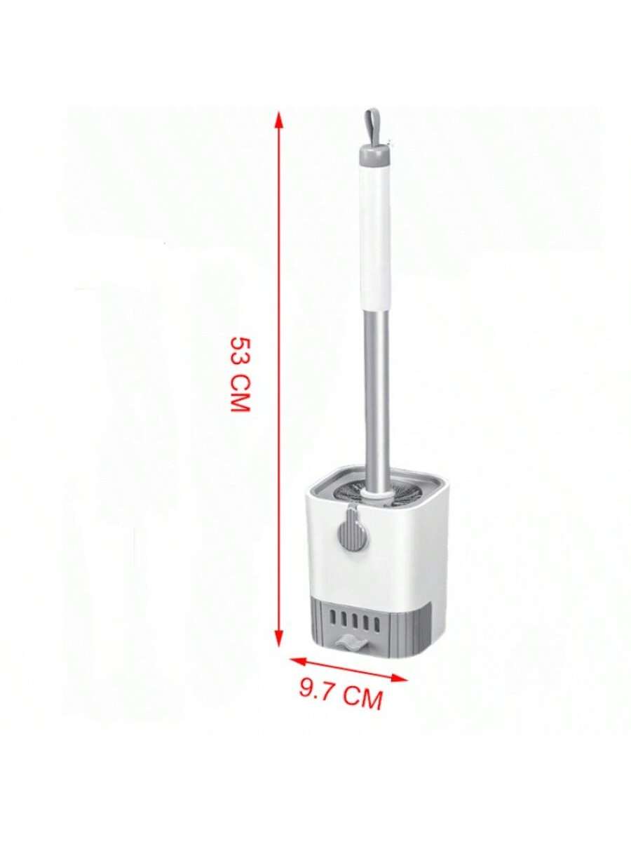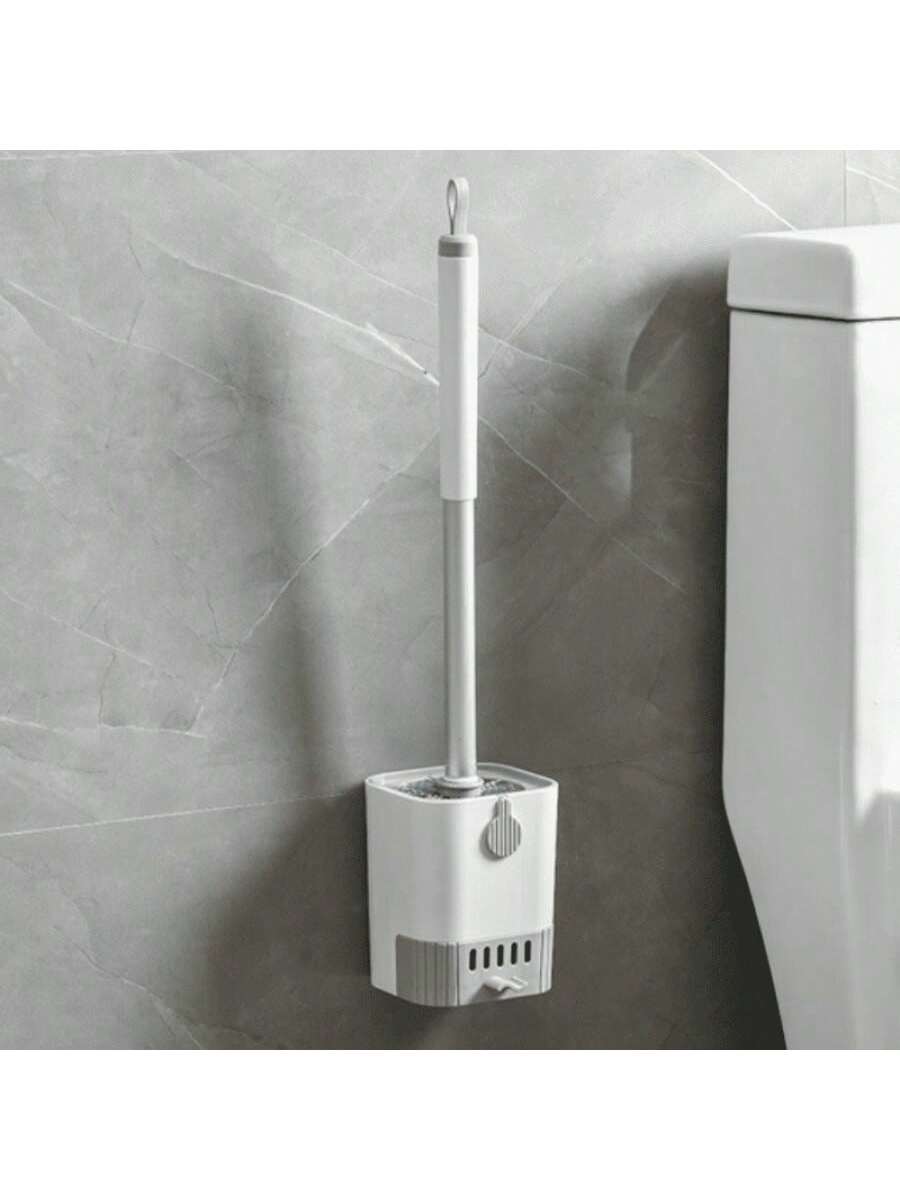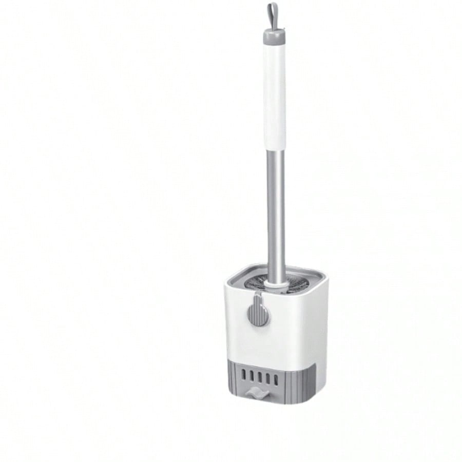 Escobilla para baño color gris con sistema de montaje en pared. Diseño simple que incluye caja para presentación, mantiene el área del baño seca y limpia de manera ordenada y accesible.