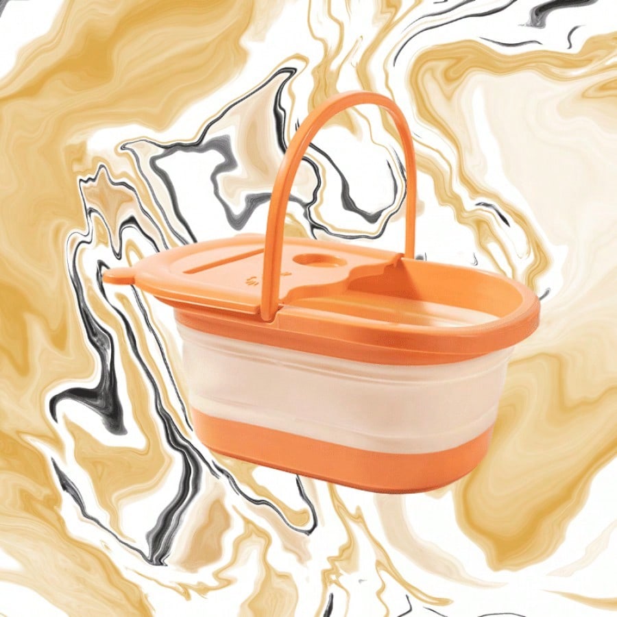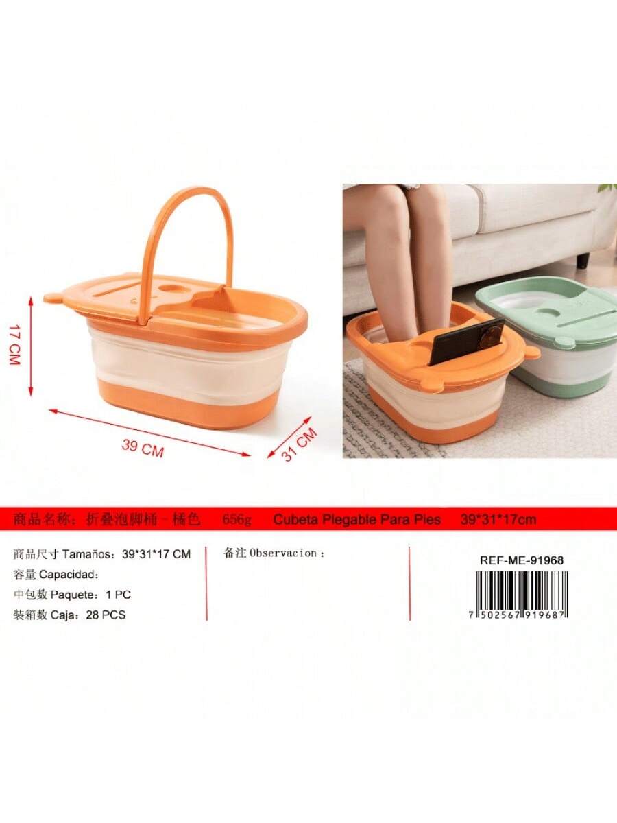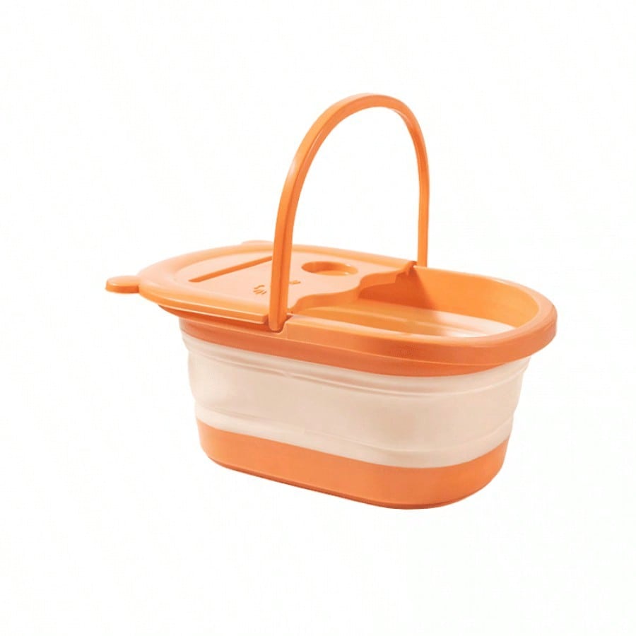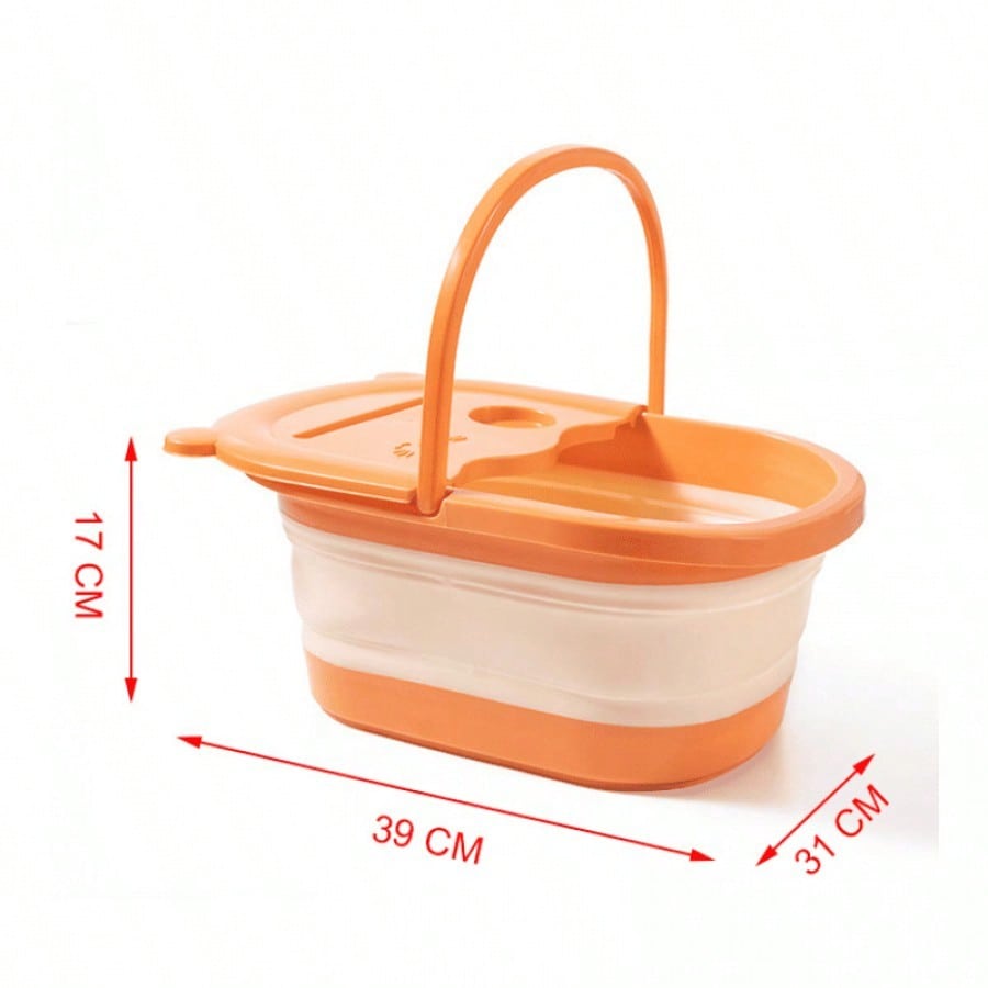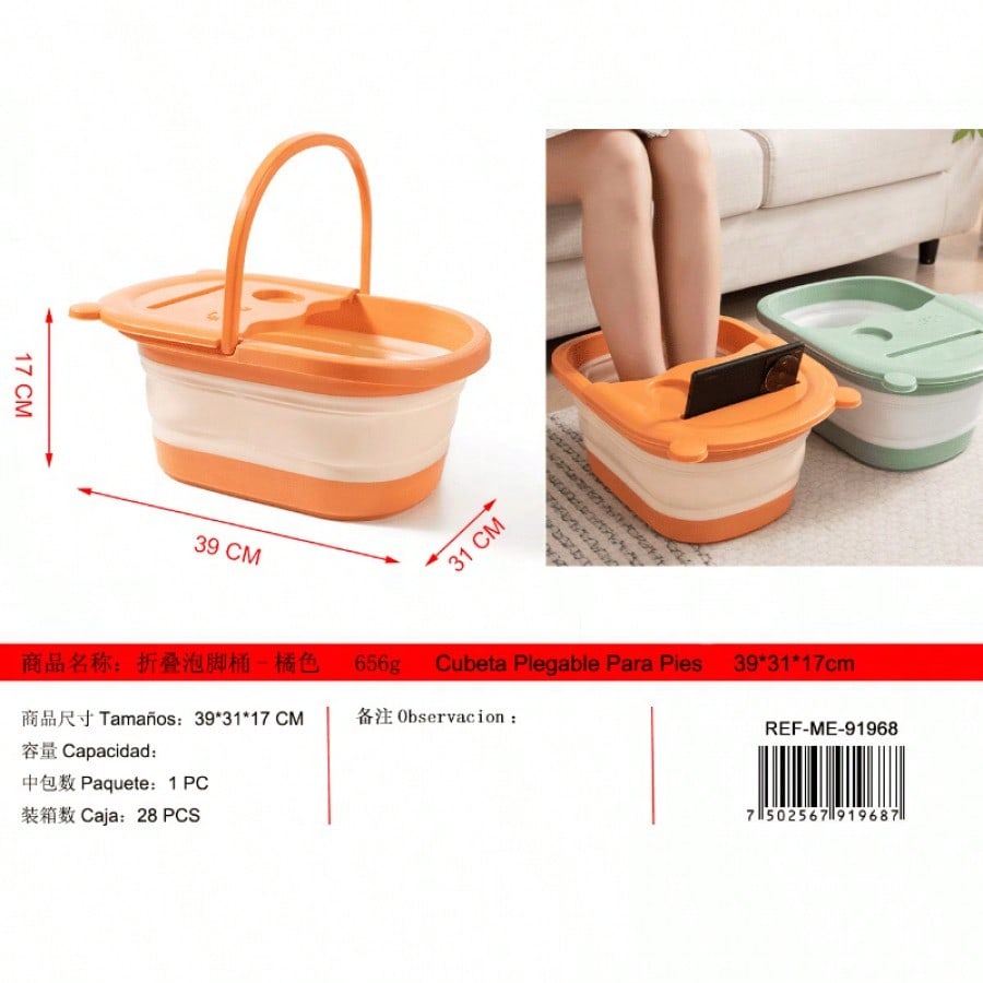 Cube plegable naranja para baño de pies. Diseño compacto que ahorra espacio cuando no se usa. Material duradero ideal para relajación podal.