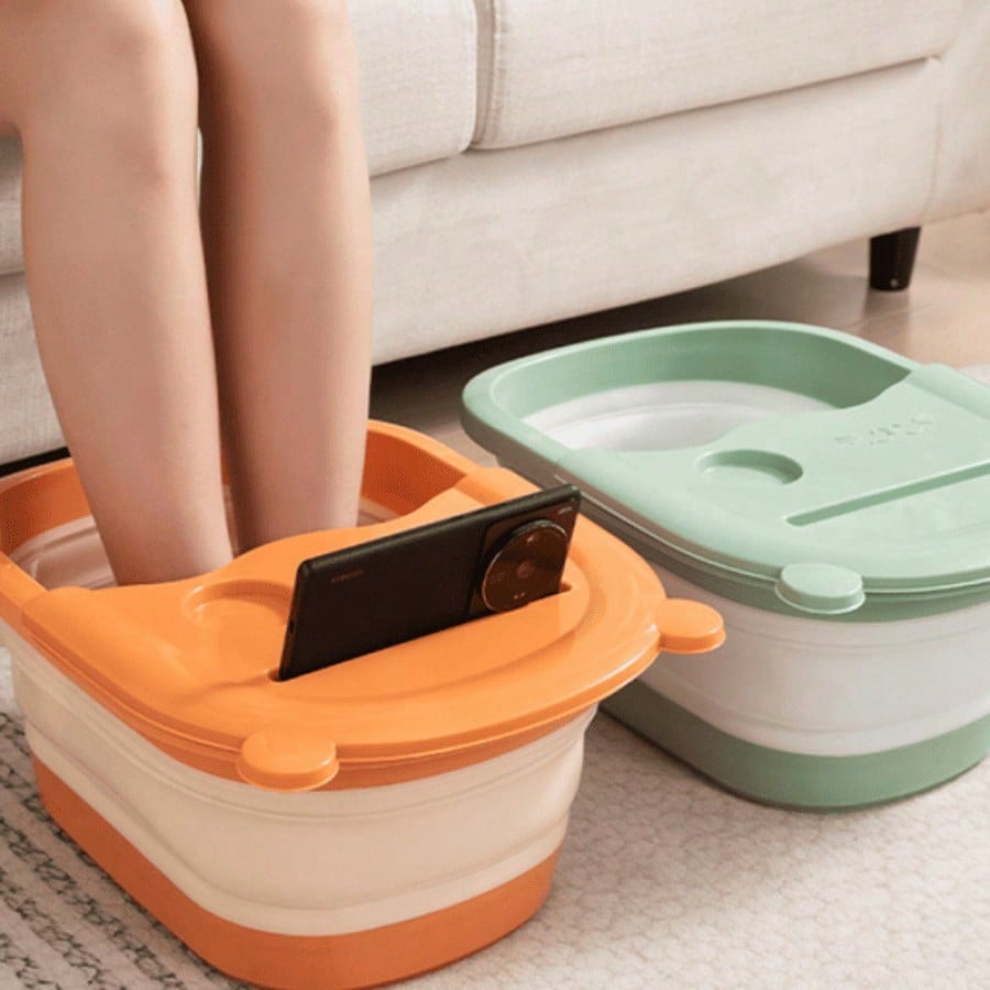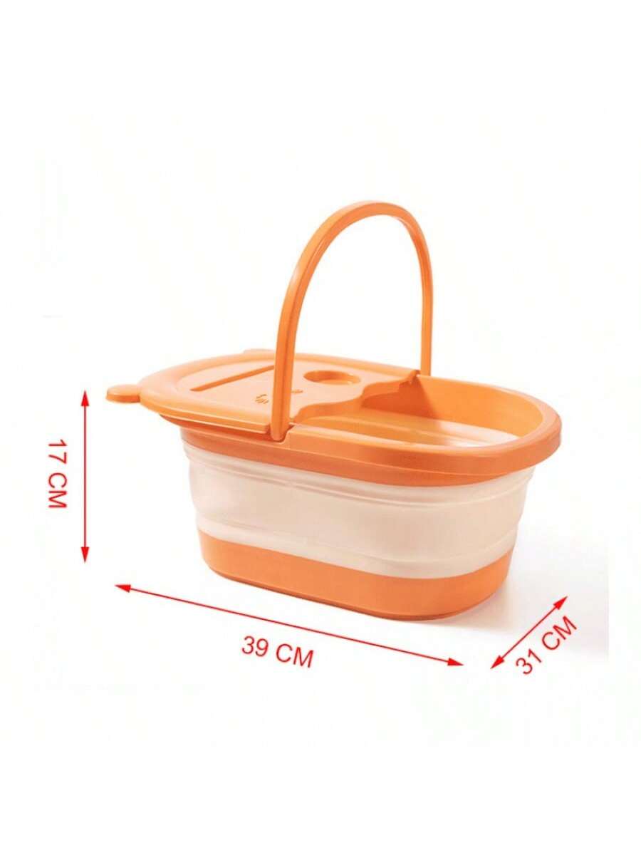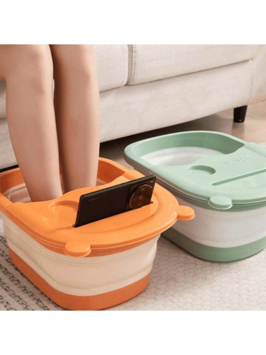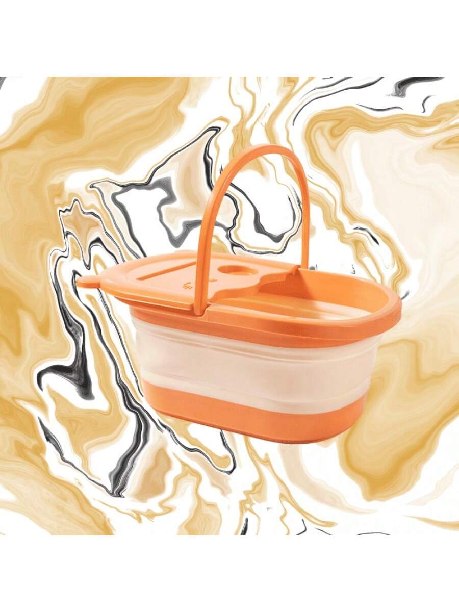 Cube plegable naranja para baño de pies. Diseño compacto que ahorra espacio cuando no se usa. Material duradero ideal para relajación podal.