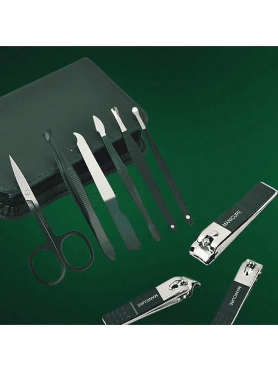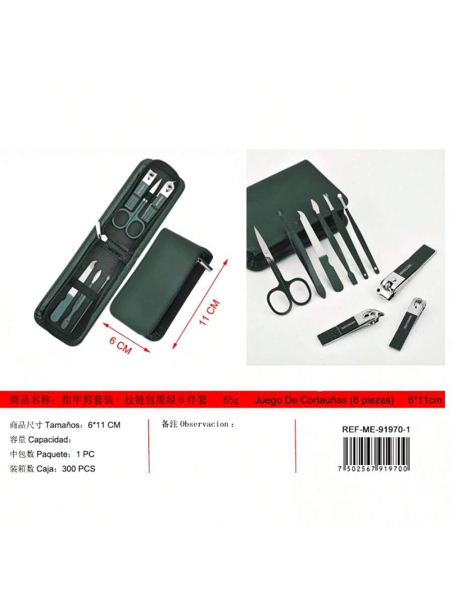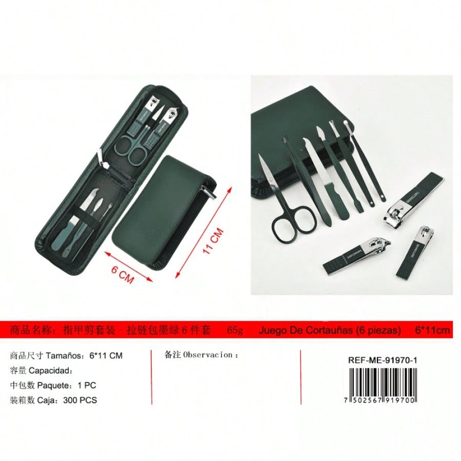 Juego de cortaúñas de 6 piezas en bolsa verde oscuro con cremallera. Set completo para cuidado personal que incluye diversas herramientas, manteniendo todo organizado y portátil.