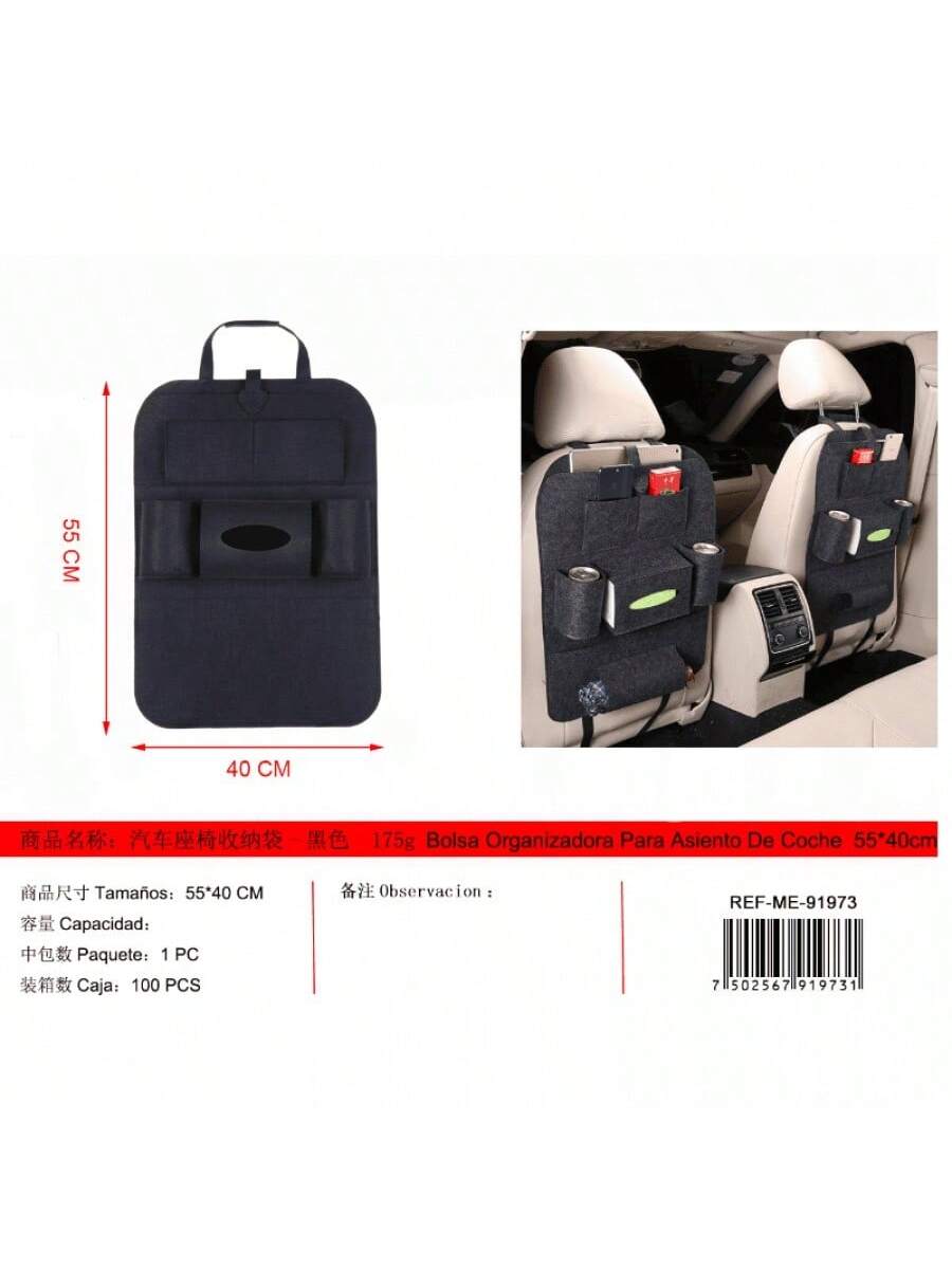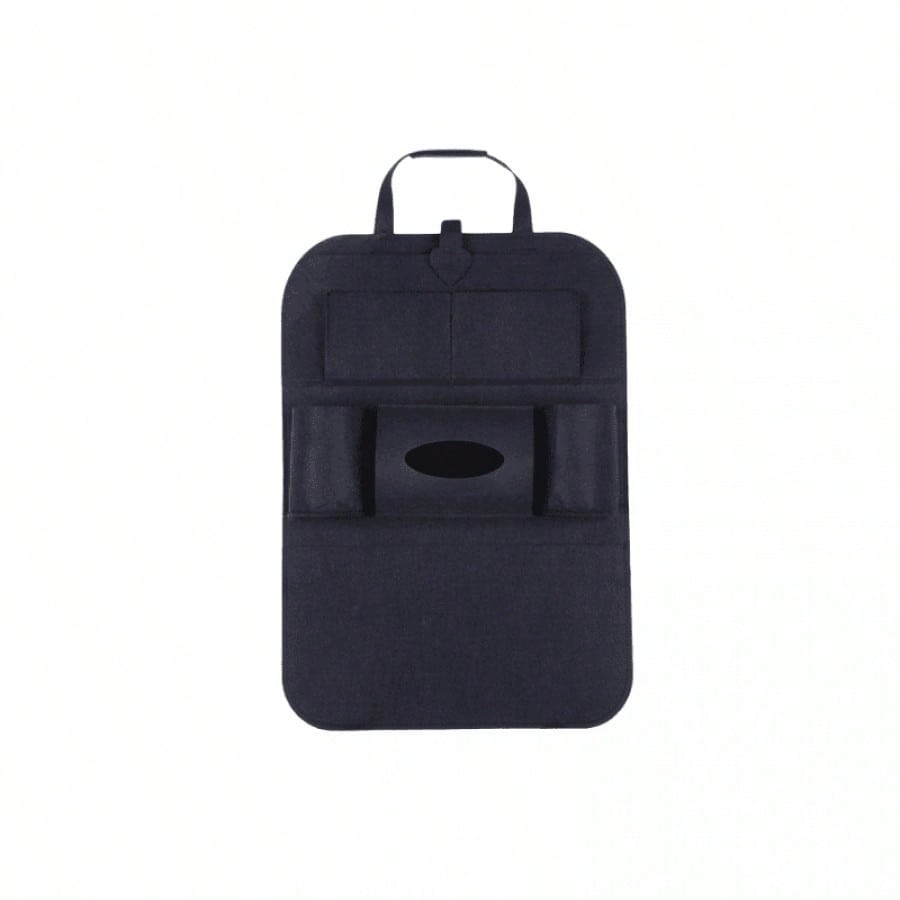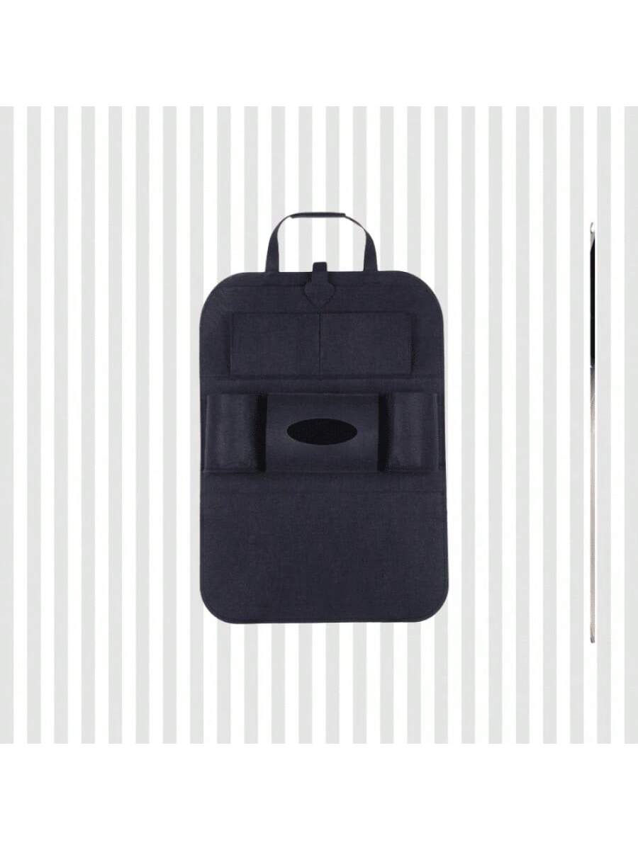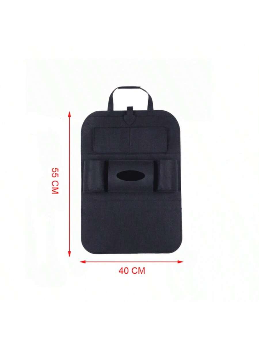 Bolsa de almacenamiento negra para asiento de coche. Organiza objetos personales durante viajes. Material resistente y diseño funcional.