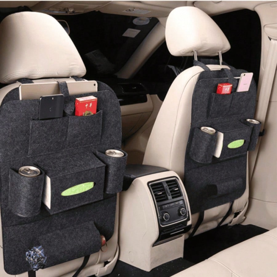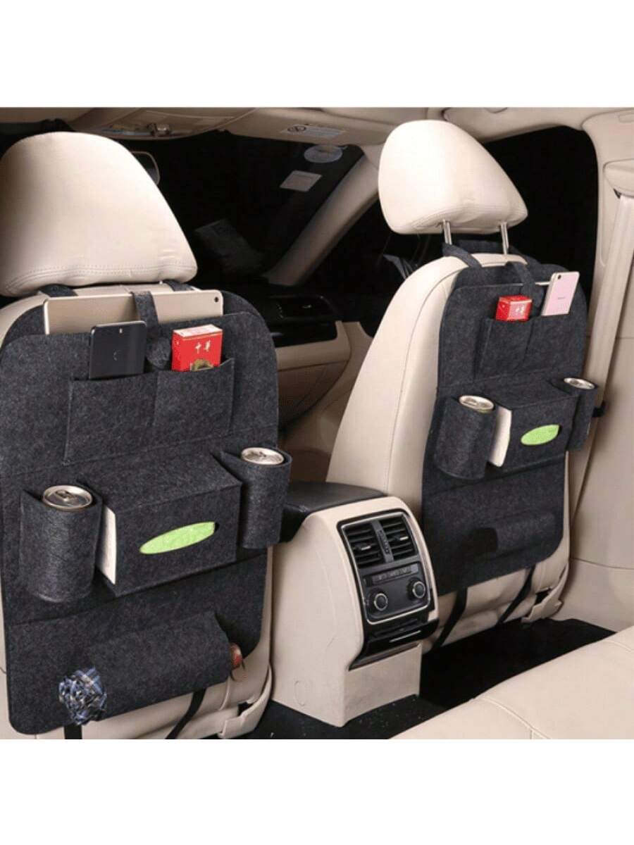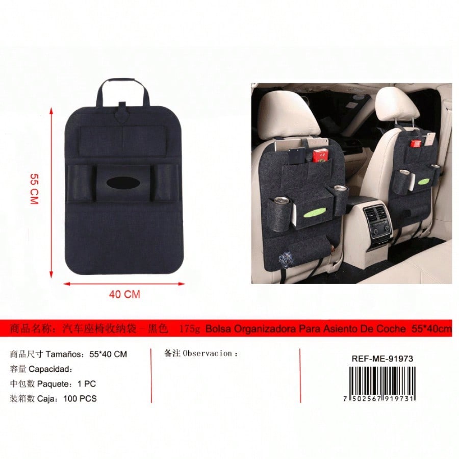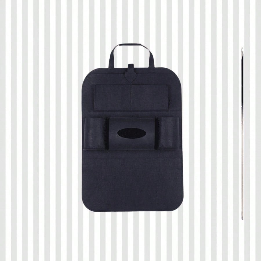 Bolsa de almacenamiento negra para asiento de coche. Organiza objetos personales durante viajes. Material resistente y diseño funcional.