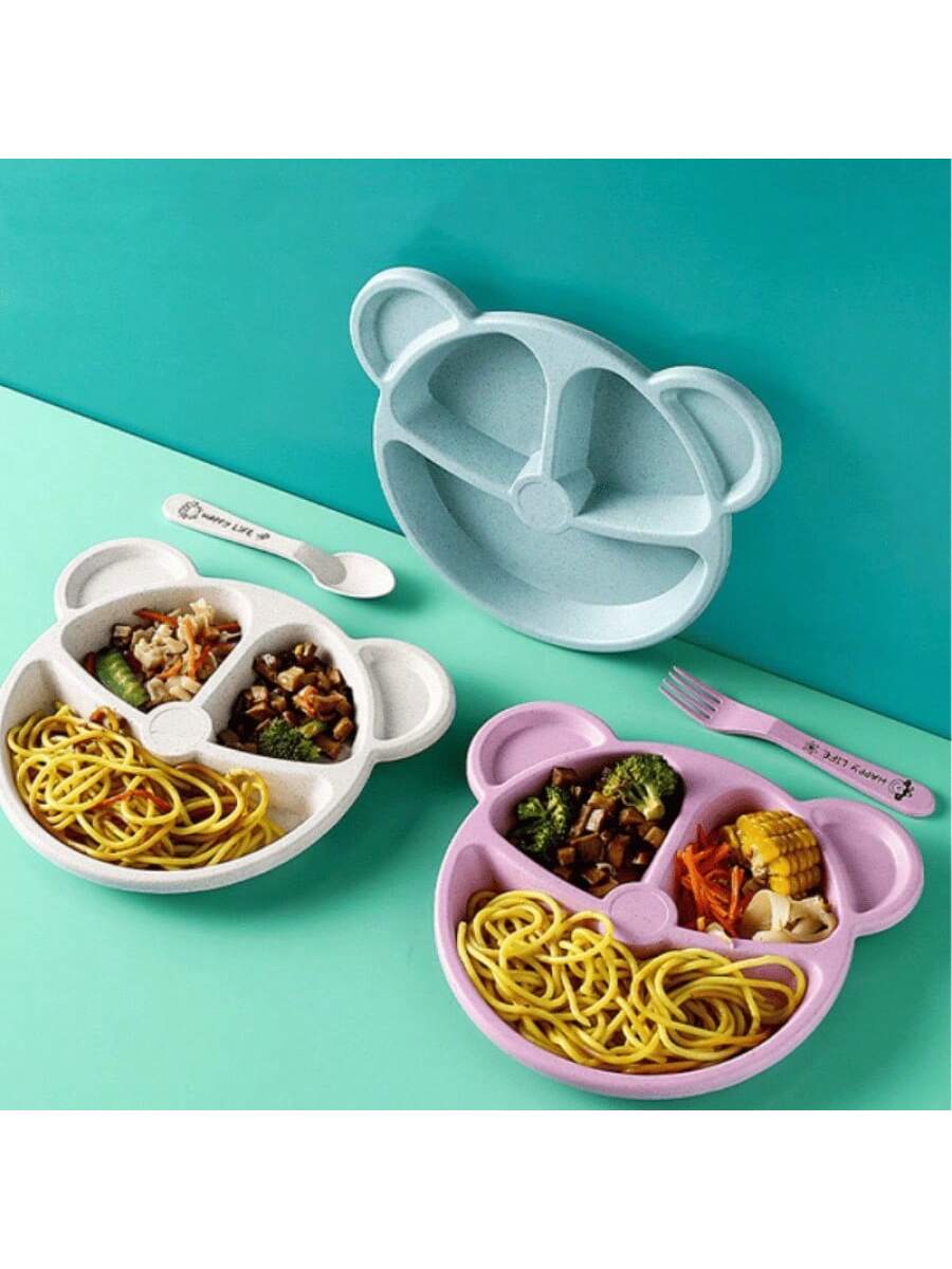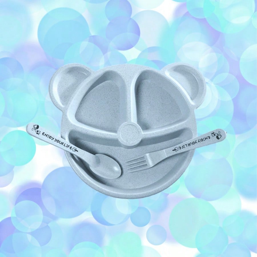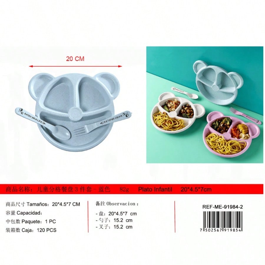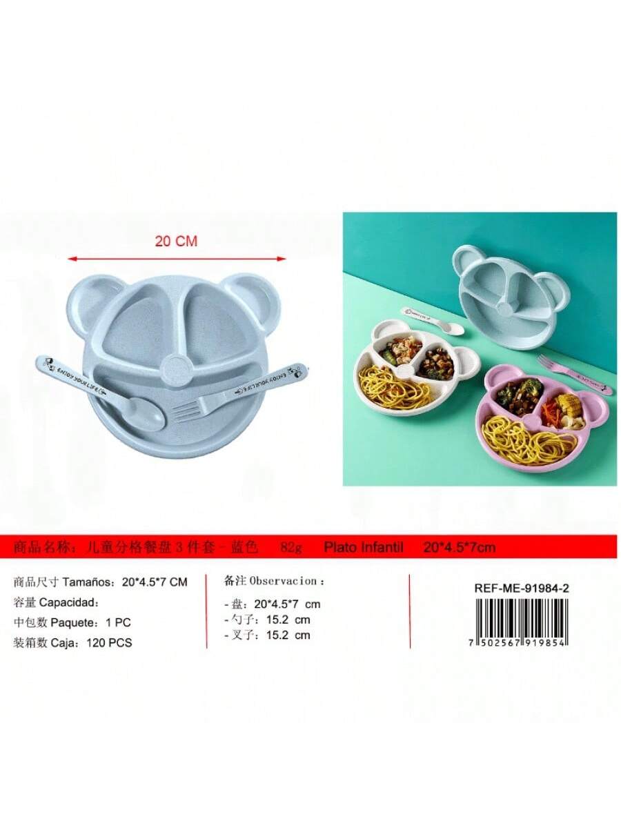 Juego de 3 platos divididos azules para niños. Diseño funcional que organiza comidas infantiles, perfecto para facilitar la alimentación de los pequeños con estilo colorido.