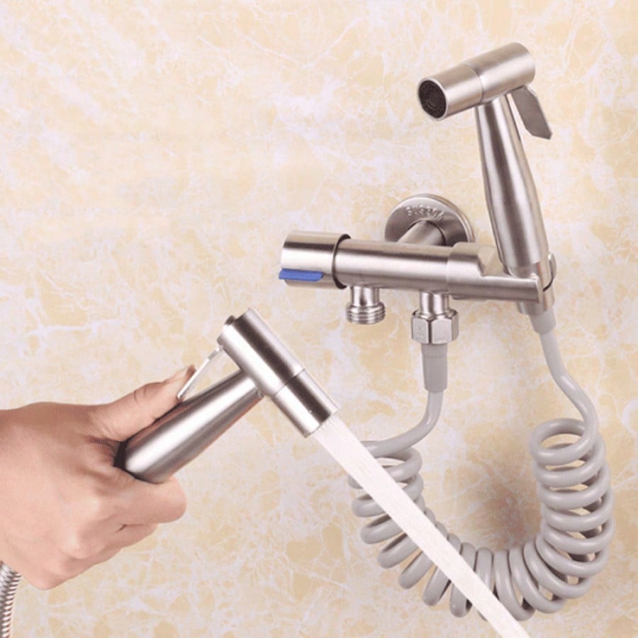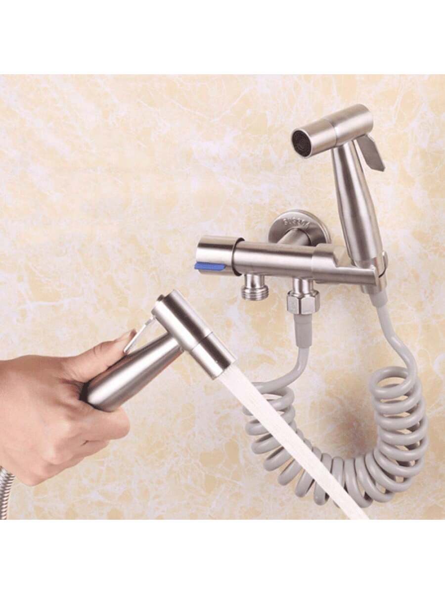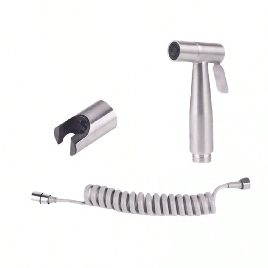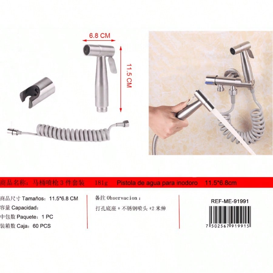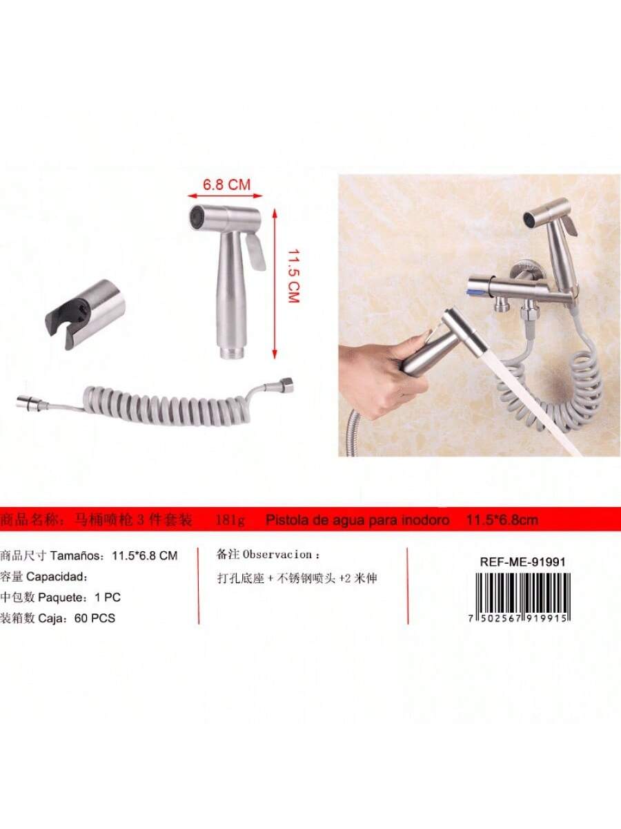 Juego de 3 piezas para limpieza de inodoro incluye pistola pulverizadora, base perforada y boquilla acero inoxidable con extensión 2m. Sistema profesional para higiene profunda.