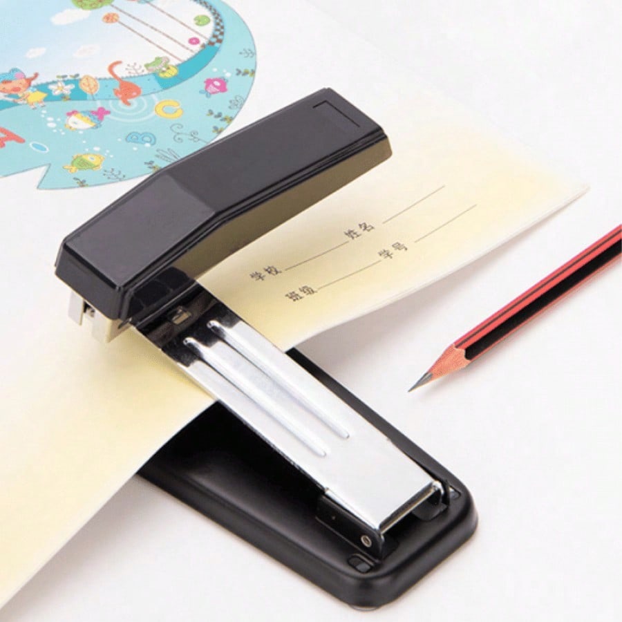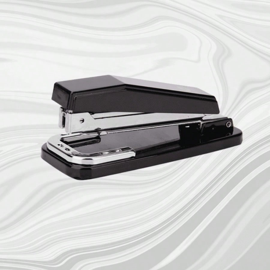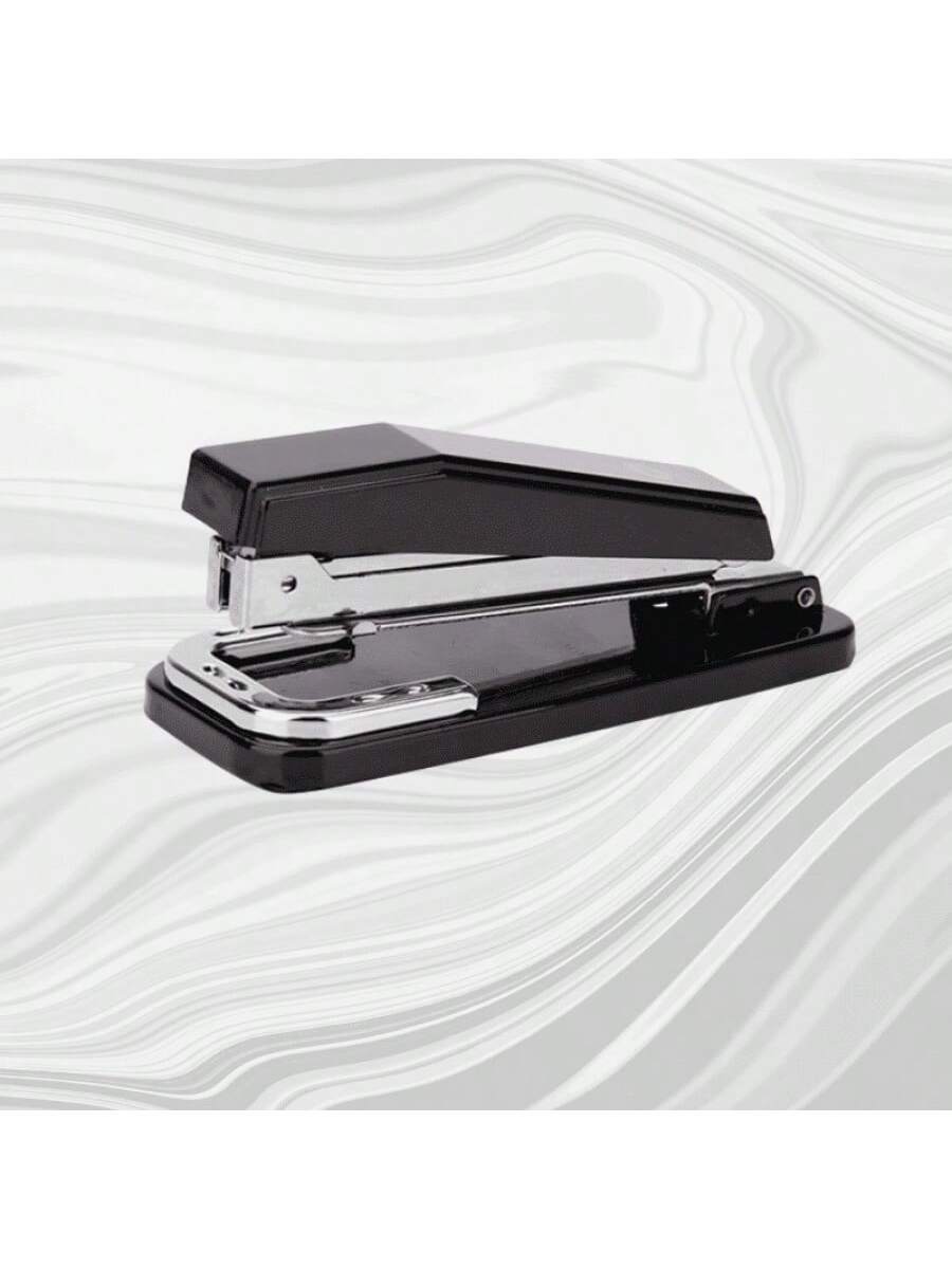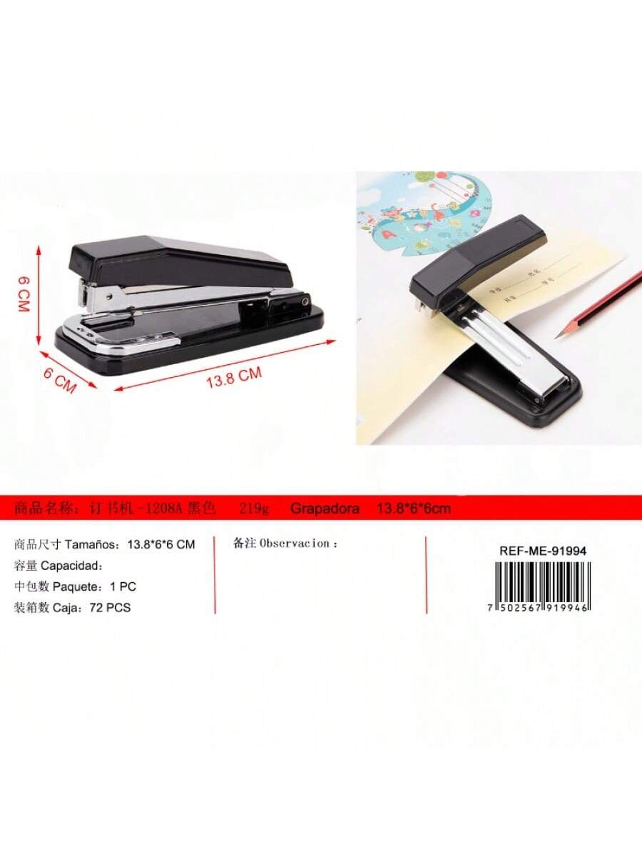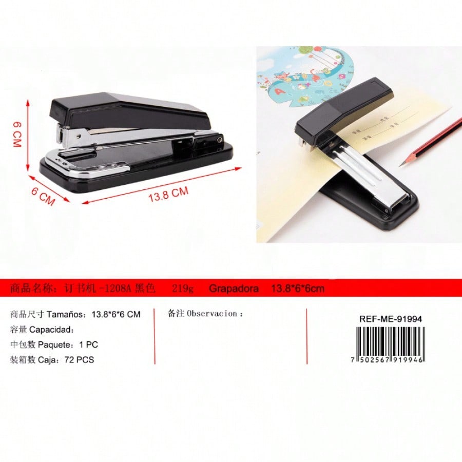 Grapadora modelo 1208A color negro. Mecanismo eficiente para unir documentos y materiales. Diseño robusto para uso doméstico y de oficina.