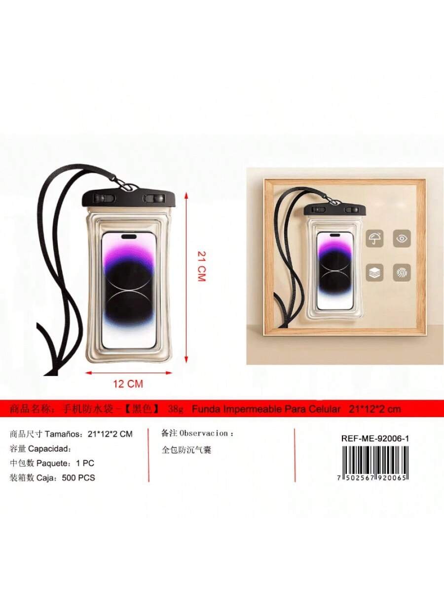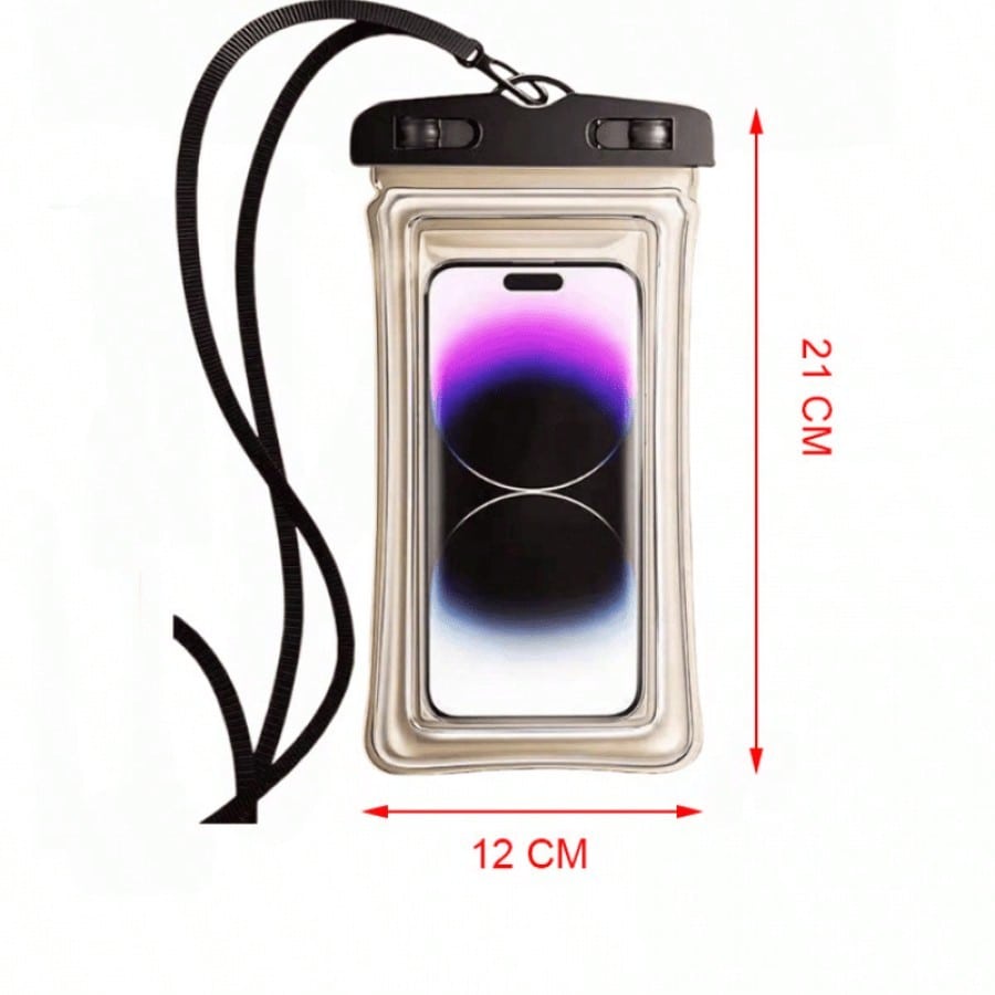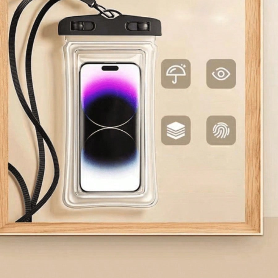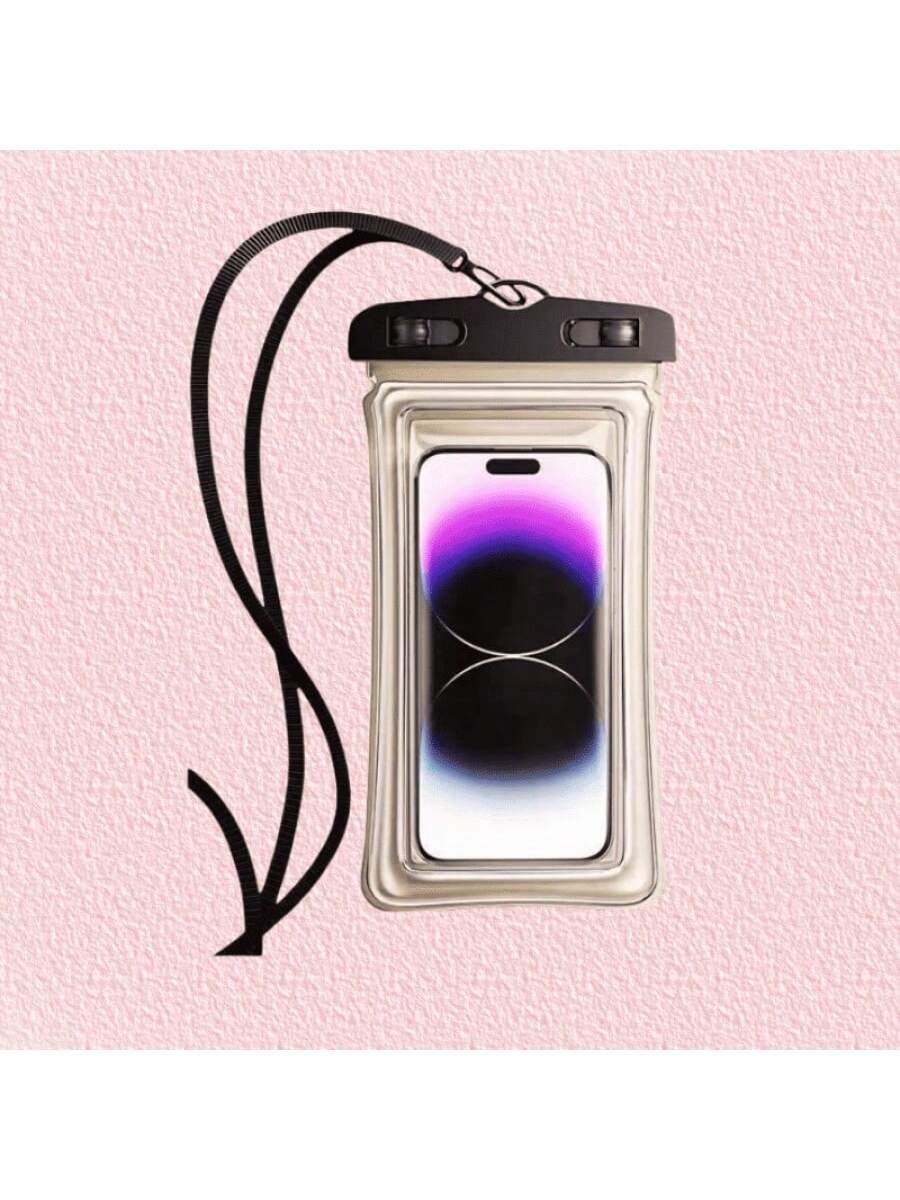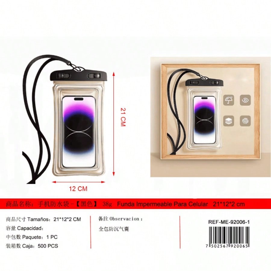 Bolsa impermeable negra para teléfono móvil con sistema airbag antihundimiento. Sellado total que protege el dispositivo contra agua y hundimiento, ideal para actividades acuáticas y deportes extremos.