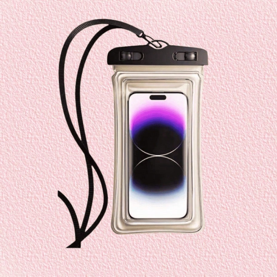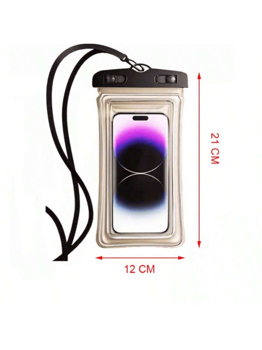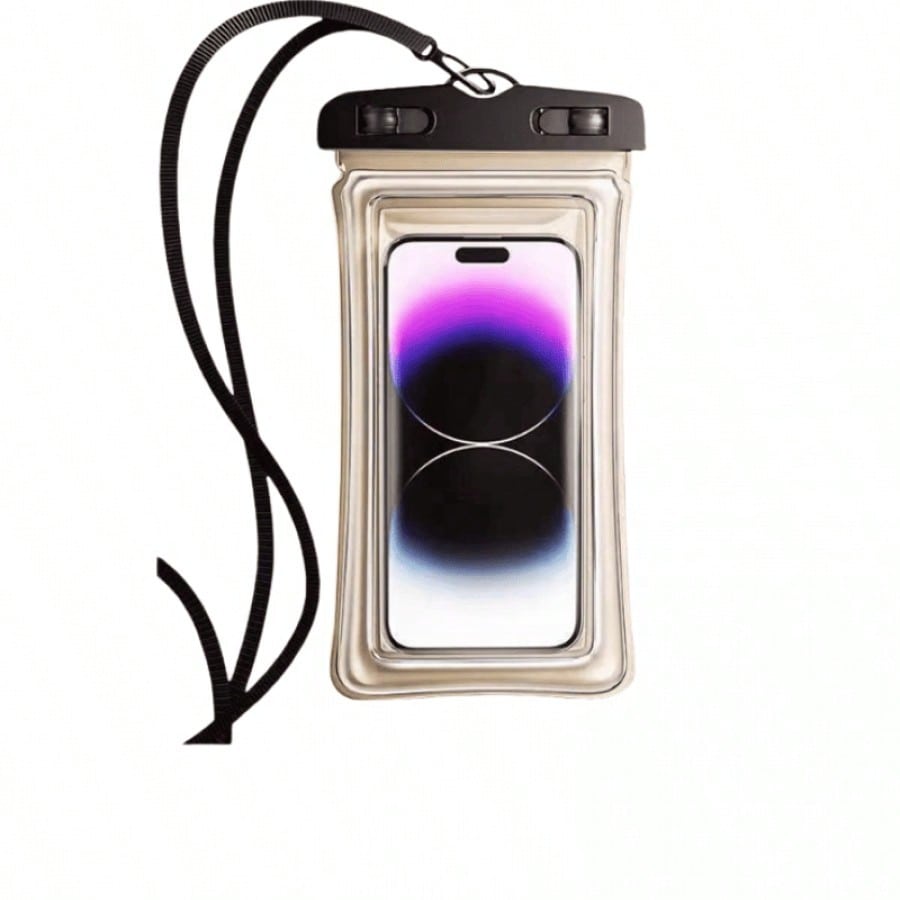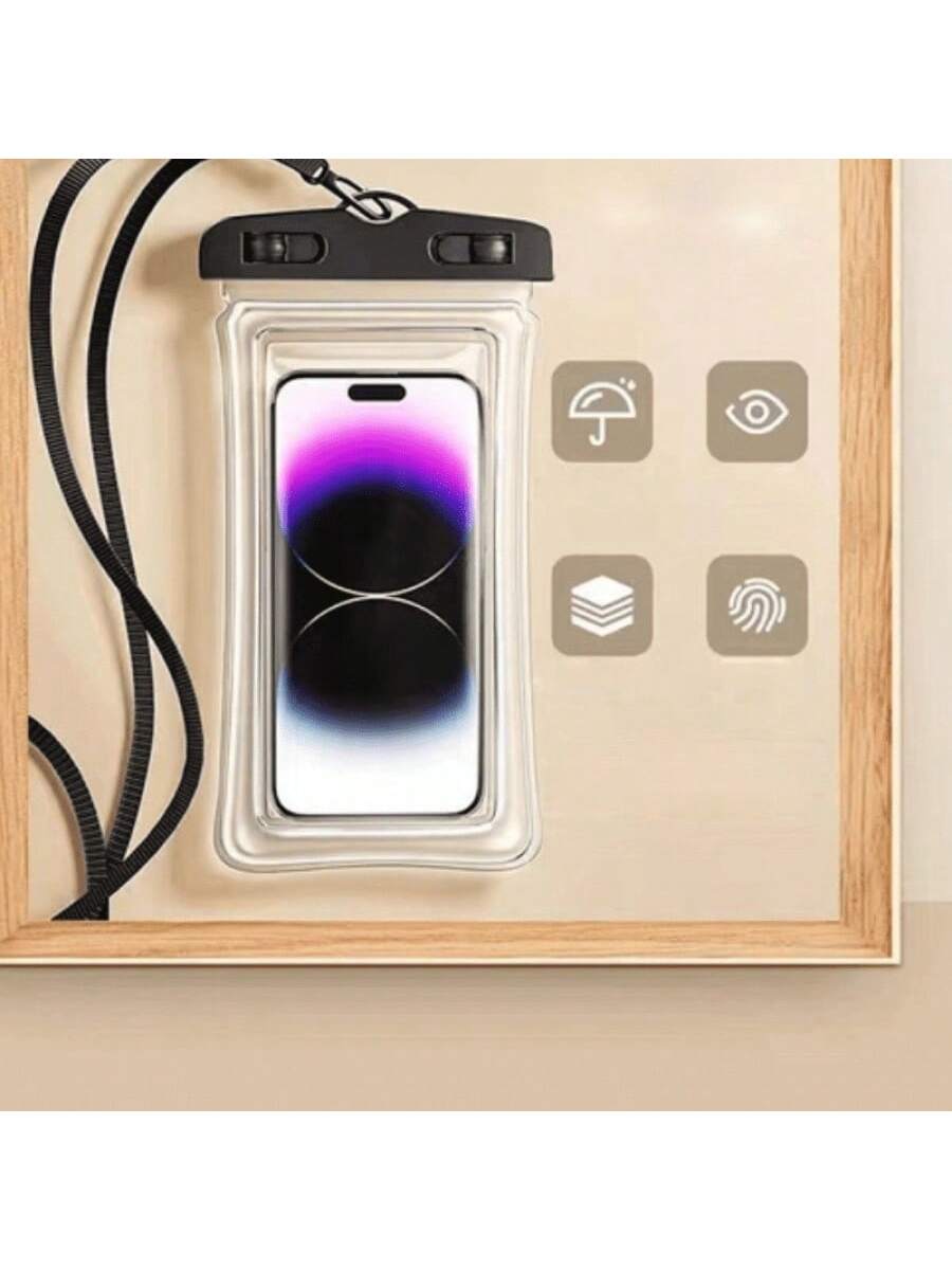 Bolsa impermeable negra para teléfono móvil con sistema airbag antihundimiento. Sellado total que protege el dispositivo contra agua y hundimiento, ideal para actividades acuáticas y deportes extremos.