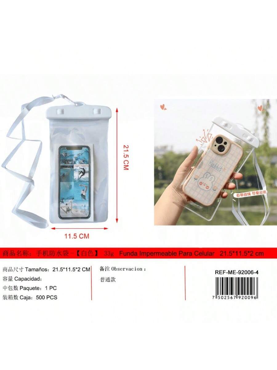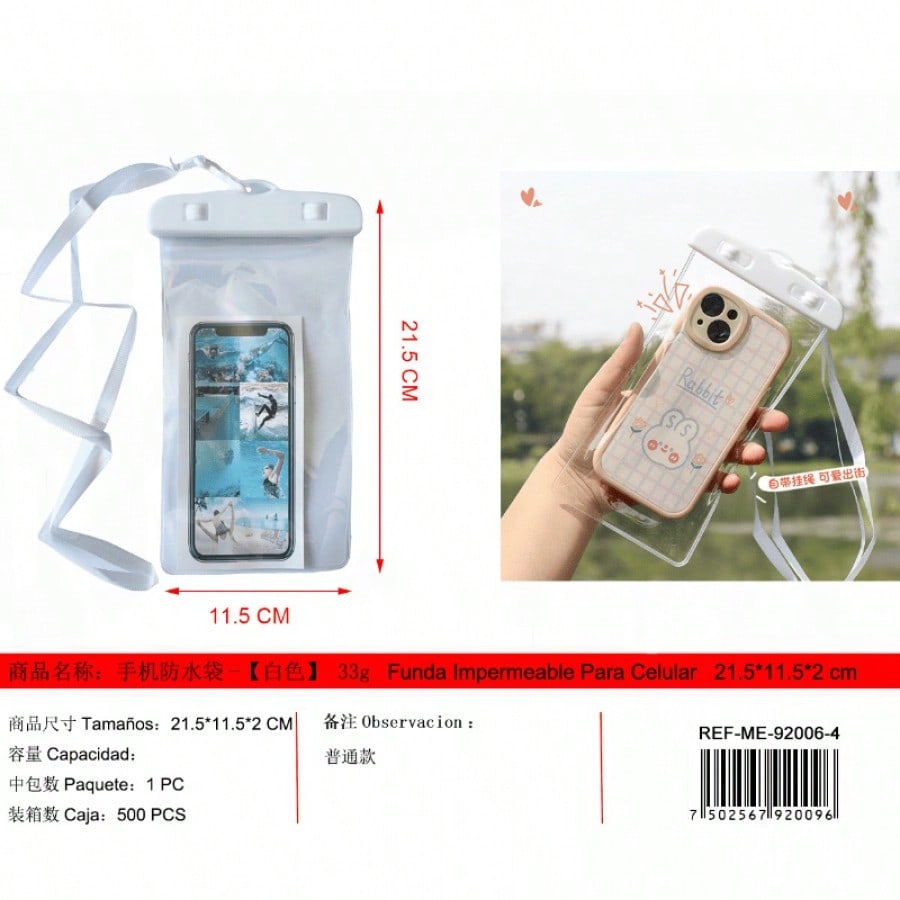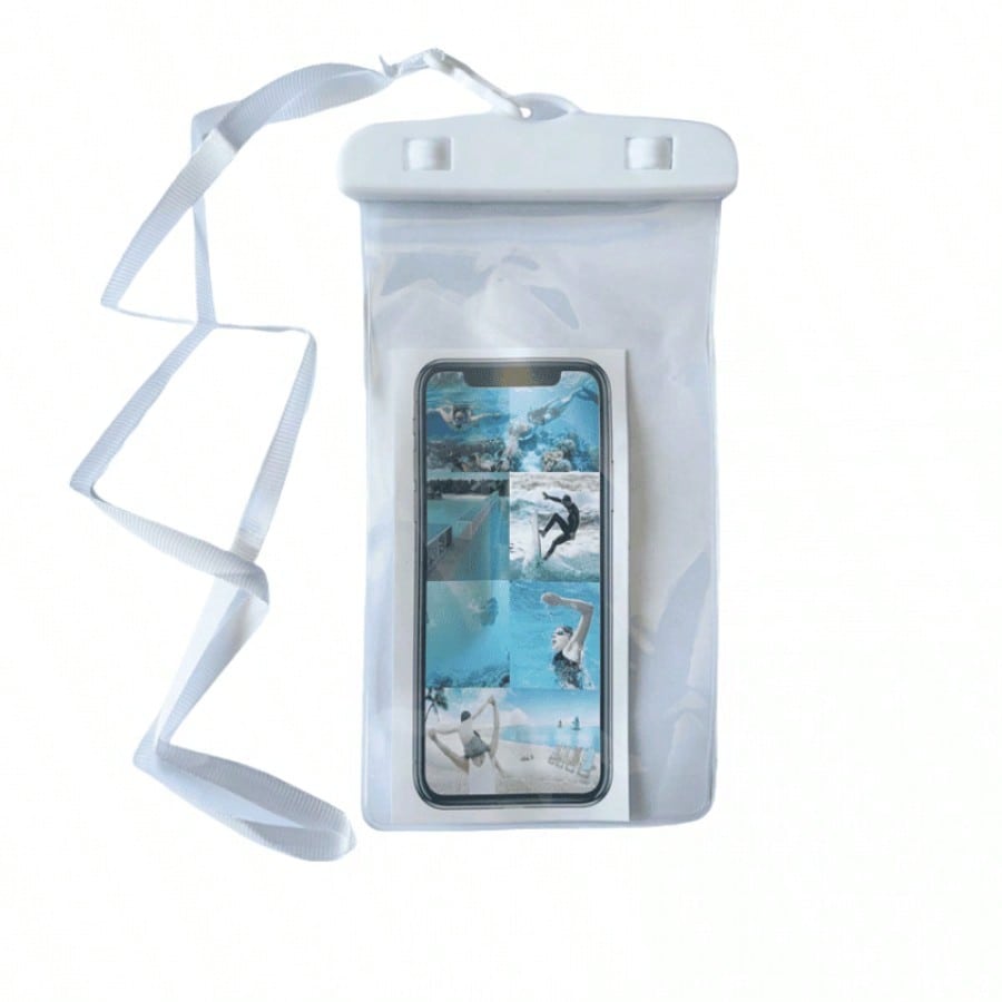 Bolsa impermeable blanca de modelo estándar, ofrece protección esencial contra líquidos. Solución práctica para resguardar tu dispositivo móvil en condiciones de humedad o lluvia.