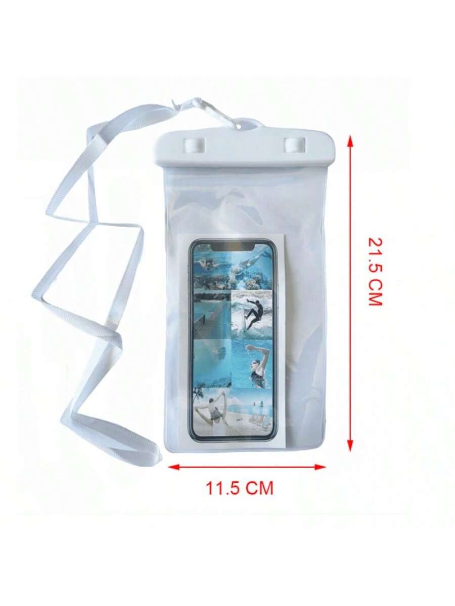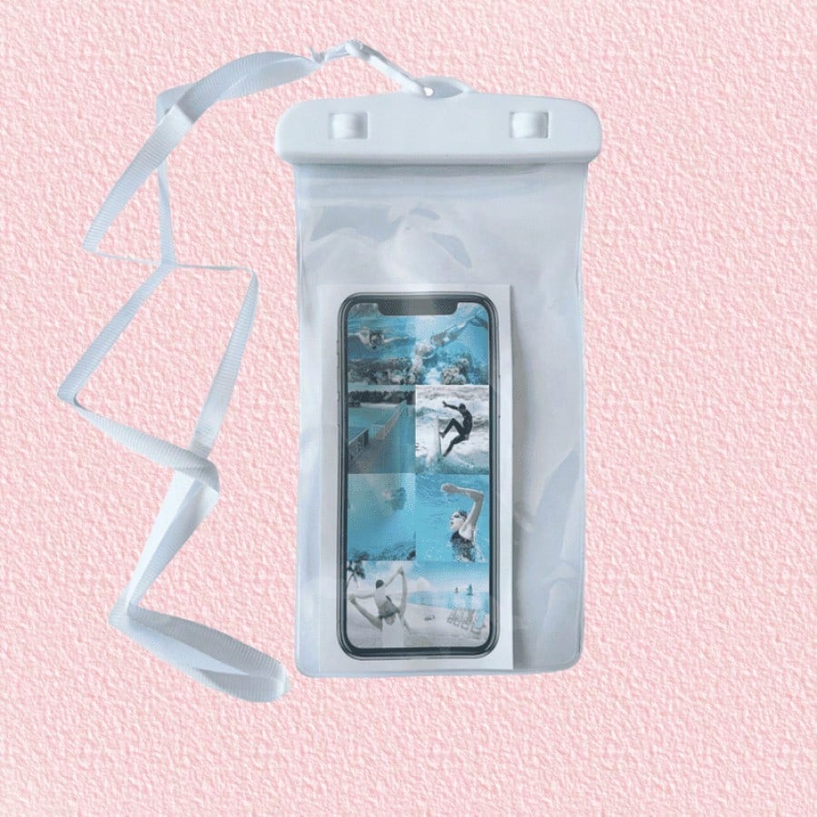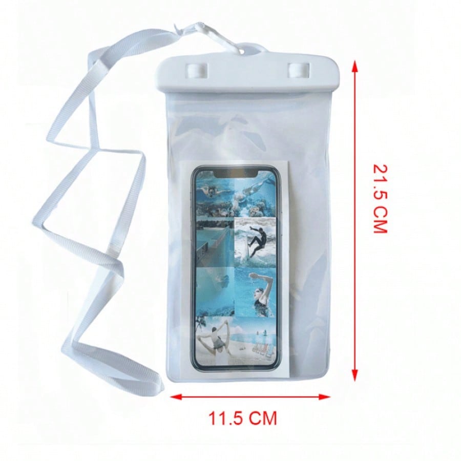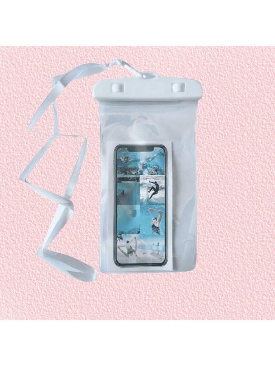 Bolsa impermeable blanca de modelo estándar, ofrece protección esencial contra líquidos. Solución práctica para resguardar tu dispositivo móvil en condiciones de humedad o lluvia.