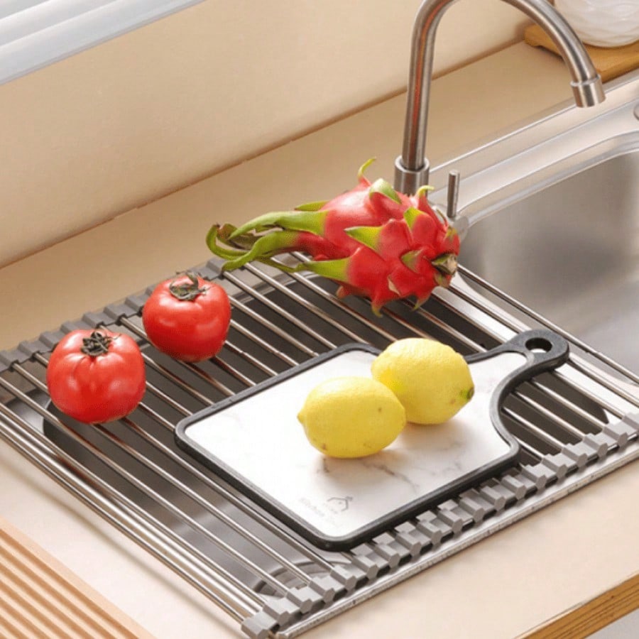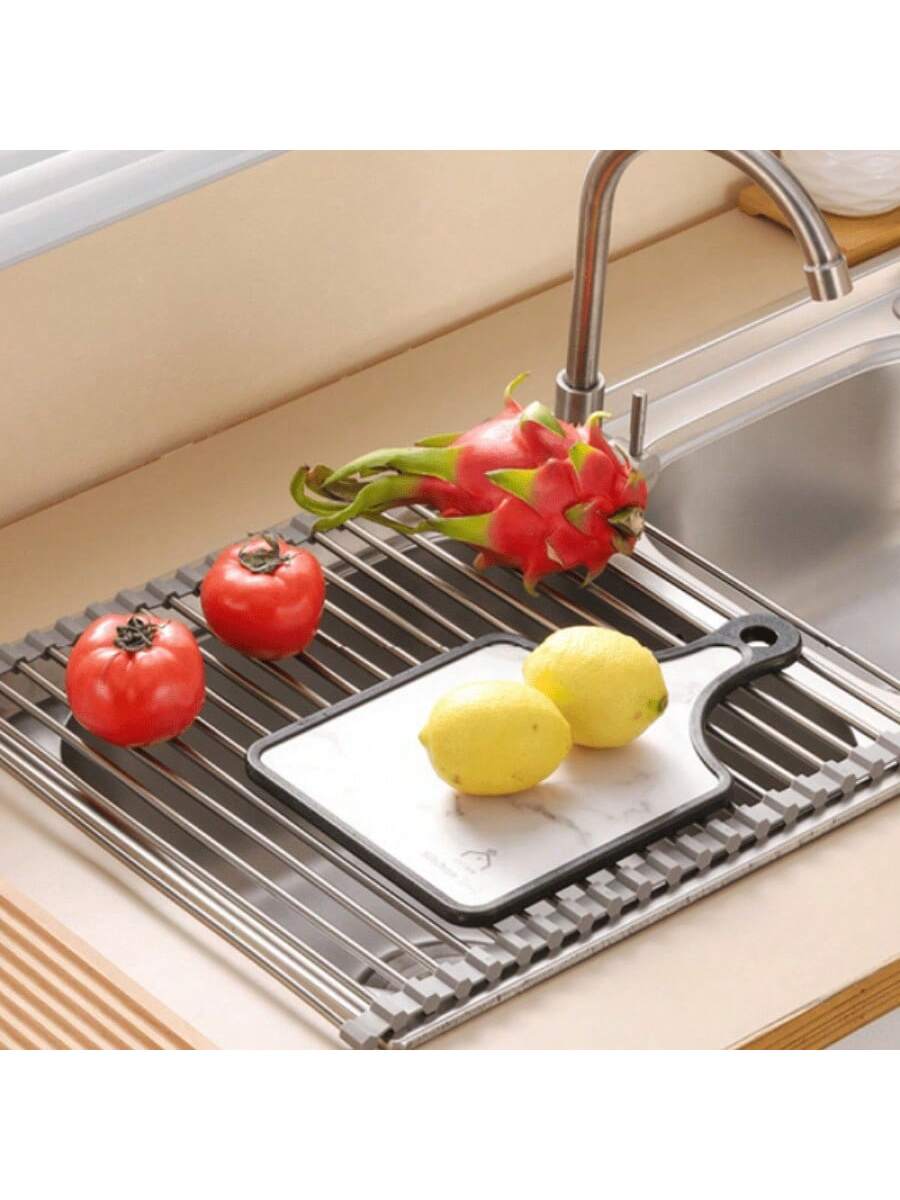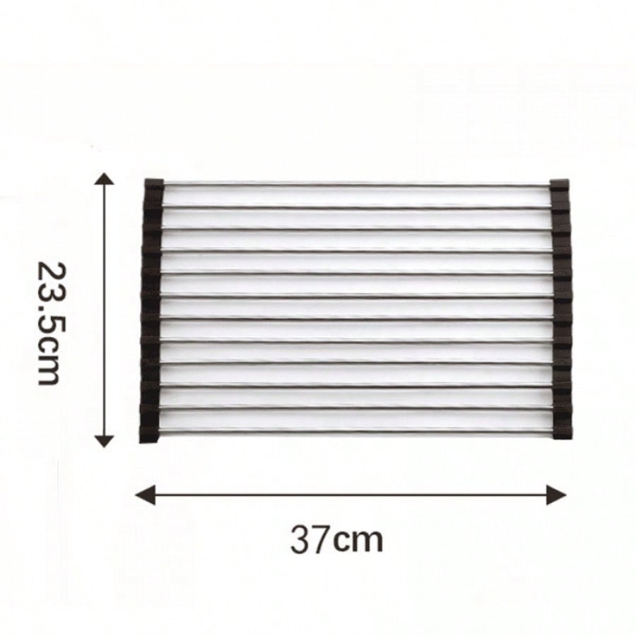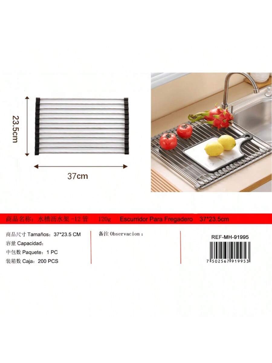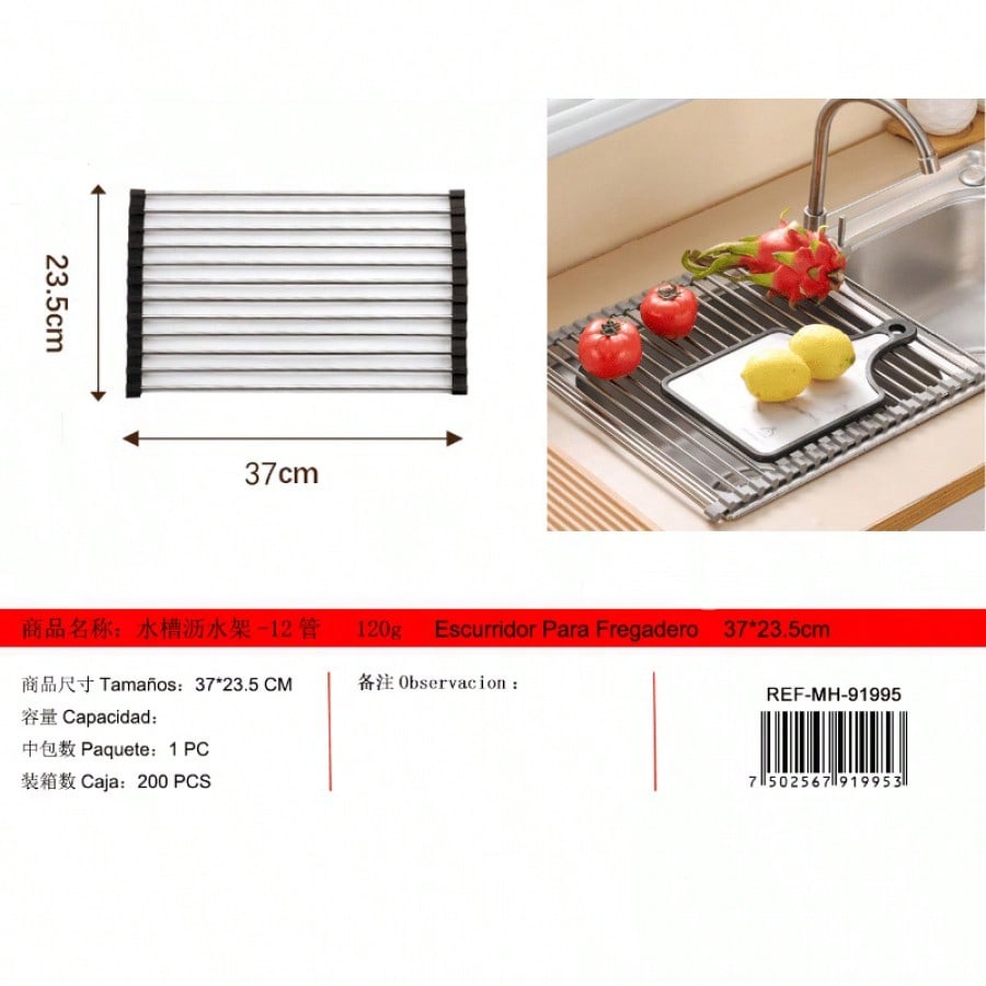 Escurridor transversal para fregadero 37x23.5 cm con 12 tubos. Diseño sin forma específica que optimiza espacio. Ideal para secado de utensilios de cocina.