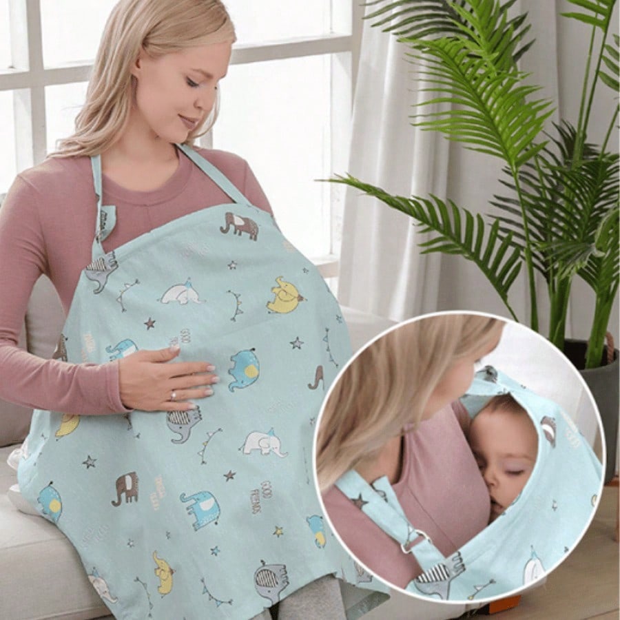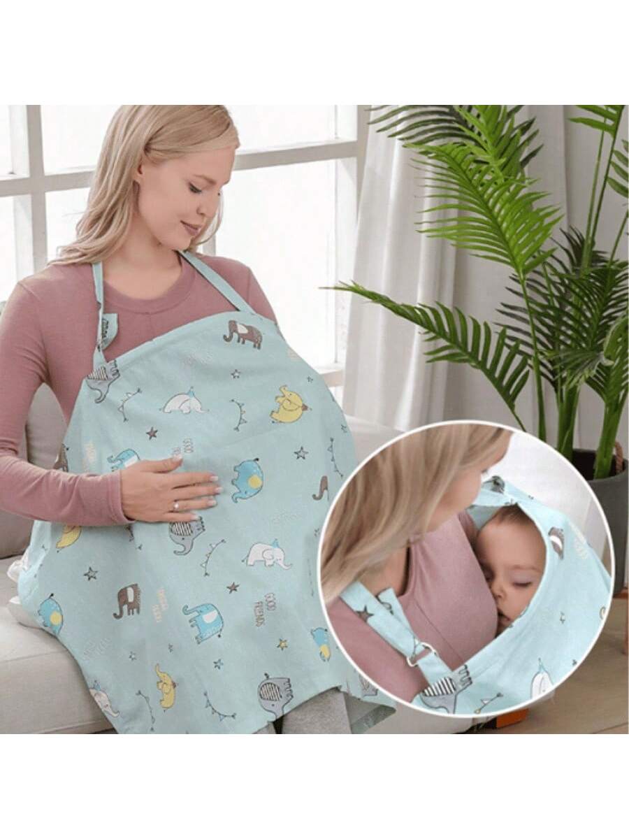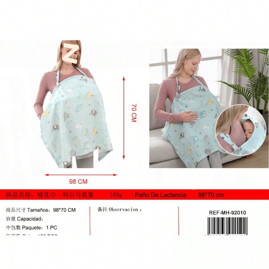 Funda de lactancia color Korma con estampado de elefante azul. Proporciona discreción y comodidad durante la alimentación del bebé. Tela suave y diseño práctico para uso interior y exterior.