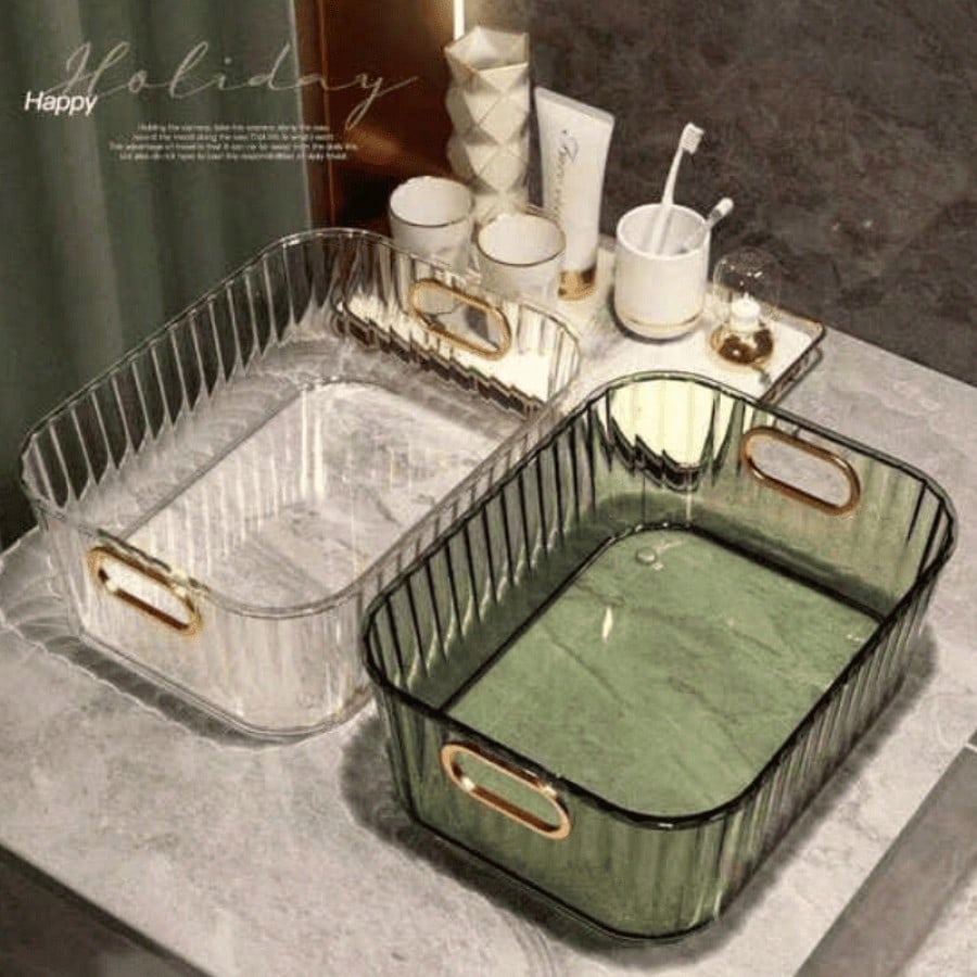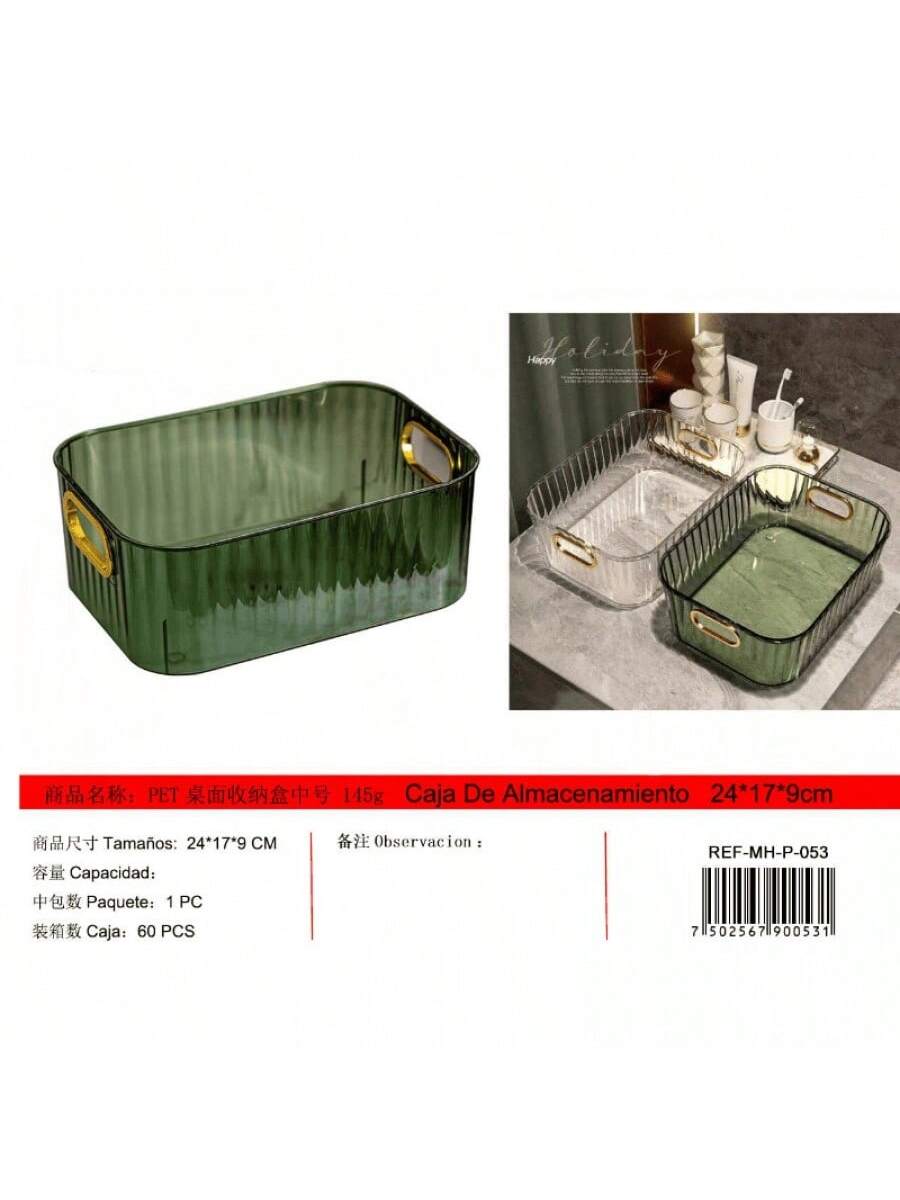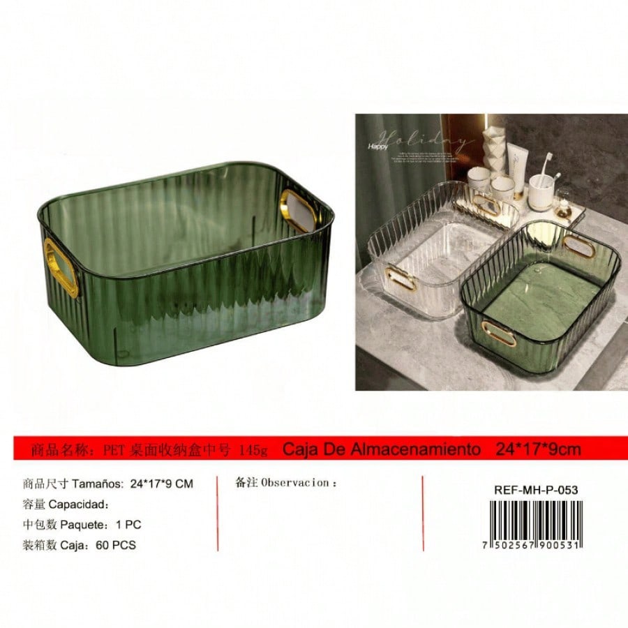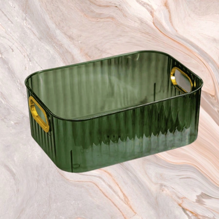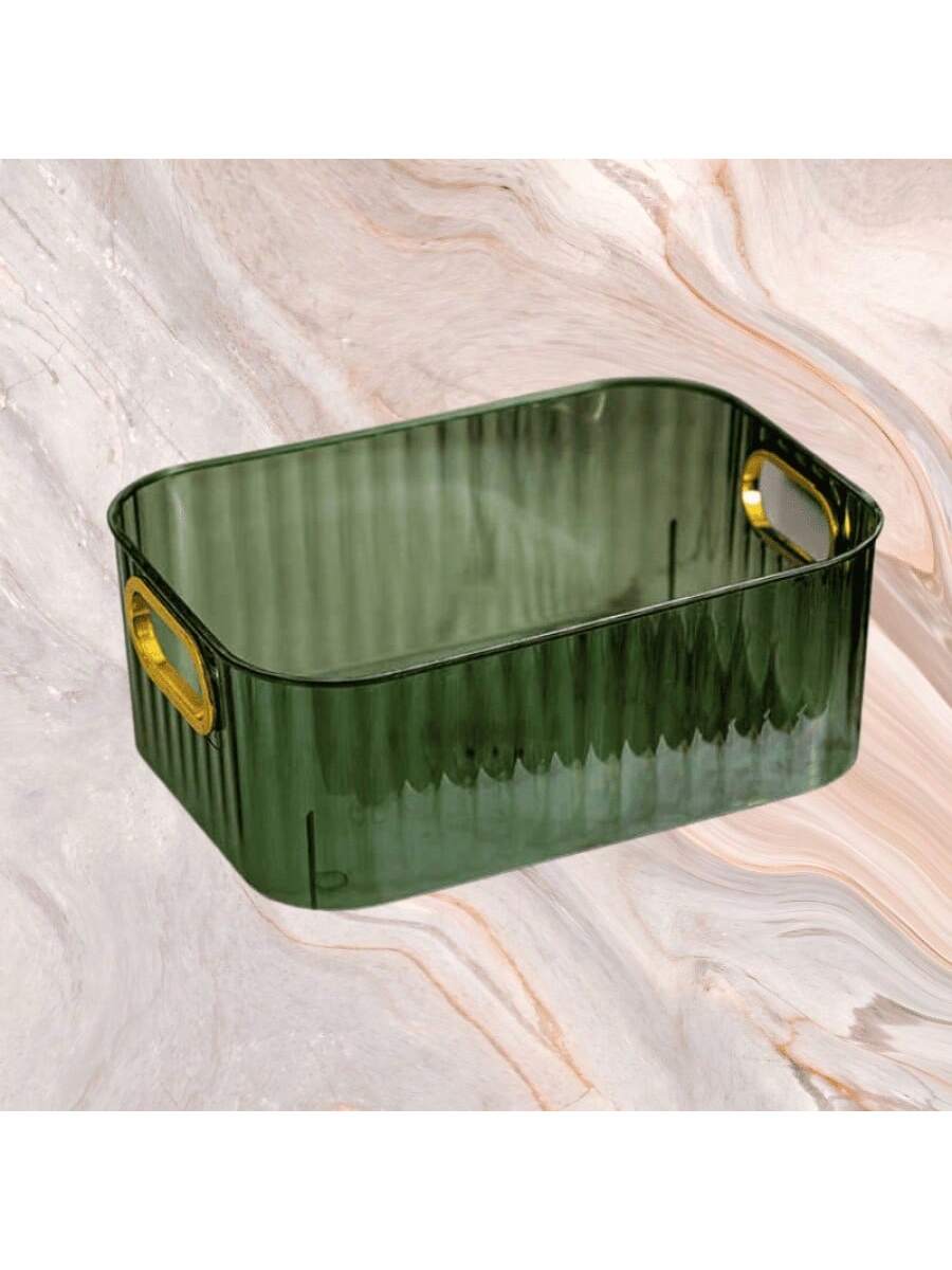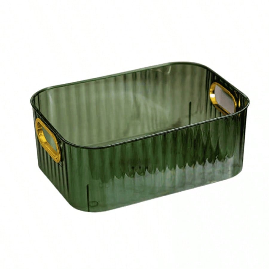 Caja organizadora mediana de color verde, fabricada en material PET resistente. Diseñada para mantener tu espacio de trabajo ordenado, ofrece capacidad suficiente para almacenar diversos objetos de uso cotidiano con estilo y funcionalidad.