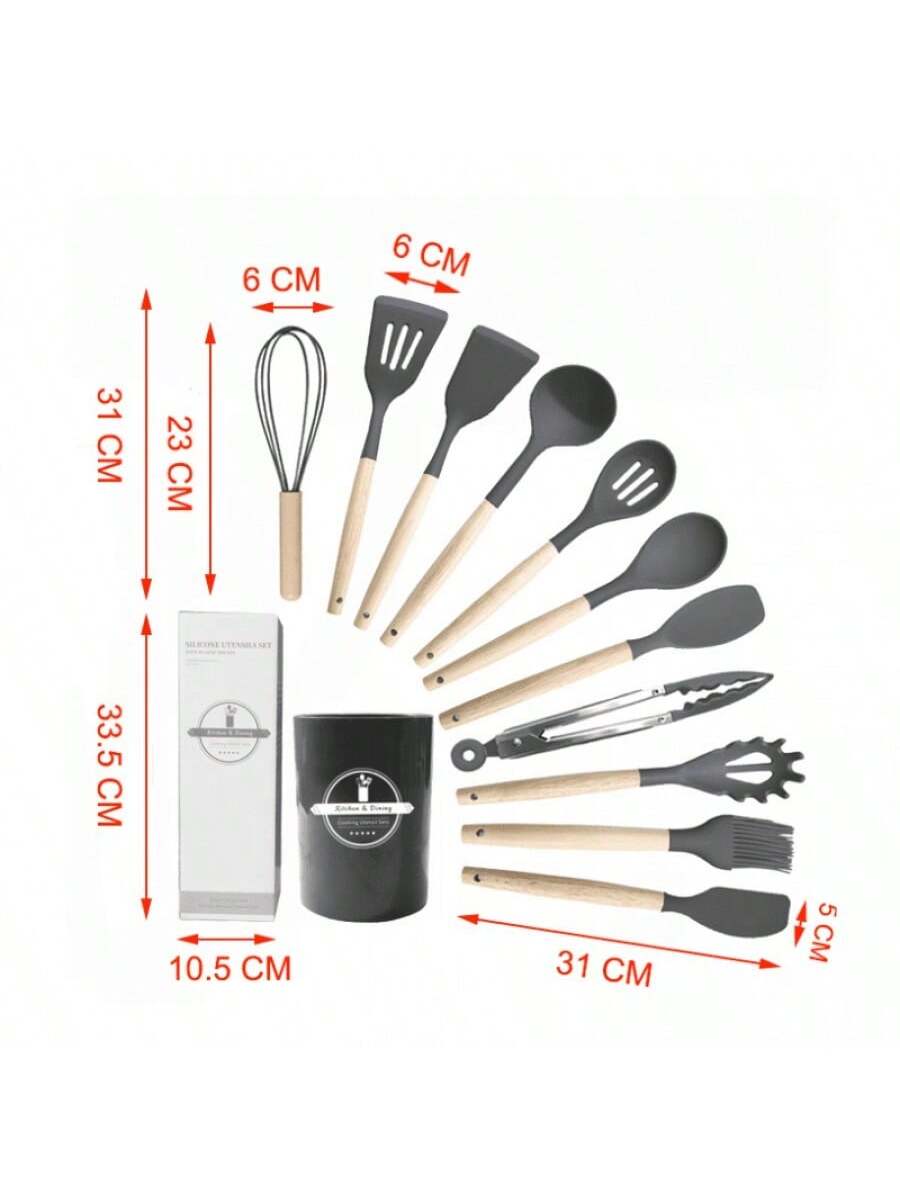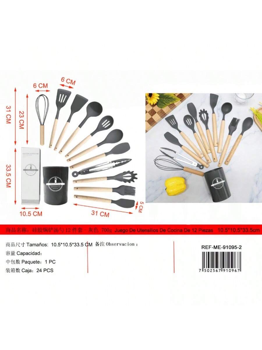 Juego de 12 piezas de utensilios de silicona color caqui, 700g. Herramientas de cocina prácticas para múltiples preparaciones, mangos cómodos y cabezales flexibles para uso versátil.
