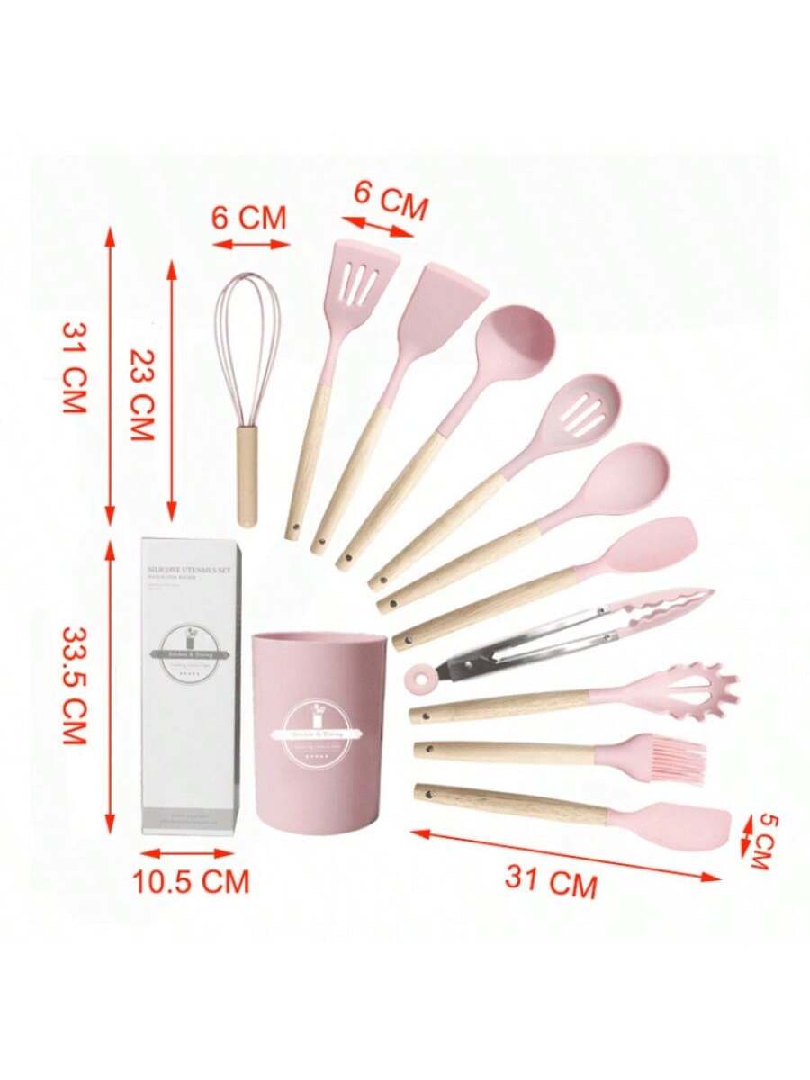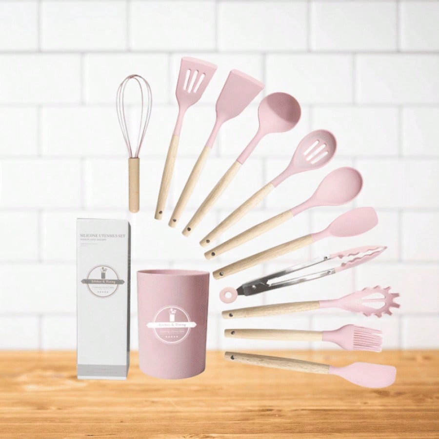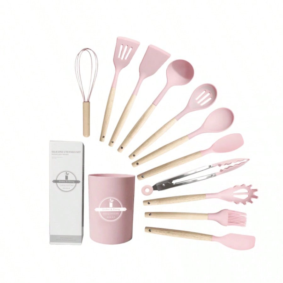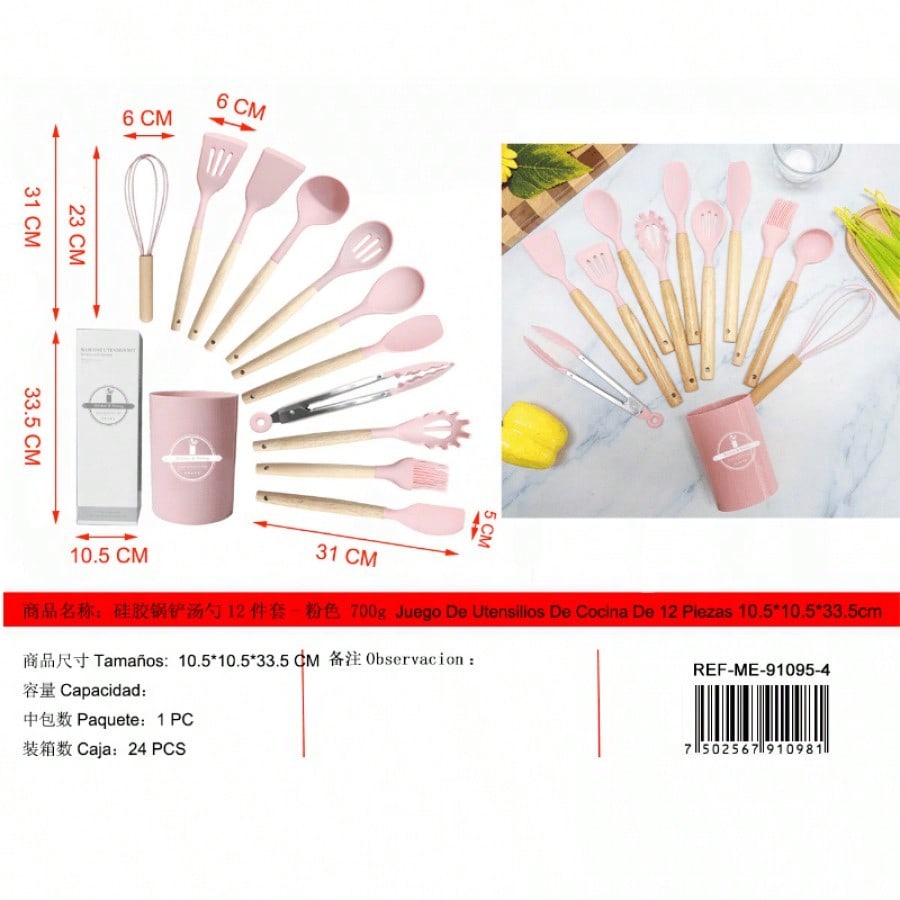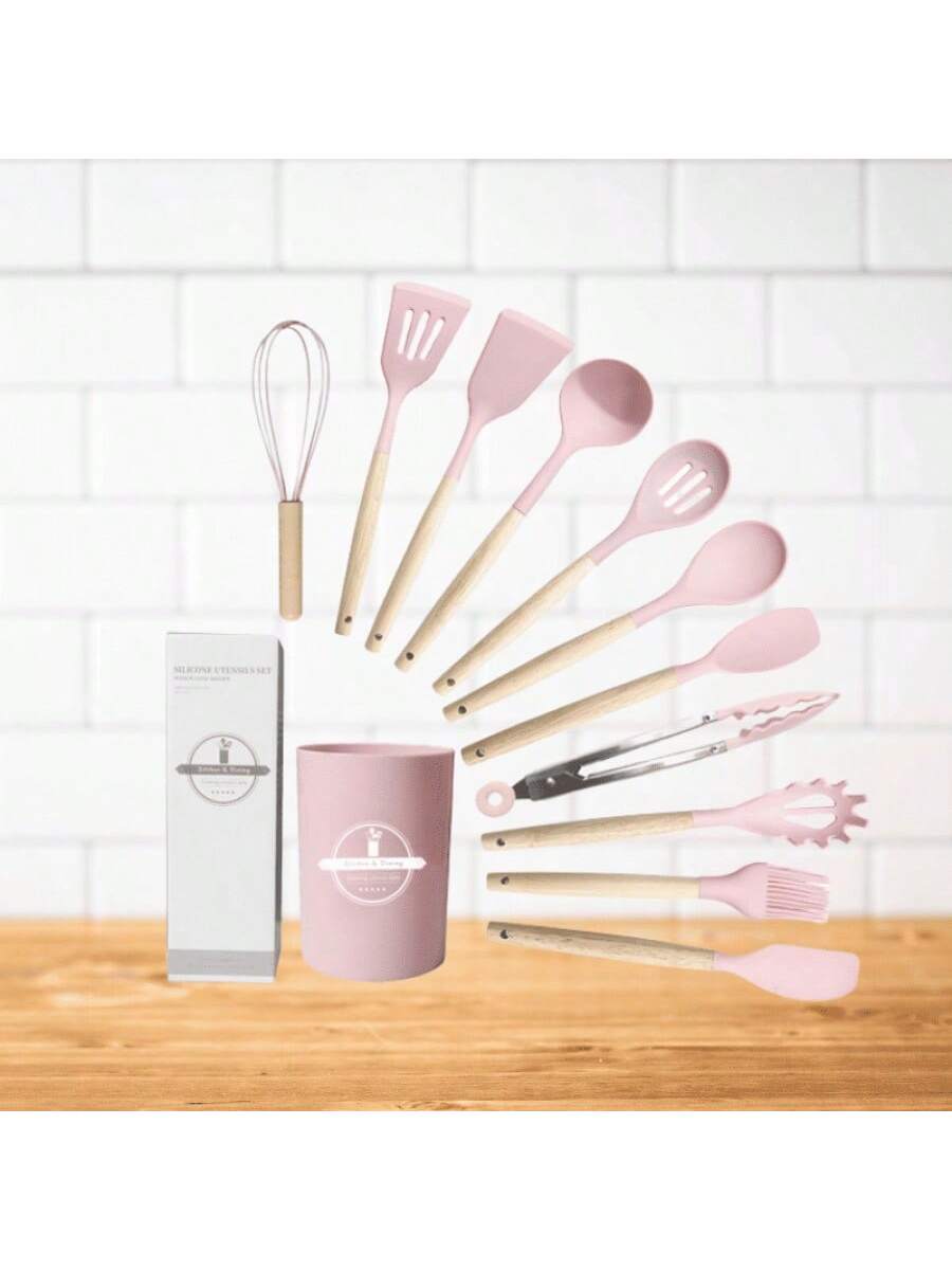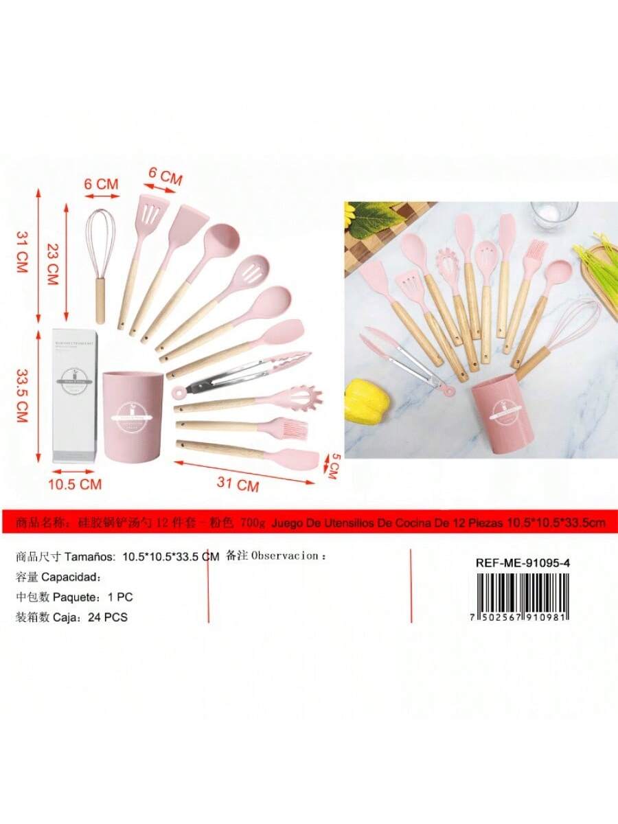 Juego de 12 utensilios de cocina color rosa, 700g. Diseño moderno y funcional para amantes de la cocina, superficies suaves que preservan ollas y sartenes durante su uso.