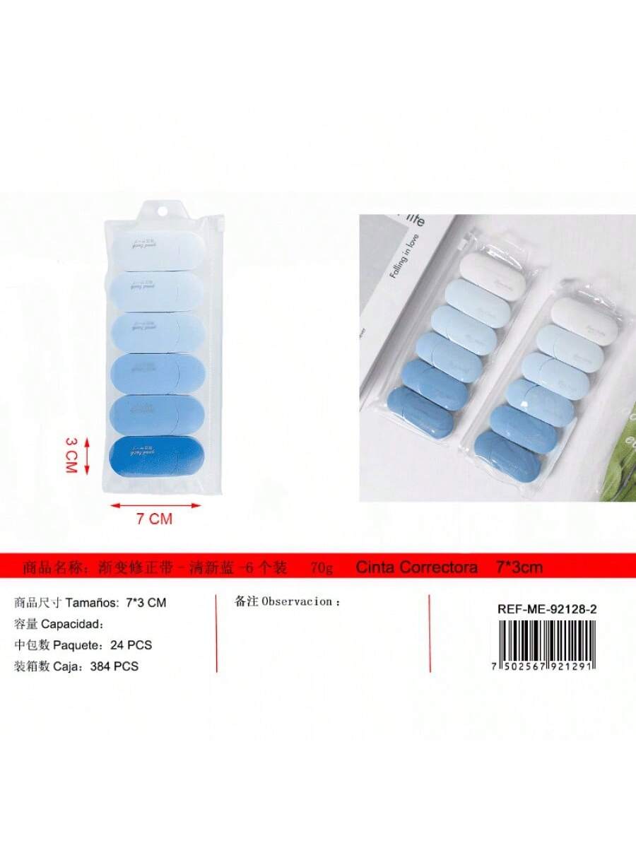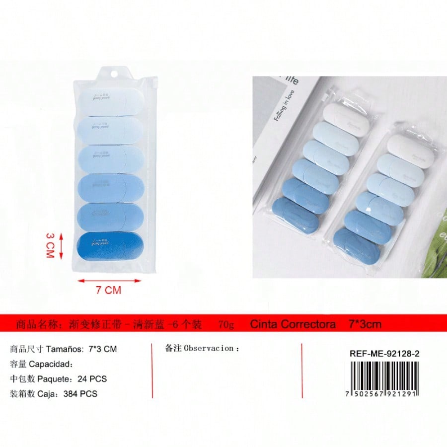 Cinta correctora azul fresco en paquete de 6. Tono relajante para corrección de escritura, diseño moderno que hace más agradable el trabajo administrativo o académico.