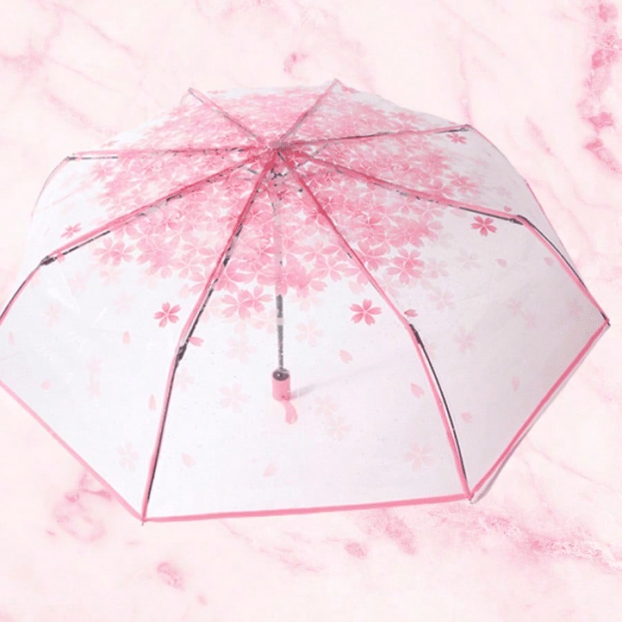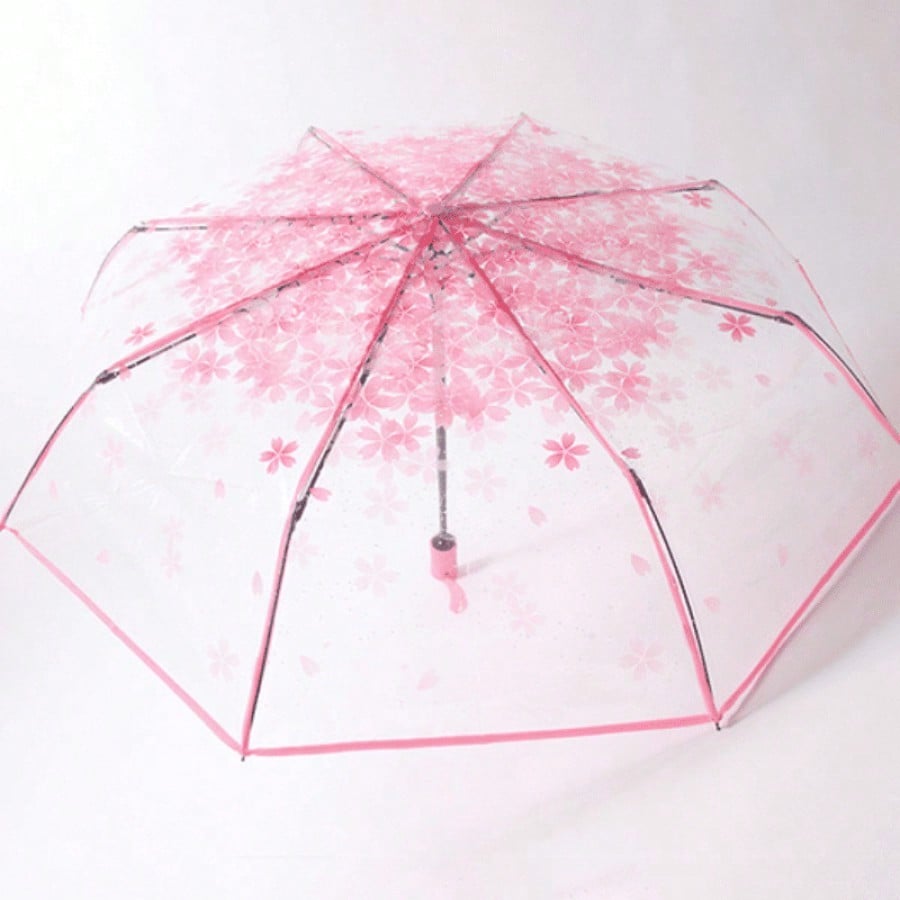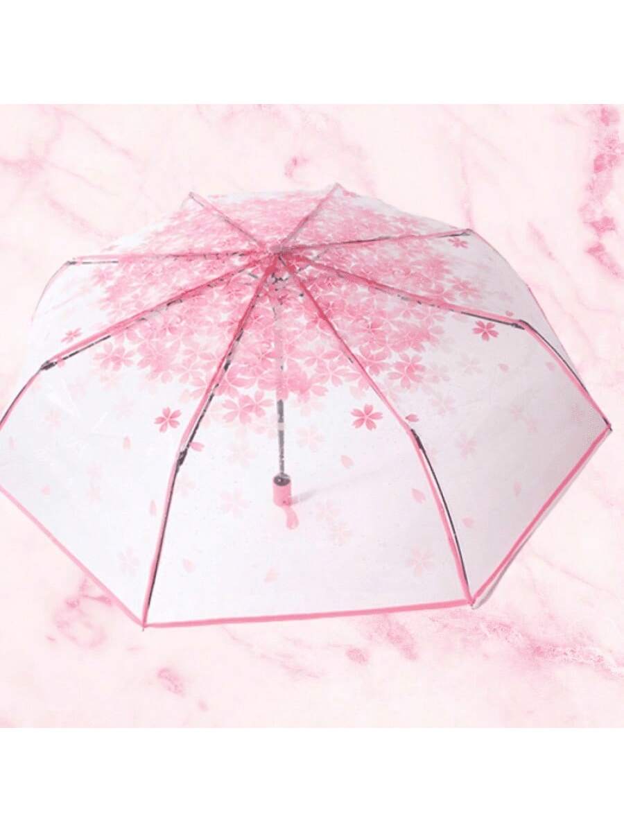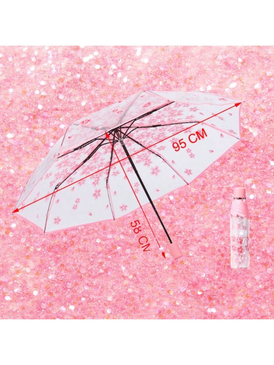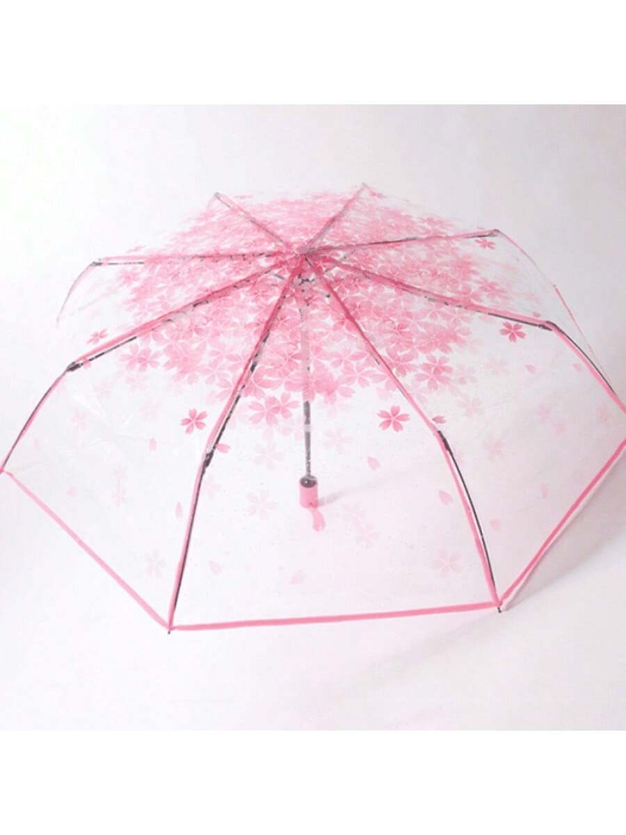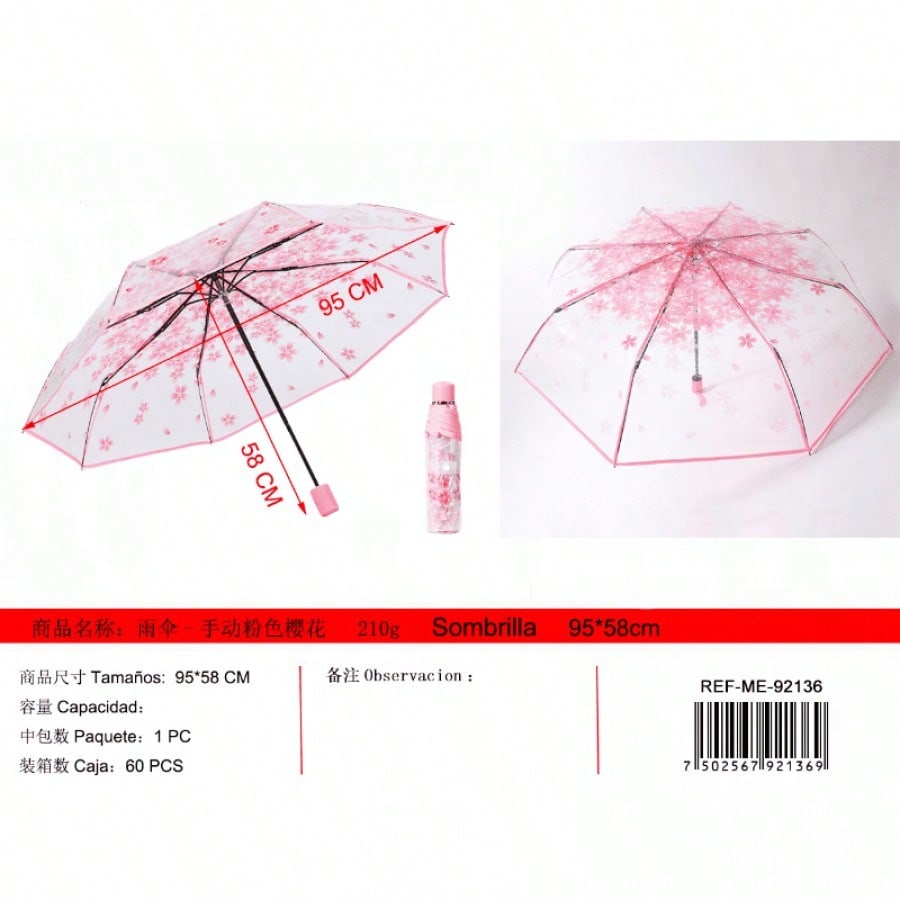 Paraguas manual con estampado floral de cerezo rosa. Diseño femenino y elegante que combina funcionalidad y estilo, protección básica contra lluvia con aspecto decorativo.