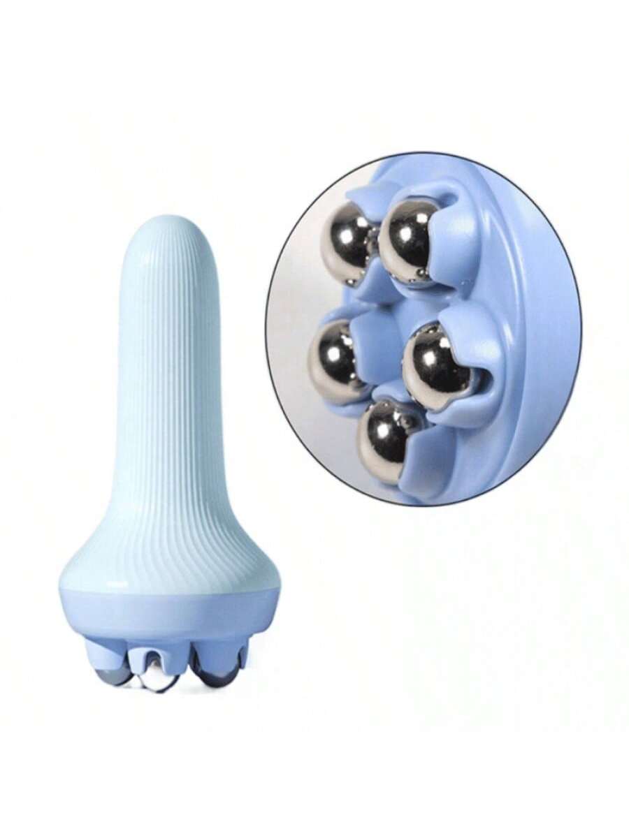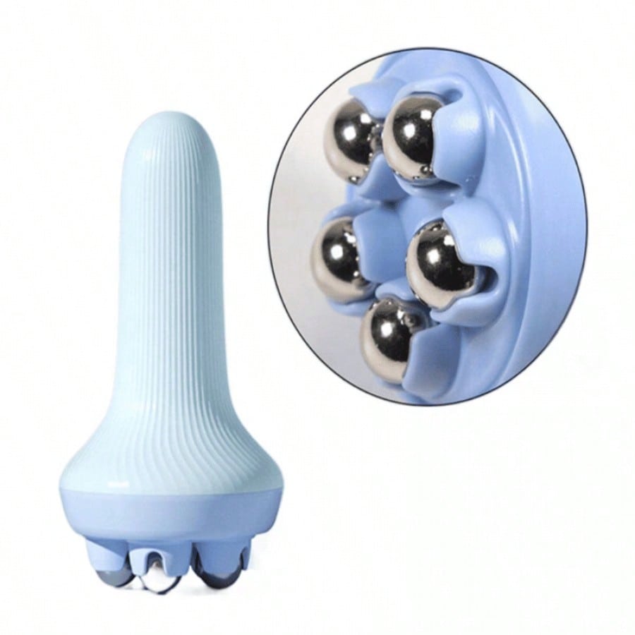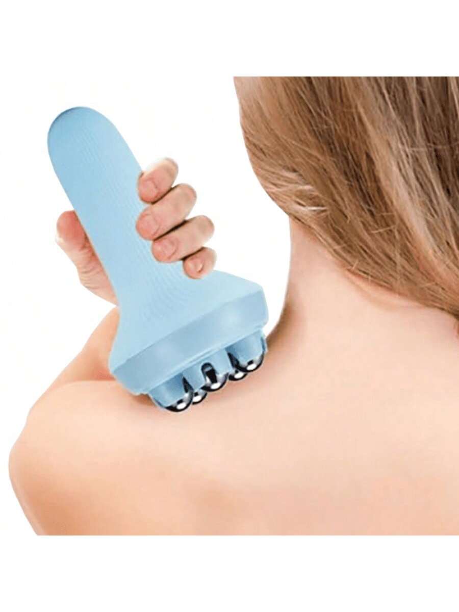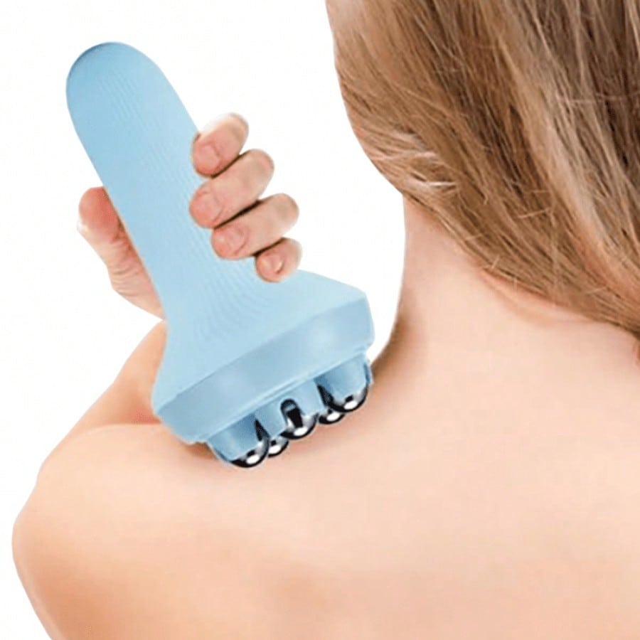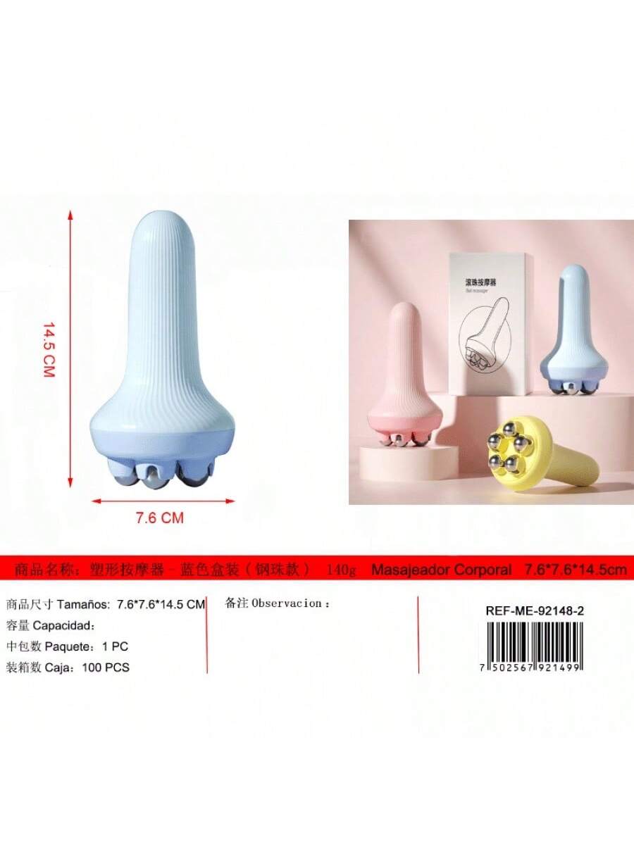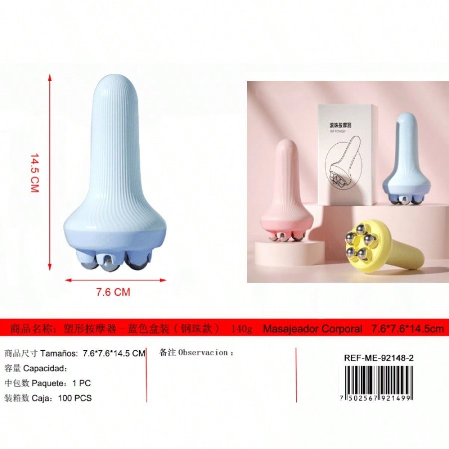 Masajeador moldeador caja azul con bolas de acero. Práctica herramienta para cuidado personal, múltiples aplicaciones en espalda, piernas y brazos, alivio inmediato de molestias.