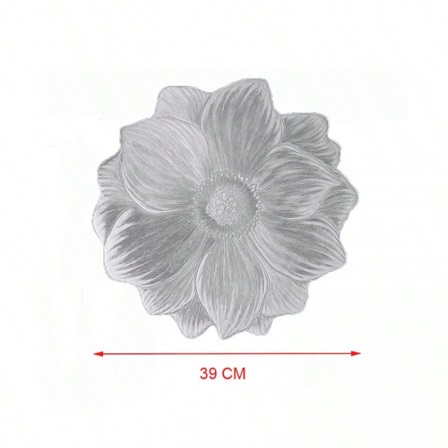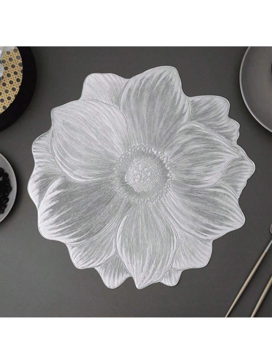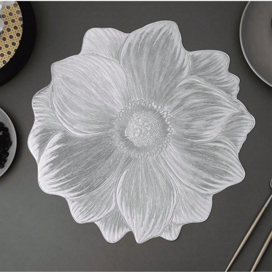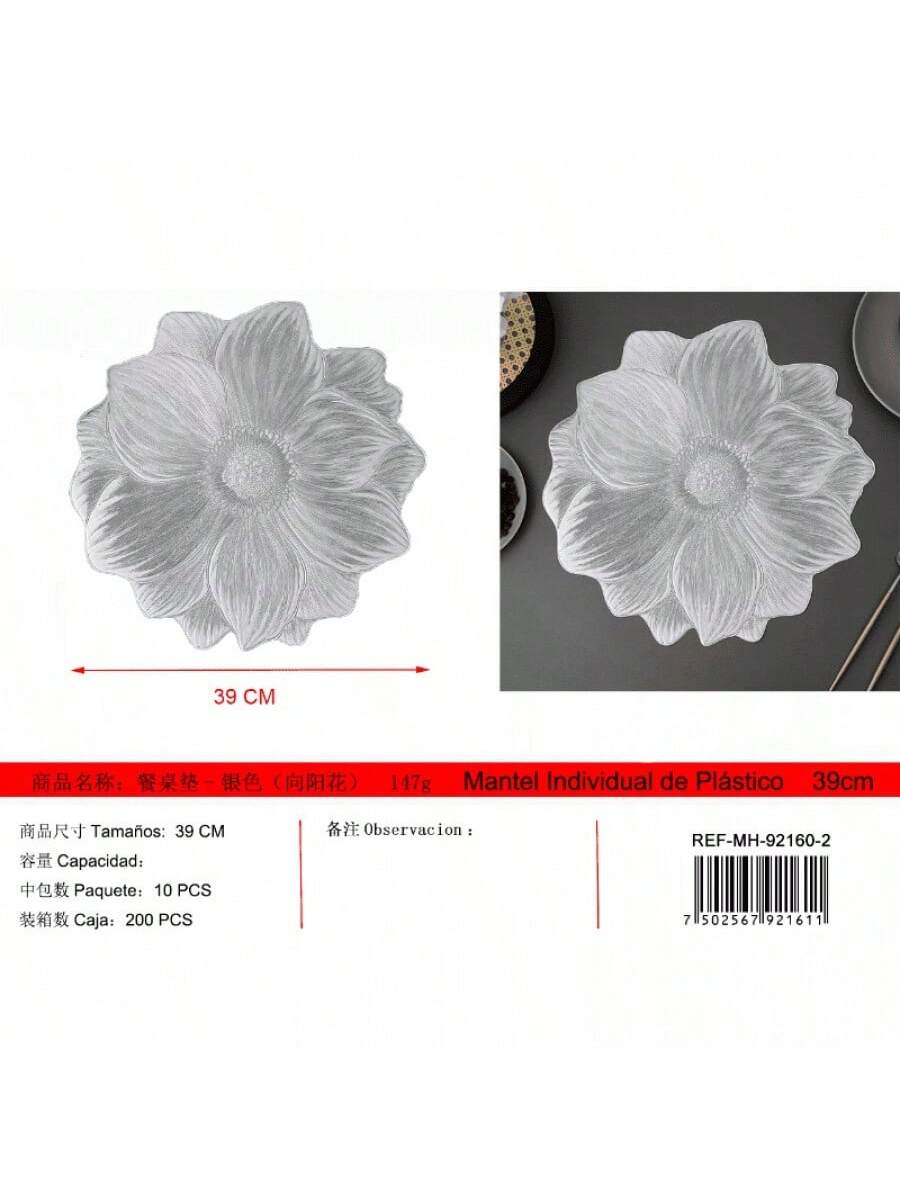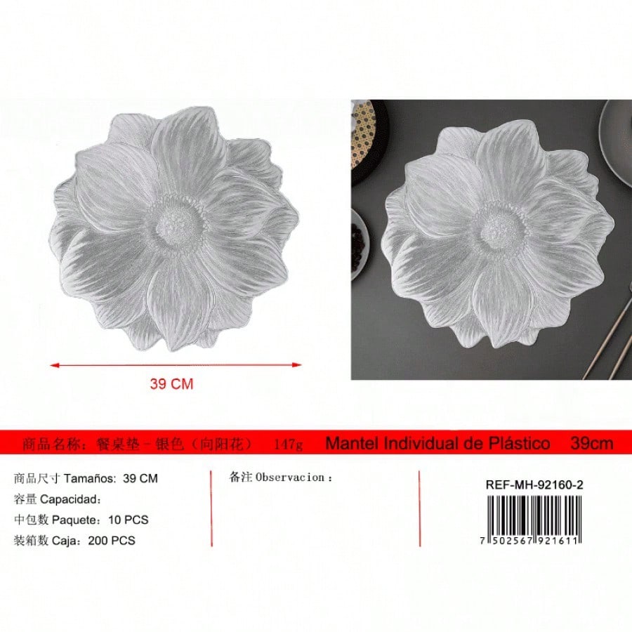 Mantel individual plateado con estampado de girasol. Combina funcionalidad y estilo en comedor, material resistente a manchas, ideal para comidas diarias y ocasiones especiales.
