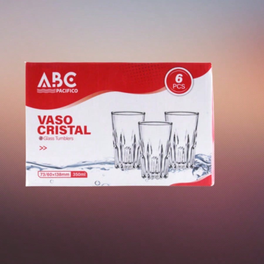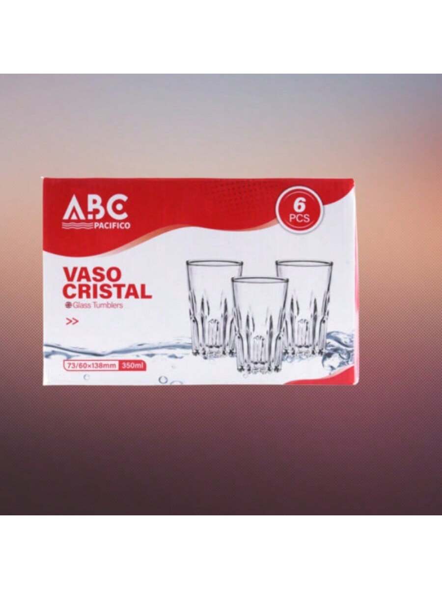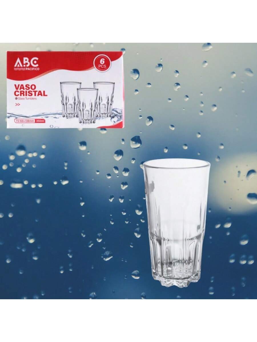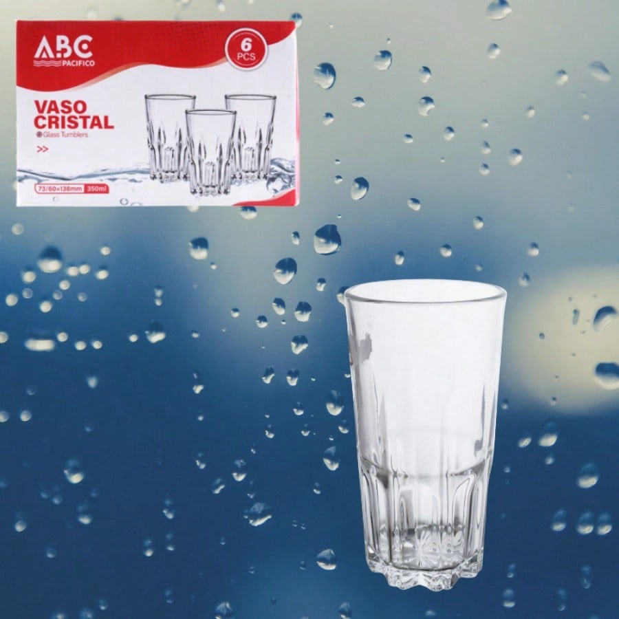 Set de 6 vasos de vidrio de 350 ml. Medida equilibrada para todo tipo de bebidas, vidrio templado que resiste cambios de temperatura y uso frecuente en hogares o restaurantes.