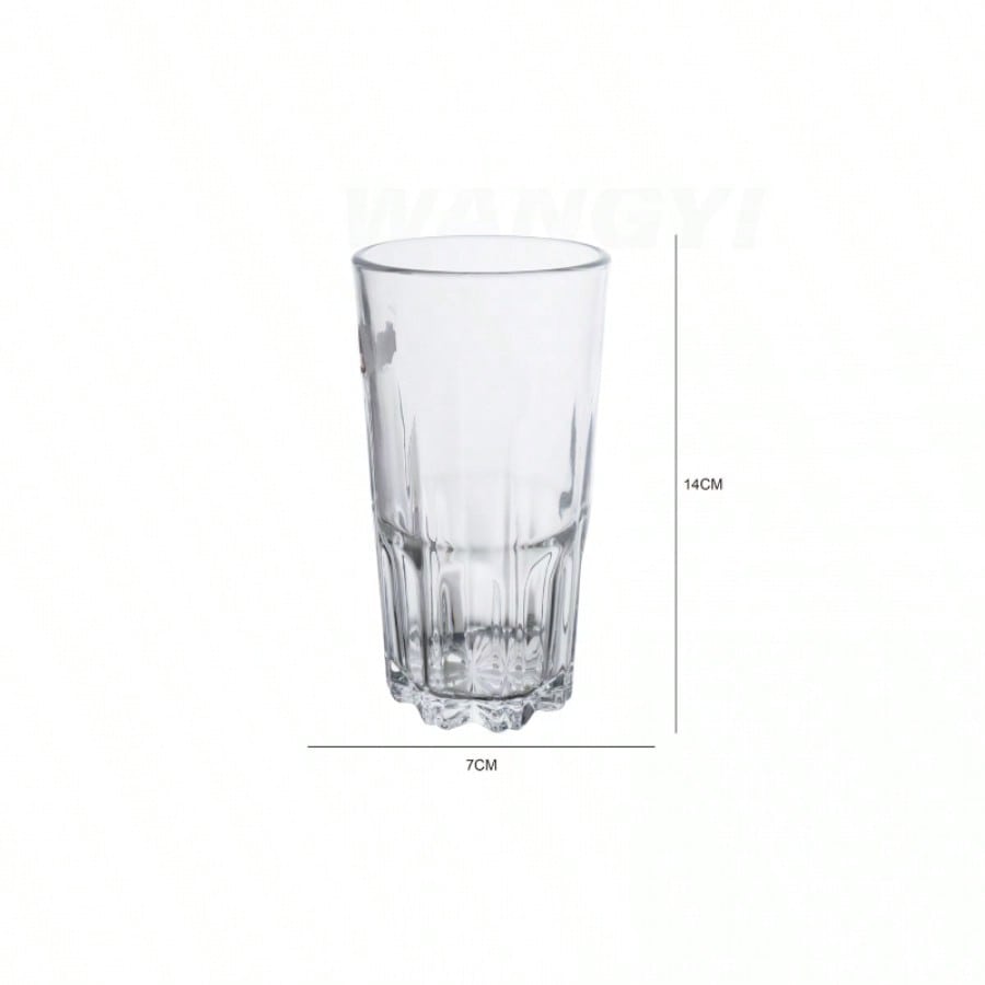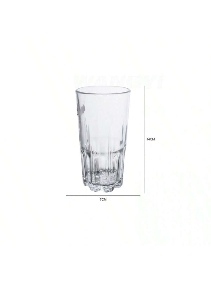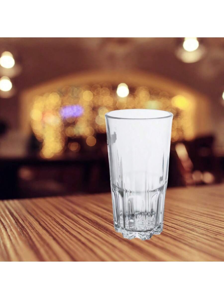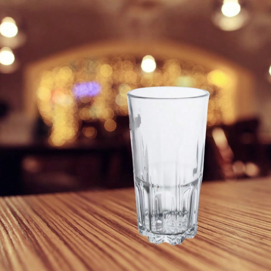 Set de 6 vasos de vidrio de 350 ml. Medida equilibrada para todo tipo de bebidas, vidrio templado que resiste cambios de temperatura y uso frecuente en hogares o restaurantes.