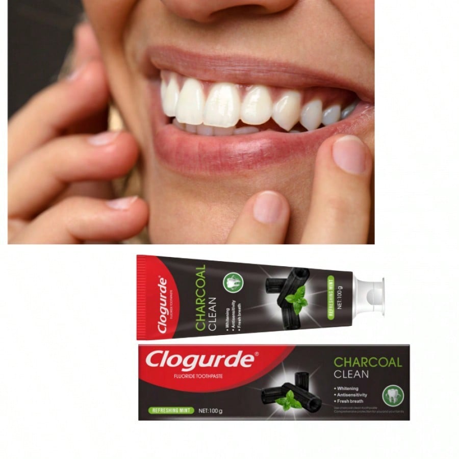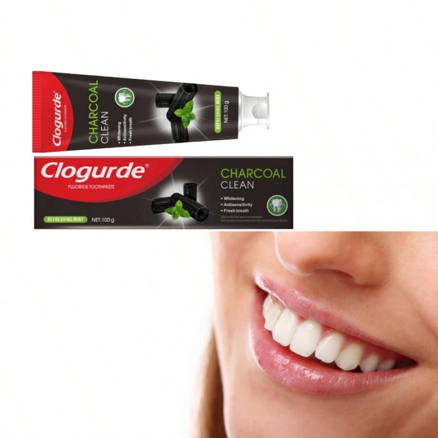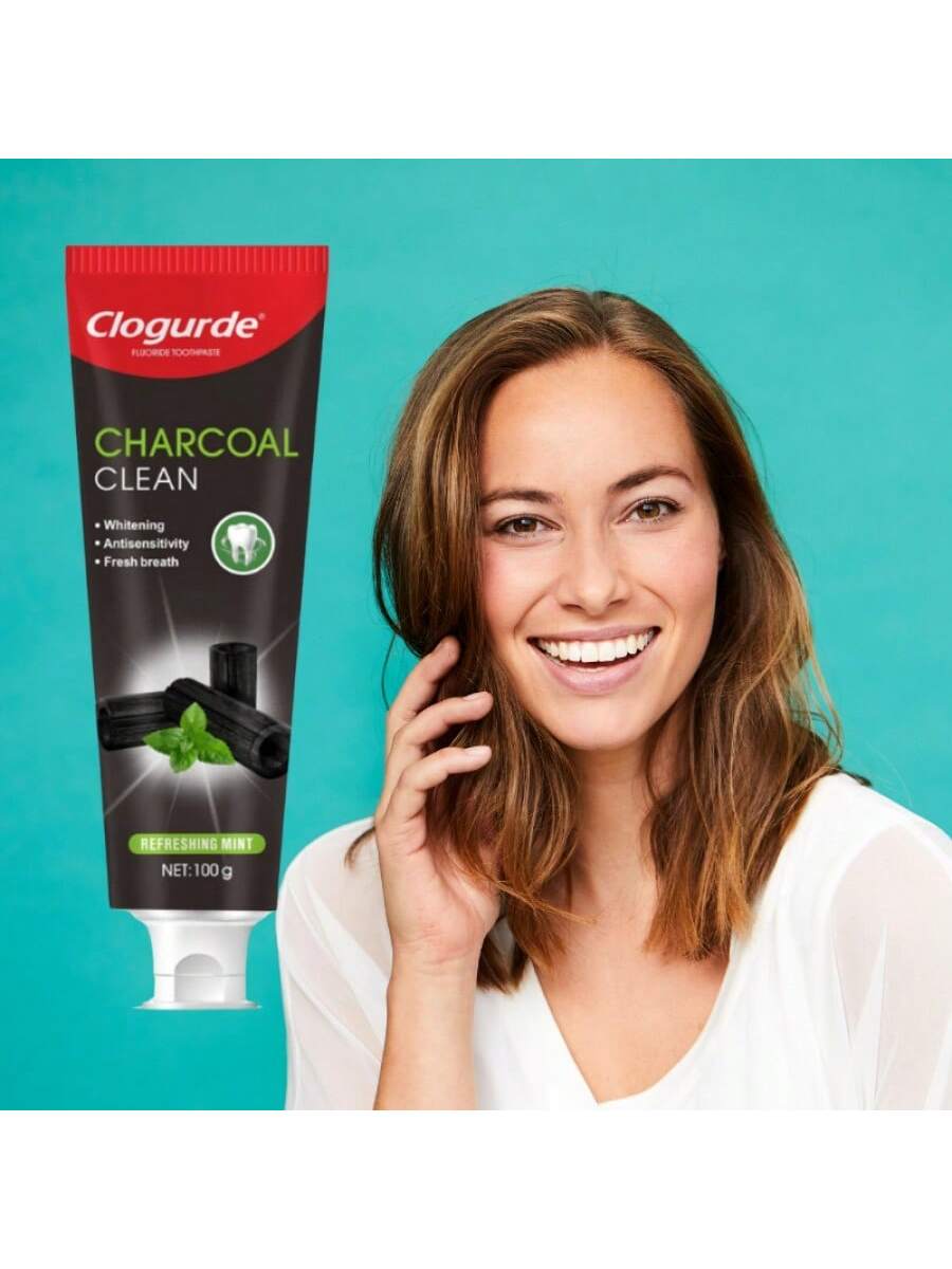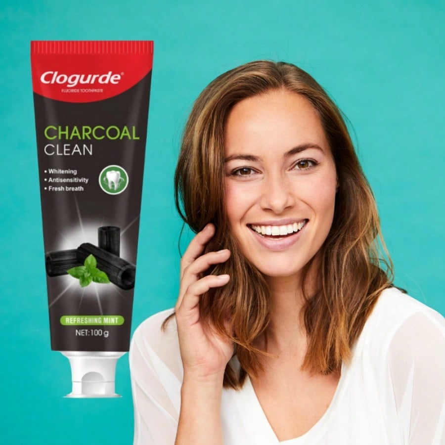 Pasta dental Clogurde 3009-1 blanqueadora y anticaries con carbón de bambú. Doble acción que remueve manchas mientras fortalece esmalte, protección completa en cada cepillado.