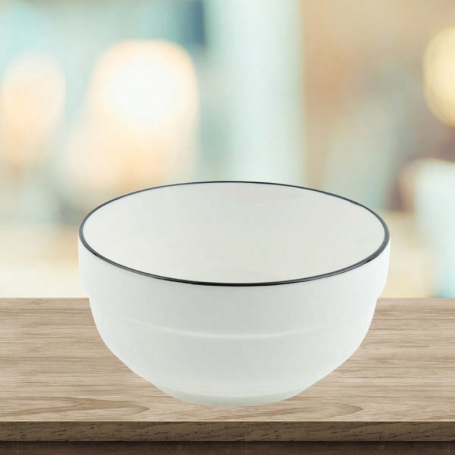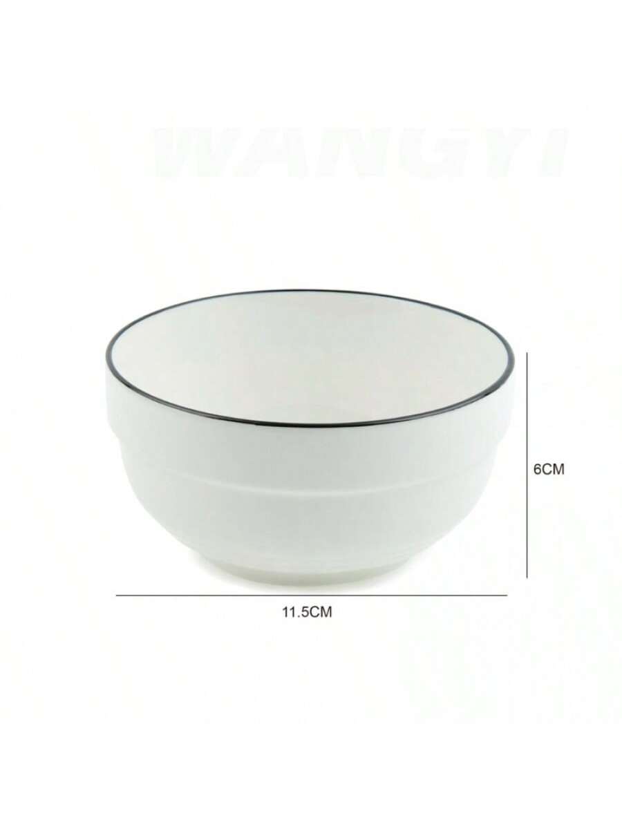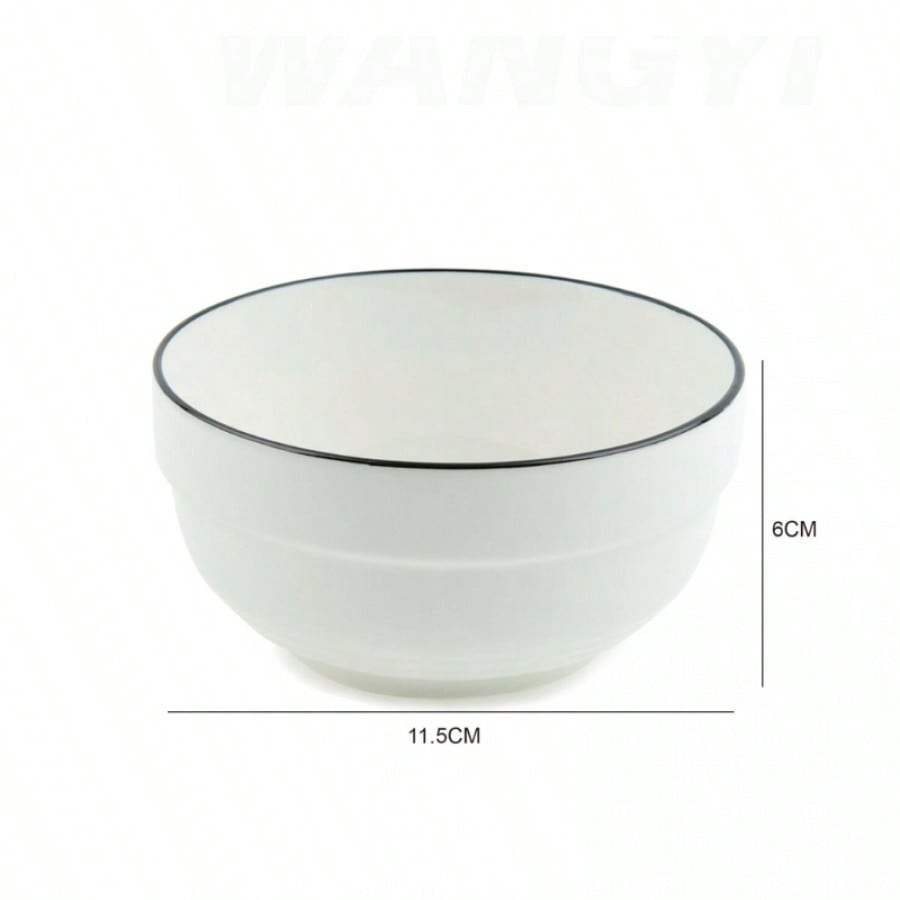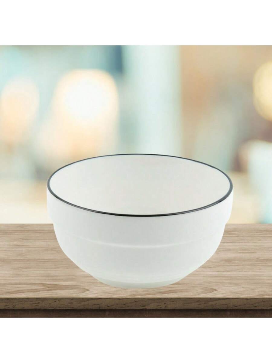 Cazuela blanca con borde protector 4.5 pulgadas y líneas negras, sencilla y duradera, antiquemaduras, material seguro, apta para microondas, ideal para comida doméstica.