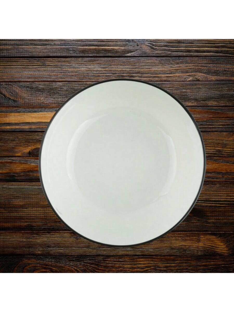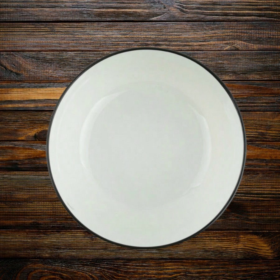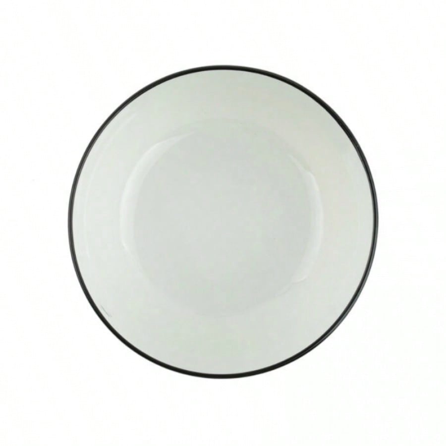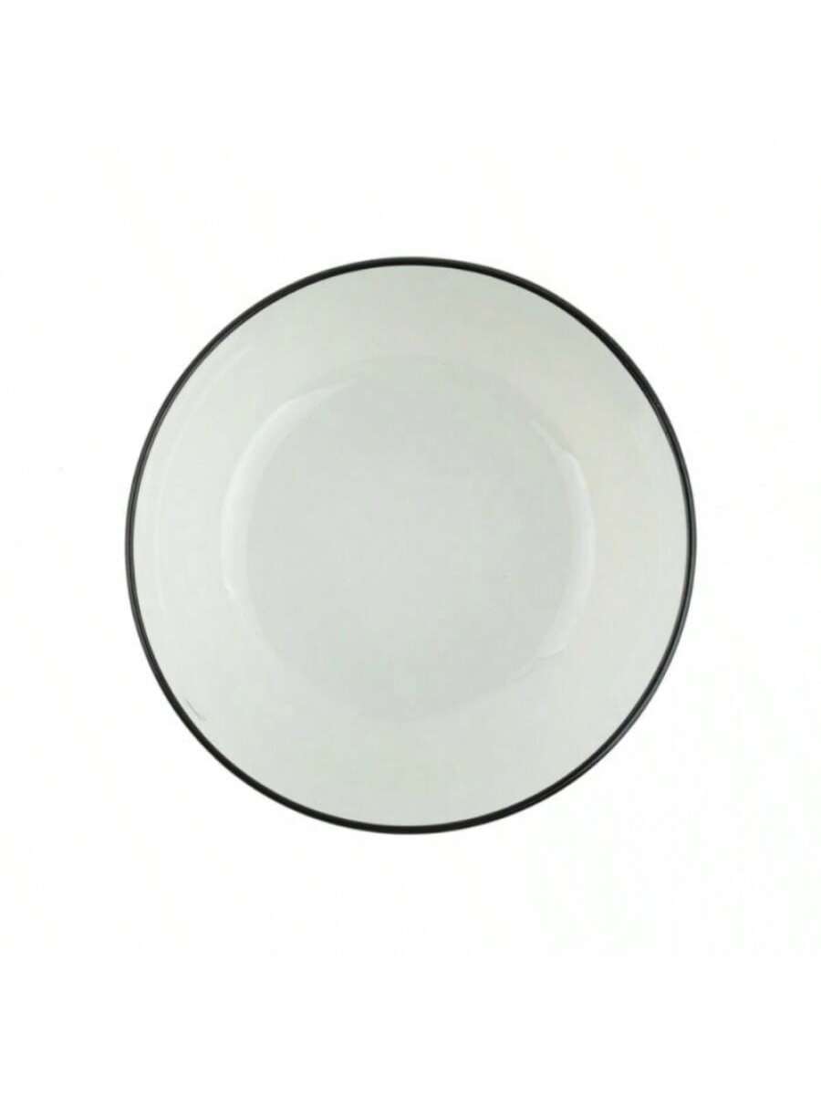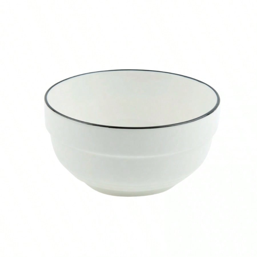 Cazuela blanca con borde protector 4.5 pulgadas y líneas negras, sencilla y duradera, antiquemaduras, material seguro, apta para microondas, ideal para comida doméstica.