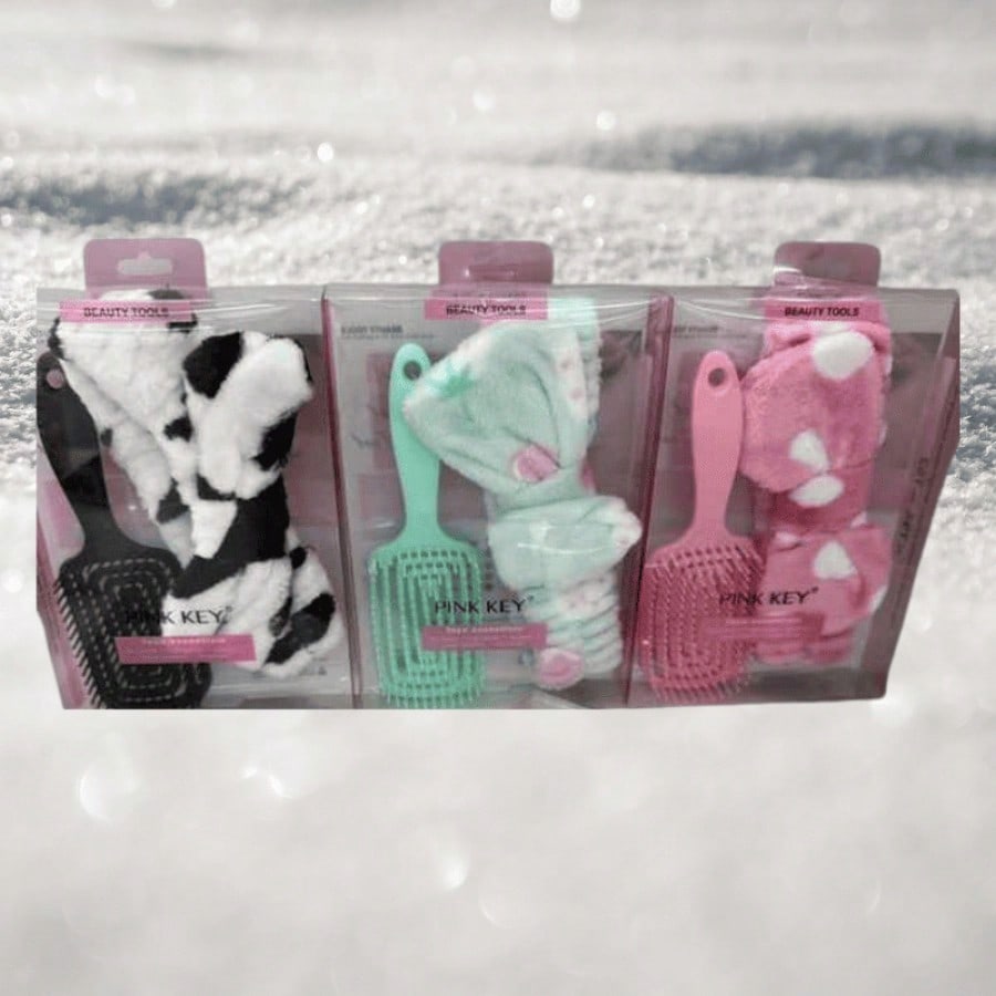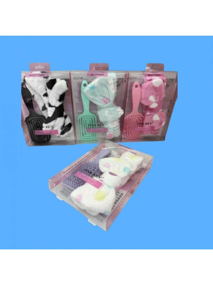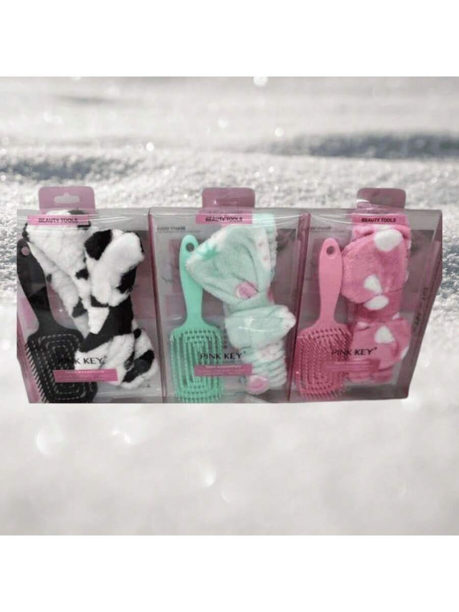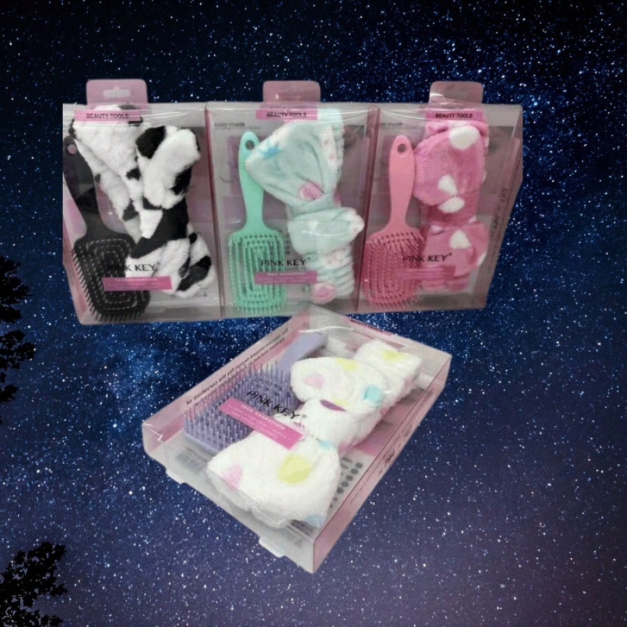 Kit que incluye diadema y cepillo para el cuidado capilar. Combinación práctica que facilita el peinado mientras mantiene el cabello controlado durante rutinas de belleza.