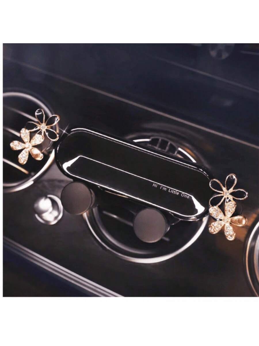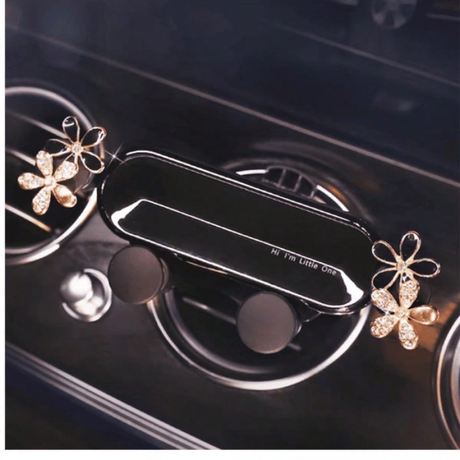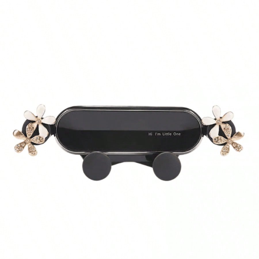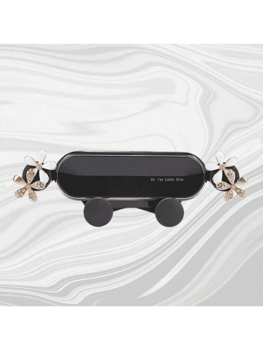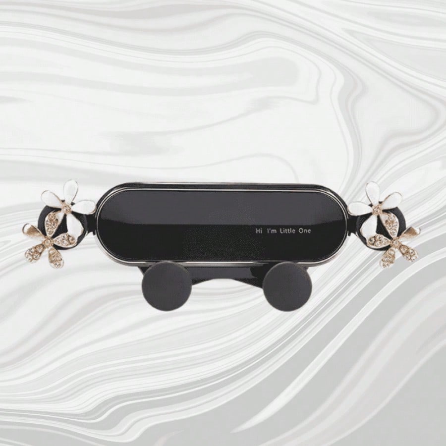 Soporte para coche en negro con un discreto estampado floral. Diseñado para sostener tu teléfono de forma estable en el salpicadero o la ventilación, permitiéndote usar aplicaciones de navegación de manera más segura y con un toque de estilo.