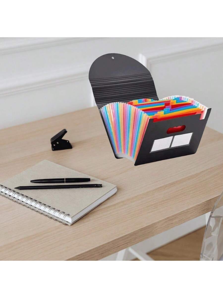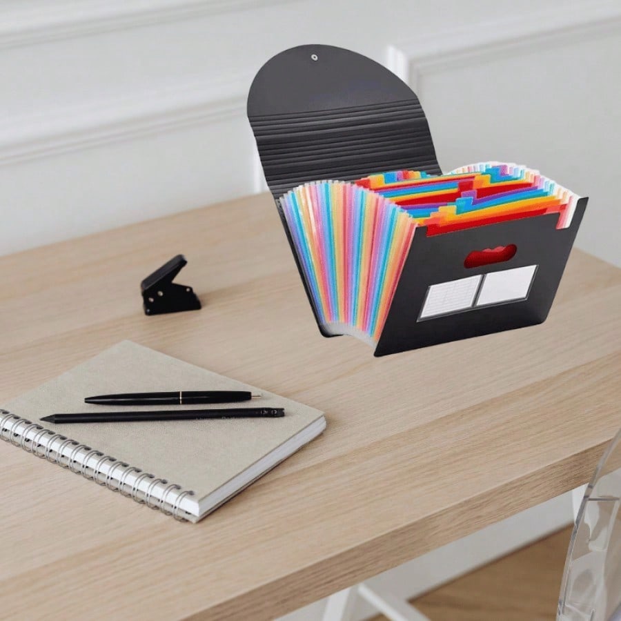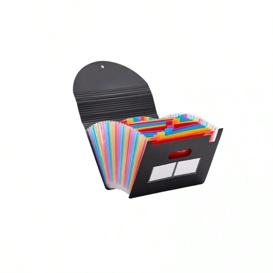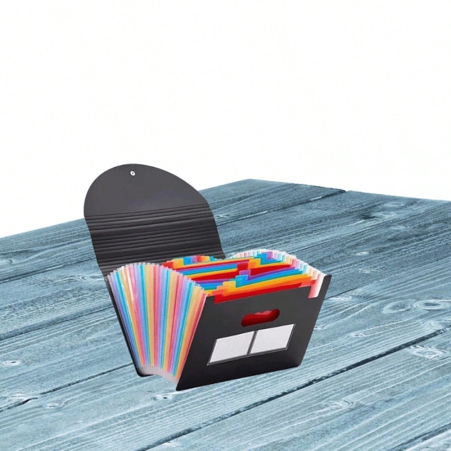 Organizador de documentos tipo acordeón con 25 compartimentos coloridos para una clasificación perfecta. Con costuras reforzadas y bordes encuadernados, es ideal para archivar facturas, recibos o documentos importantes de forma ordenada y accesible.