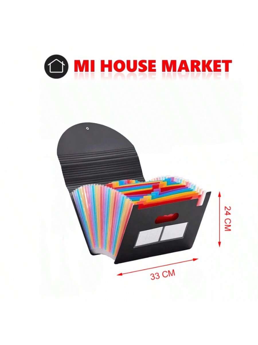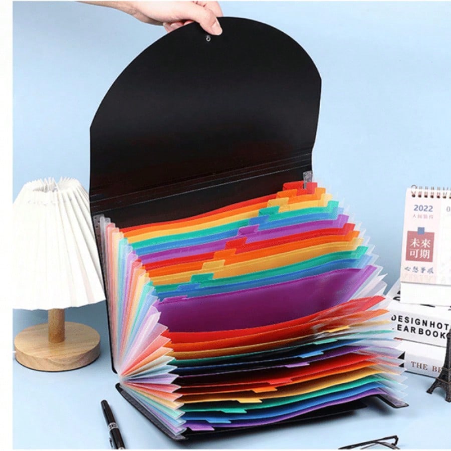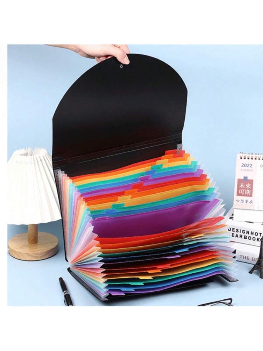 Organizador de documentos tipo acordeón con 25 compartimentos coloridos para una clasificación perfecta. Con costuras reforzadas y bordes encuadernados, es ideal para archivar facturas, recibos o documentos importantes de forma ordenada y accesible.