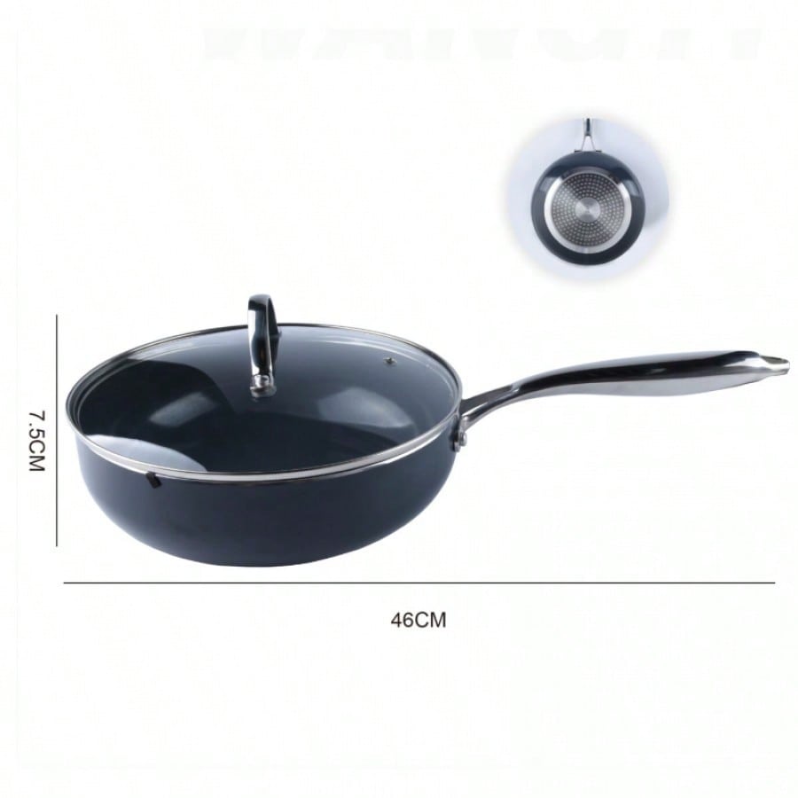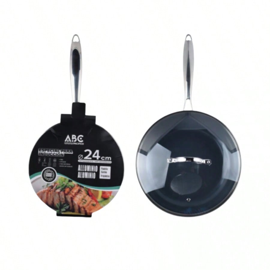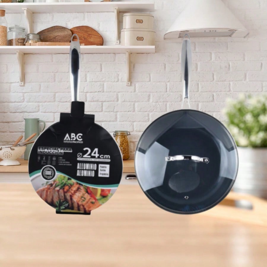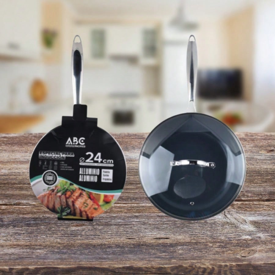 Sartén profunda estirada con tapa 24CM, diseño profundo suitable para freír, frito, estofar y cocinar, tapa retiene temperatura y frescura, material antiadherente fácil de limpiar, funciones completas para cocina diaria.
