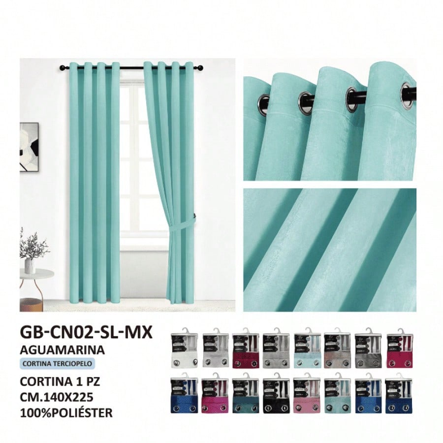 Estas cortinas de un refrescante color aguamarina están confeccionadas en tela GB de terciopelo, diseñadas para ofrecer una alta durabilidad y resistencia. Con dimensiones estándar de 140x225 cm, aportan un toque de frescura, luminosidad y elegancia serena a cualquier espacio. La textura aterciopelada y el tono acuático y relajante evocan calma y sofisticación, ideal para crear ambientes tranquilos y con estilo. Su fabricación garantiza una larga vida útil y un aspecto lujoso que perdura en el tiempo.