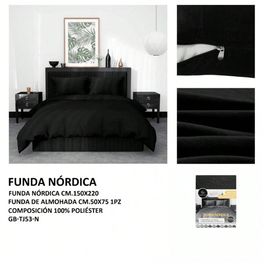 Este kit de funda nórdica monocromática, confeccionada en tela GB de un intenso y atemporal color negro, está diseñada para ofrecer una alta durabilidad y resistencia. Con dimensiones de 150x220 cm, es ideal para edredones estándar, aportando un toque de elegancia audaz, sofisticación moderna y un carácter distintivo a tu dormitorio. El tono profundo y versátil crea una atmósfera de contraste y misterio controlado, perfecta para integrarse en decoraciones contemporáneas, minimalistas o industriales. La calidad del tejido garantiza suavidad, fácil cuidado y una larga vida útil, asegurando confort y un aspecto siempre imponente y distinguido.